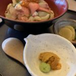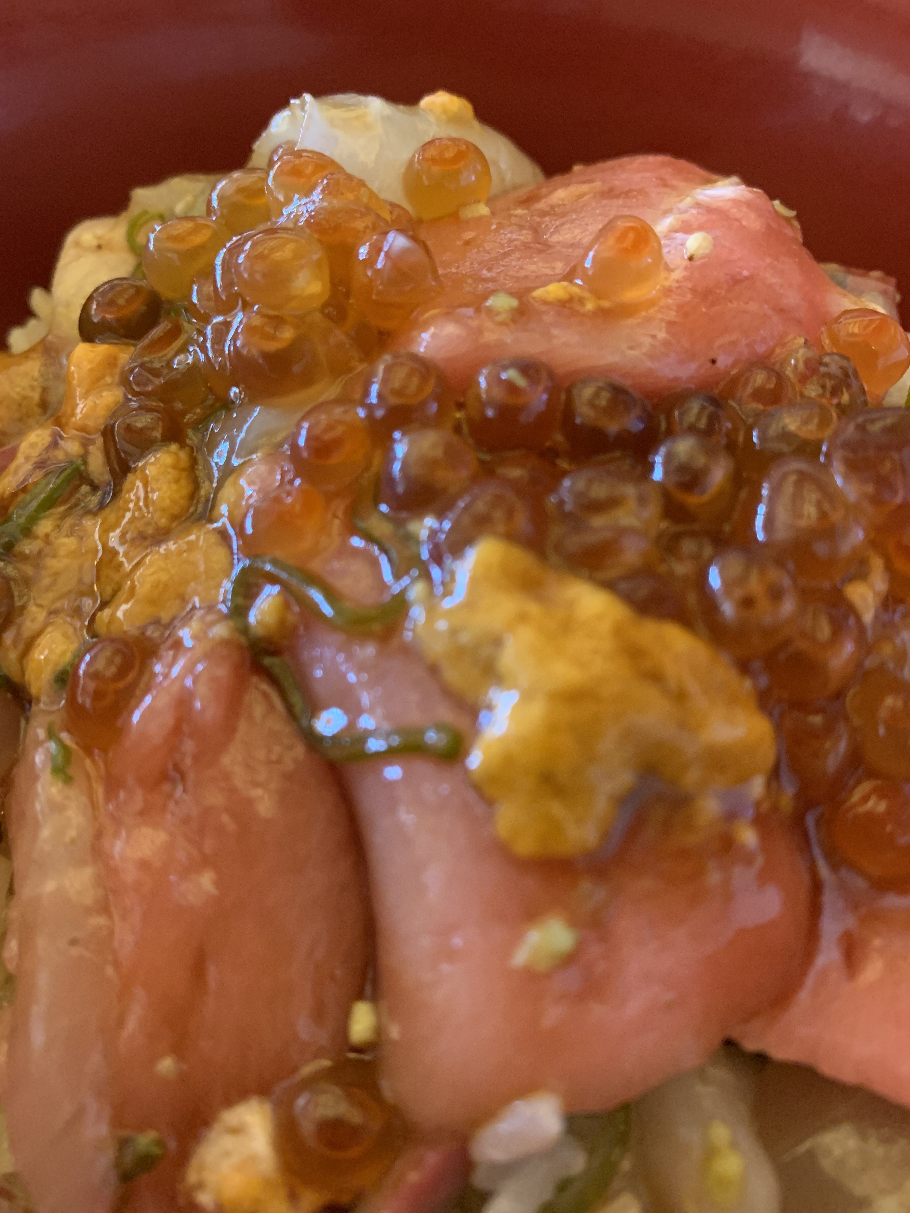 自粛規制もやや緩和されてきましたが、まだまだ余談が許されないコロナ禍です。家にじっとしているべきなのか、少しだけの接触を控えた外出ならいいのか考えた末、黒潮ダイニング伊勢花でのランチに行く事に決定しました。一時間近くのドライブで現地到着。人気の店なので待つ事は承知の上です。30分位の待機後に入店しました。何を食べるかは決まっているのですが、一応メニューに目を通します。海鮮丼か、海宝丼かで迷います。海鮮丼には活き車海老君が丼の上に載っています。食べる時に車海老君にとどめを刺さなければならないというこの行為がどうも苦手です。以前に鳥羽パールロード沿いの黒潮ダイニングで車海老君を嫁さんが捕まえようとした時、今が伊勢湾に戻れる最後のチャンスとばかりにピョンピョンと跳ねて丼から飛び出してきました。用意してあった醤油を入れてあったお皿にジャブンとダイブし、醤油は飛び散るはテーブルの上で跳ね回る車海老を捕まえるのに大変だった事がありました。ですので海宝丼にしました。海宝丼は新鮮なマグロ、タイ、イクラ、メカブなどが盛られた上に雲丹醤油をかけて食べます。新鮮な素材、これが、絶品なのです。海の幸が豊富な三重県に生まれて良かったと感じる瞬間です。何度も何度も「美味しいね。」です。至福の時間を過ごしました。