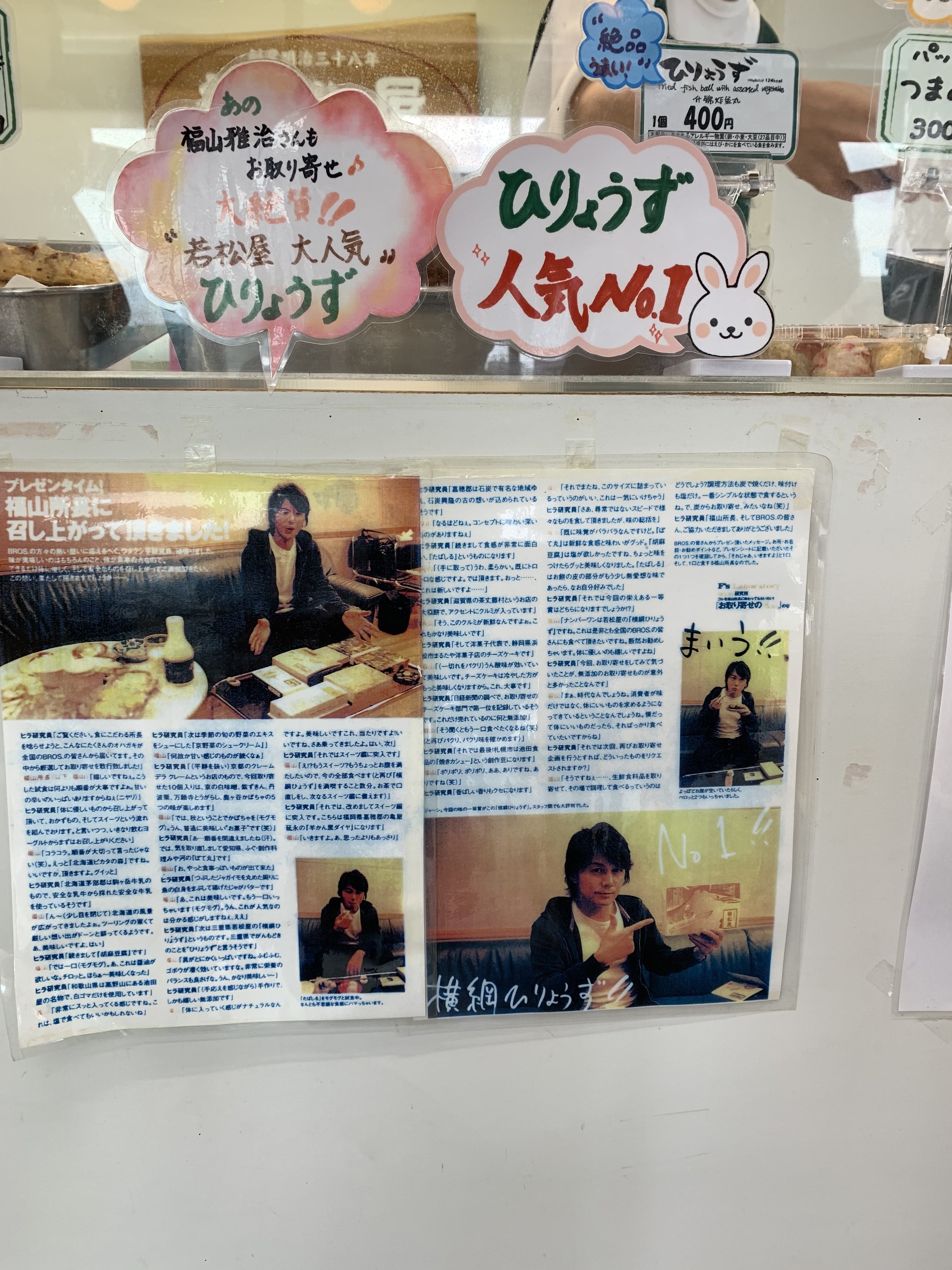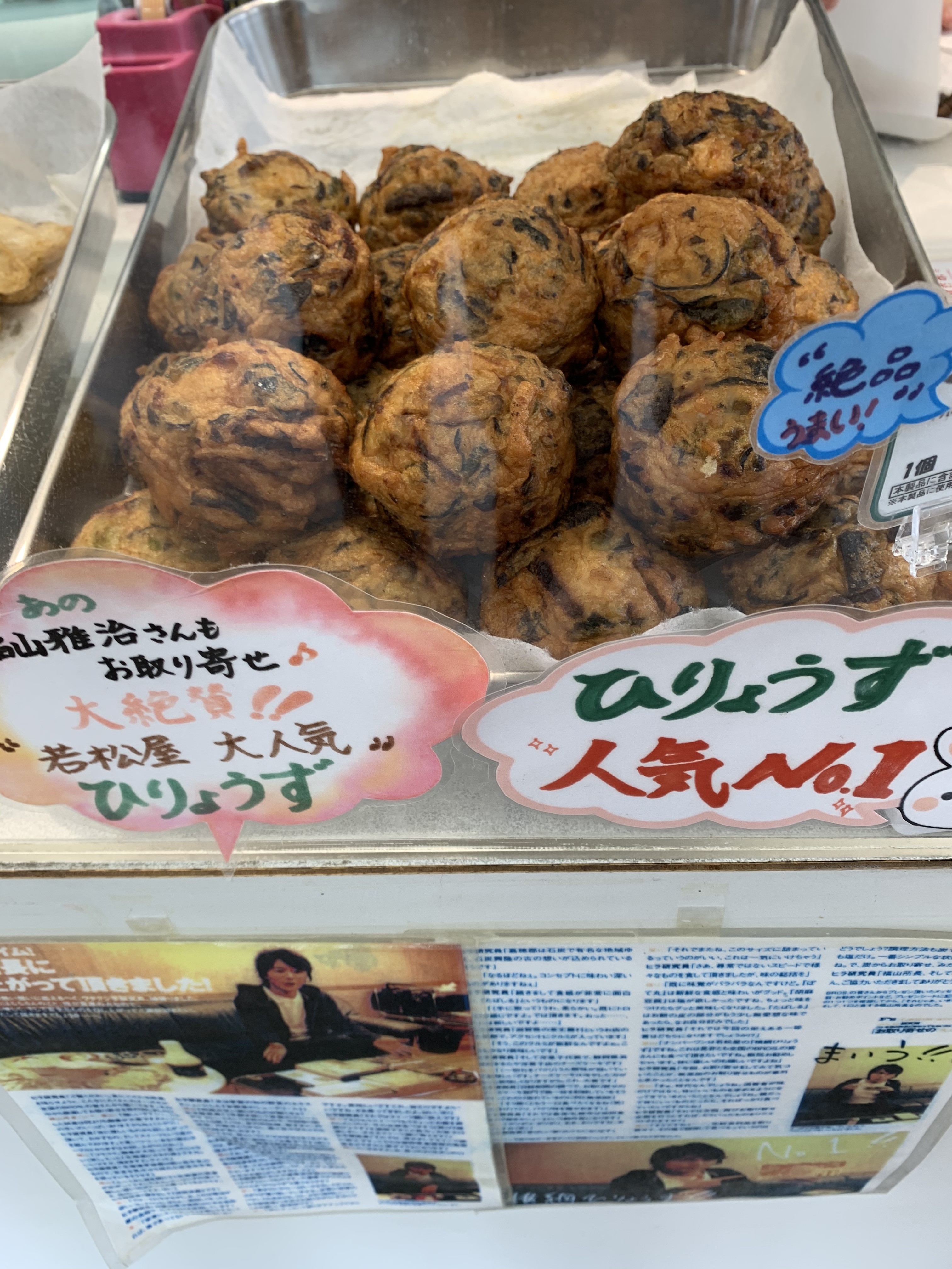 十分満足して帰路につきました。途中、へんば餅を買って帰るのが我が家の定番です。そして患者さんから、へんば餅の店の前の練り物屋さんも美味しいよの情報を確認すべく、『若松屋』さんに入りました。一押しは福山雅治さんお取寄せの『ひりょうず』を買いました。家に帰り夕食に食べました。もちろん、福山雅治のモノマネをしながら「あんちゃん、小雪、ひりょうず美味しいね。福山です。」榮家でも御用達の店が一つ増えました。