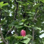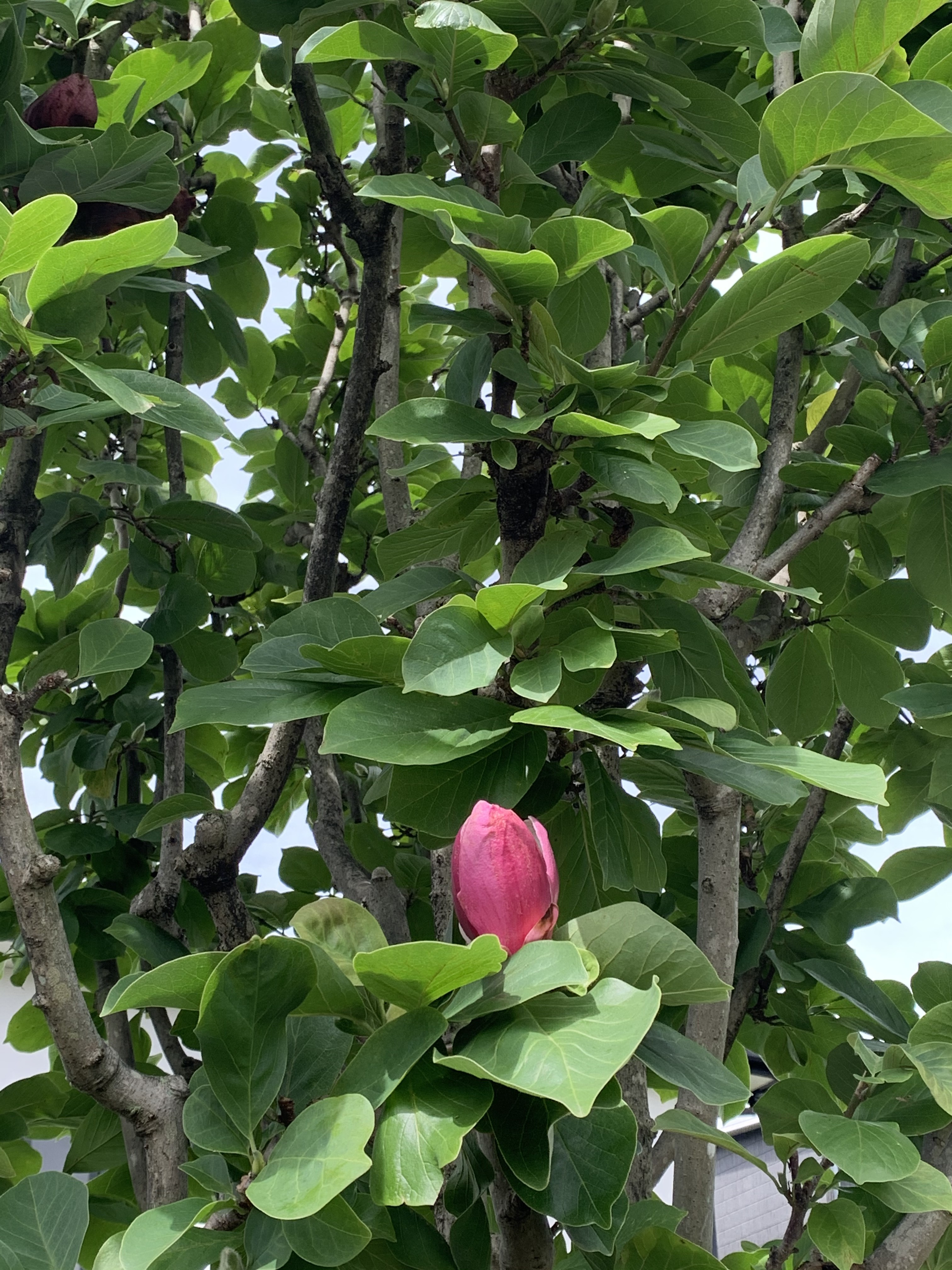 梅雨の中休みの晴れた☀️日になりました。なぜか、木曜日の休診日は早起きをしてしまいます。am 5:00には目が覚めて、二度寝をしようとトライするのですが眠れません。モーニングコーヒー☕️を煎れて新聞📰を熟読します。ゆったりとした静かな時間を過ごします。庭の家庭菜園のトマト🍅の尻ぐされ病もカルシウム噴霧とカルシウムの追肥の効果が現れたのか、綺麗なお尻になったトマト🍅が収穫できるようになりました。茄子🍆、ピーマンも順調に収穫できています。虫除けスプレーを噴霧して収穫用のハサミを持ち✂️畑に出ます。しかし食欲旺盛な蚊たちは、彼等の好物であるO型の私の血液🅾️を求めて襲いかかります。スプレープロテクトされていない部分を狙ってきます。耳元に『ぷ〜ん』と聞こえてきます。子孫繁栄の為に命がけで接近してくるメスの蚊🦟の特攻隊精神には頭が下がりますが、刺された後のアノ痒さはたまりません。そんな蚊の攻撃を受けながら収穫をしました。野菜の収穫後は連日の雨で元気に伸び伸びになった芝を刈りました。何せ東京ドーム3個分の広さの庭ですので芝刈りは大変でした。汗💦かきながら、体重が減るのを期待しつつの作業は熱が入ります。綺麗に手入れされた芝生の庭を達成感と共にしみじみと見ていた時に、木蓮の花が咲いている事に気がつきました。木蓮の開花時期は4.5月です。季節外れの木蓮の赤い花にびっくりしました。
