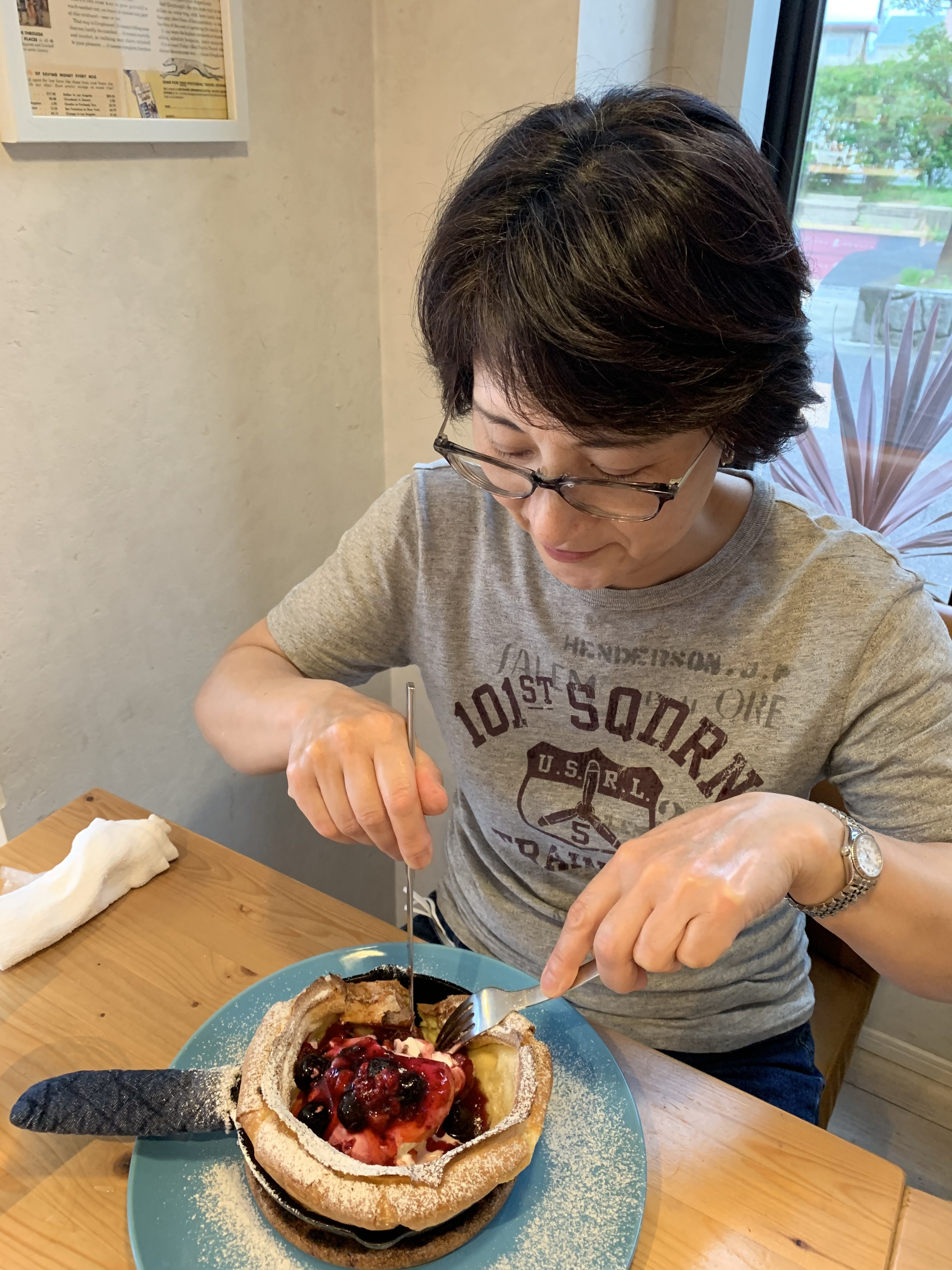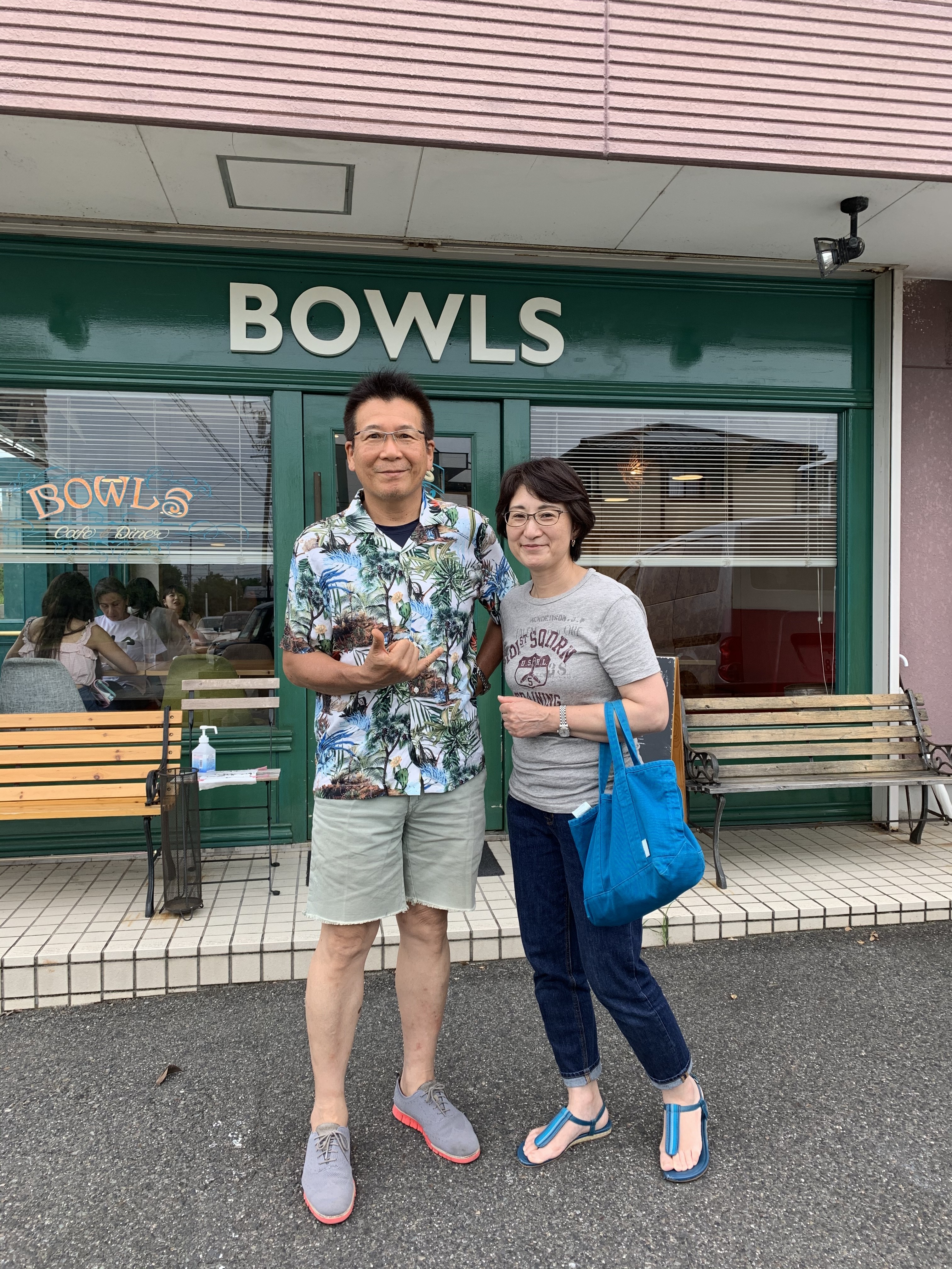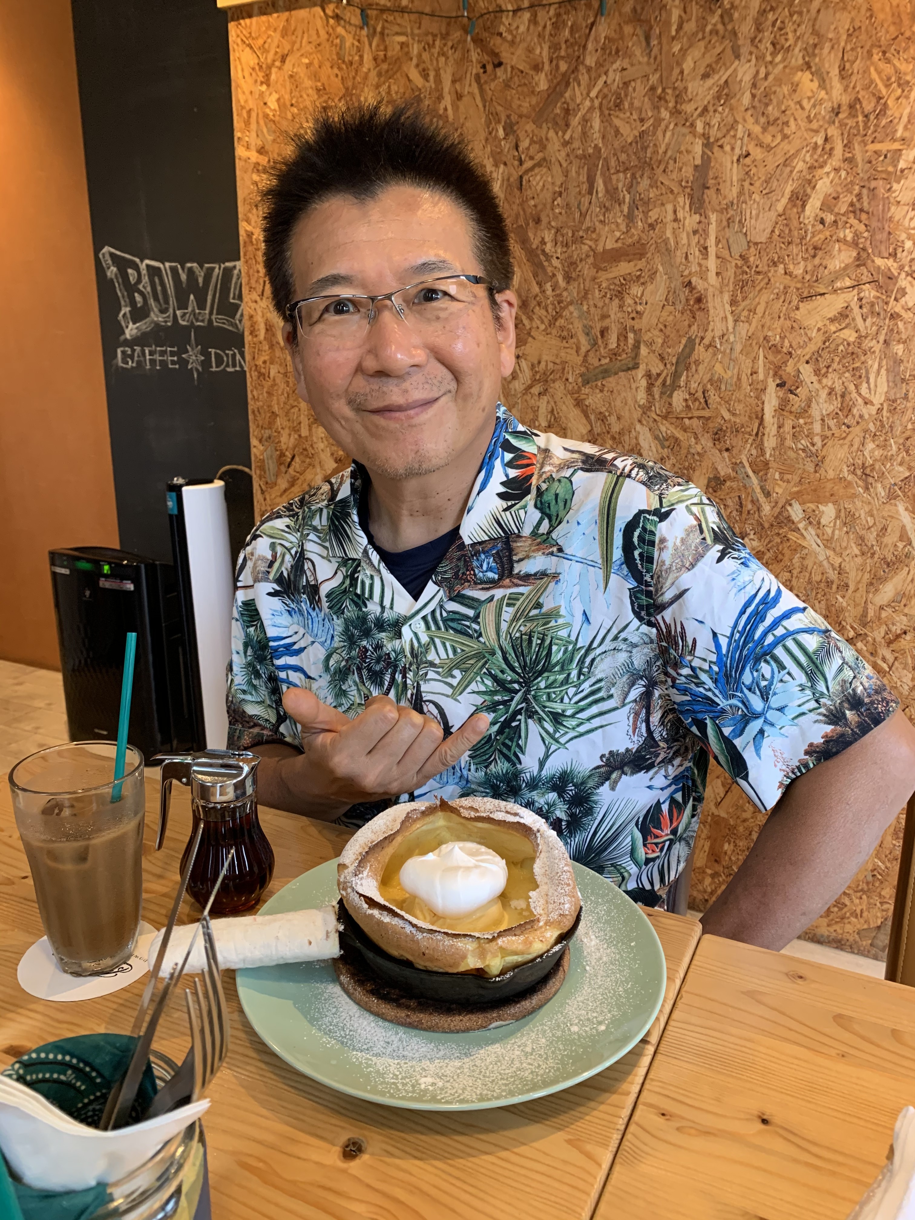 お洒落なお店を発見しました。鈴鹿市西条町の『BOWL s cafe&dinner』です。先日、嫁さんがママ友会でランチをしてきたお店です。ママ友会から帰ってきて直ぐに、「今度、みんなで行こうよ。いいお店見つけたよ。」と。早速、ウチのスタッフに聞いてみるとお洒落で美味しいですよの情報を仕入れました。「オッケーグーグル。西条、ボールズ、パンケーキ」と、なんでも知ってる私のiPhone XSに聞いてみるとBOWL sのホームページが出てきました。絶対行きたいの衝動に駆られました。そして、とうとうその日を迎えました。ランチタイムの時間をずらして、pm4:00に行きました。2組待ちでしたが15 分位で入店出来ました。ハワイの街角にある様なお洒落な建物です。嫁さんと娘の3人で行きました。お目当てはパンケーキ🥞です。それもダッチ・ベイビー・パンケーキ🥞です。これが変わった形のパンケーキなのです。事前にホームページやグルナビなどで情報は収集済みです。でも、写真で見ても味までは想像できません。今日確認するのです。メニューを熟読し、3人違う種類のパンケーキ🥞をシェアする事を約束して注文しました。私はシンプルにメイプルバニラ、嫁さんはベリー・ベイビー、娘はチョコバナナにしました。ダッチベイビーパンケーキはオーブンで焼き上げたドイツ風パンケーキの事らしいです。ですので、焼き上がるまで15分位かかる様です。待っている時間のワクワクタイムがたまりません。しばらくすると、甘い香りが漂ってきました。期待度メーターはMAX振り切れました。「お待たせしました。」熱々のフライパンの様な鍋(スキレット鍋と言うそうです。)でやって来ました。私は、別に用意されたメイプルを注ぎ込みます。ベリー・ベリーと、チョコバナナも登場です。パイ🥧の噴火口の中に、各々の具材が入っている感じです。外側はカリッとした感じで底の方は若干厚みがあり、もっちりしています。独特な食感です。美味しーい‼️でました。美味すぎちゃん。3種類の味を堪能しました。今度来る時は、さかえ歯科のスタッフと一緒に来る事を福利厚生委員長(嫁さん)と決議決定しました。