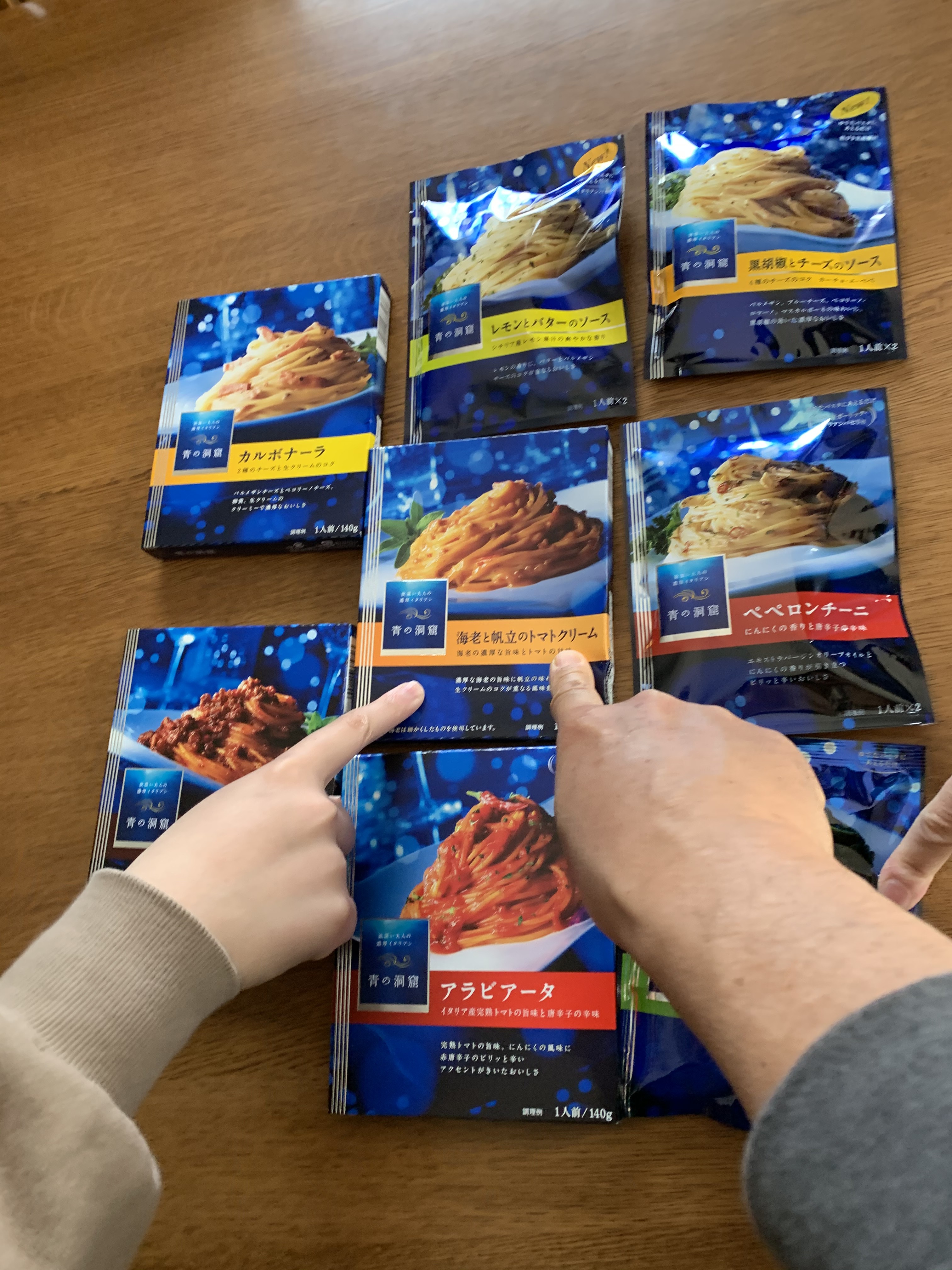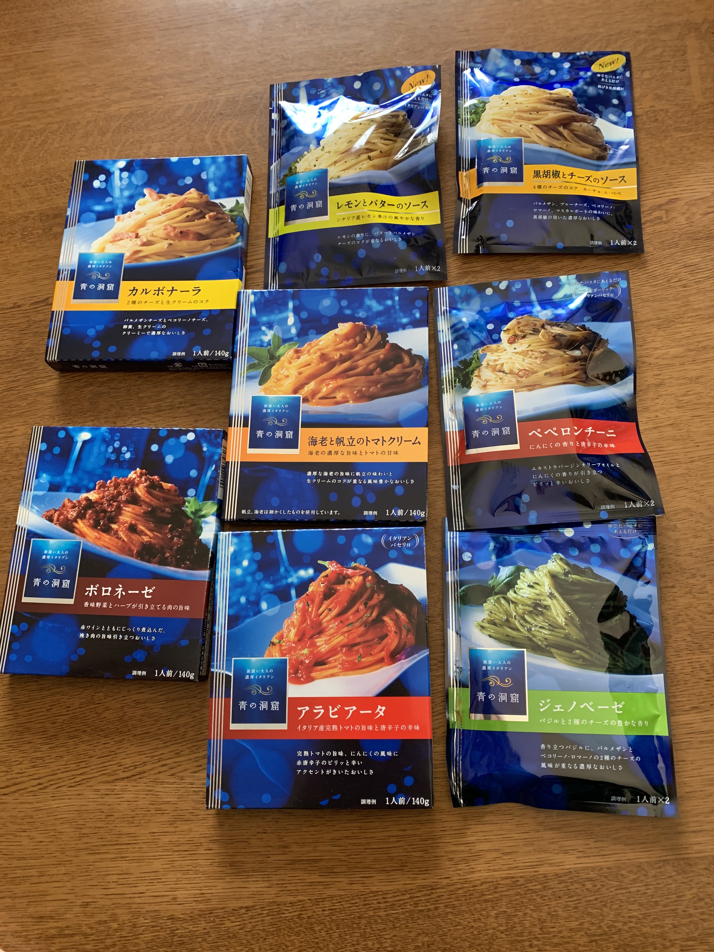新型コロナウイルス🦠感染拡大防止策として、不要不急の外出を控える様に日本中が頑張っています。そこで我が家では長期化が予想されるステイホーム🏠生活を、如何に充実した物にするかを考えています。そこで考え出した第一弾、普段やれない事をやってみよう。日清フーズのパスタソース『青の洞窟』シリーズを食べ比べてみよう、です。『青の洞窟』は定価300円位する少し高級なパスタソース🍝です。一度食べてみたいと以前から思っていました。外出自粛の為、Amazonさんで、『青の洞窟9種』を注文しました。届けられたパッケージはやはり高級感があり、食卓の上に整列したその姿は感動的でした。早速、誰が、どのパスタソースを食べるかになりました。今回の選択方は少しスリリングにかつ、ドラマティックな展開と刺激を求めて「セーノ」で指差して決定する方式を取りました。決定の時間までの少しの間、4人の駆け引きがありました。「お母さんは、チーズが苦手だからカルボナーラを棄権するから、ジェノベーゼにしようかなぁ。」とか、「お父さんは、ニンニク🧄が苦手だからペペロンチーノを棄権するから海老と帆立のトマトクリームクリーム🍅。」とか。心理戦が始まりました。まるでプロ野球⚾️のドラフト会議みたいです。サァ、運命の時間、ジャッジメントタイム‼️「セーノ」仲良し家族ですが、この瞬間だけは己を譲る事は出来ません。真っ直ぐに伸ばされた人差し指は、己の欲望を満たす方向に向かって一直線。「コレッ❗️」私と次女は、海老と帆立のトマトクリーム、嫁さんと長女はジェノベーゼ。まさかの展開でした。松坂大輔を8球団同時指名。代表同士で特別選択法で決める事になりました。『rock,paper,sissors』「ジャンケンポン✊✋✌️」ドラゴンボールの悟空ならカメハメ波が出るくらいの凄いのが出ました。大盛り上がりでした。私はカルボナーラ、嫁さんはジェノベーゼ、長女は黒胡椒とチーズ、次女は海老と帆立のトマトクリームとなりました。それぞれのパスタソース🍝のスパゲティを食べながら、お互いの違うソースを少し譲ってもらい味を確認しました。高級レトルトパスタソースのクオリティの高さに感心したのと同時に、我が家が『本格パスタ工房青の洞窟』になりました。