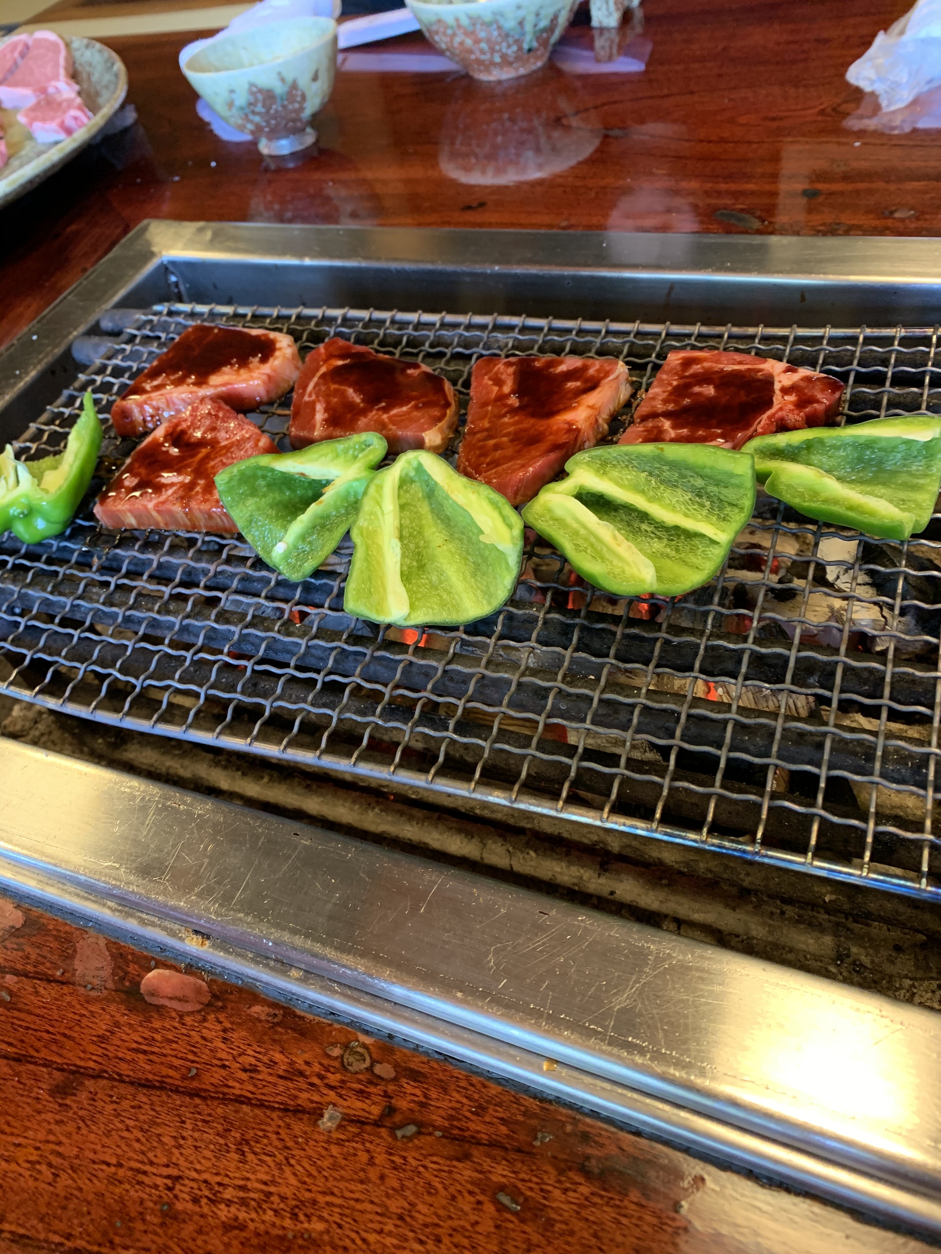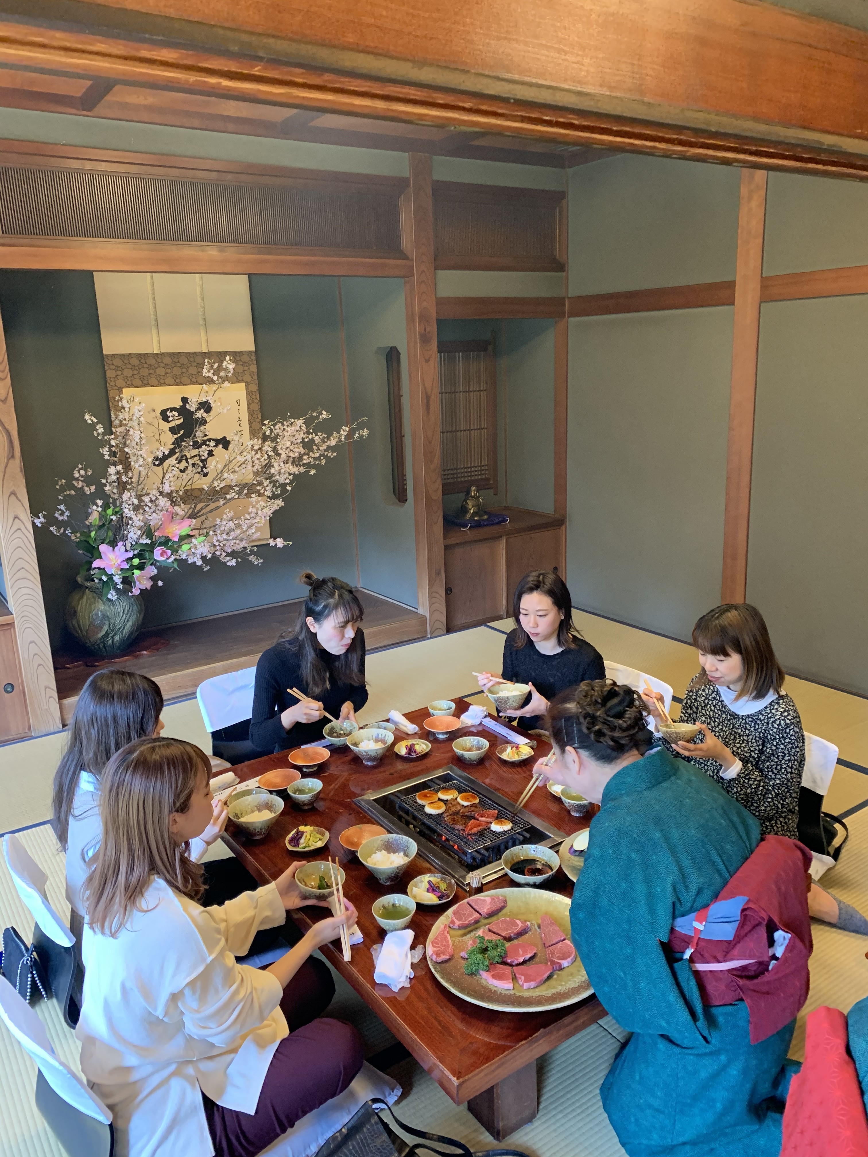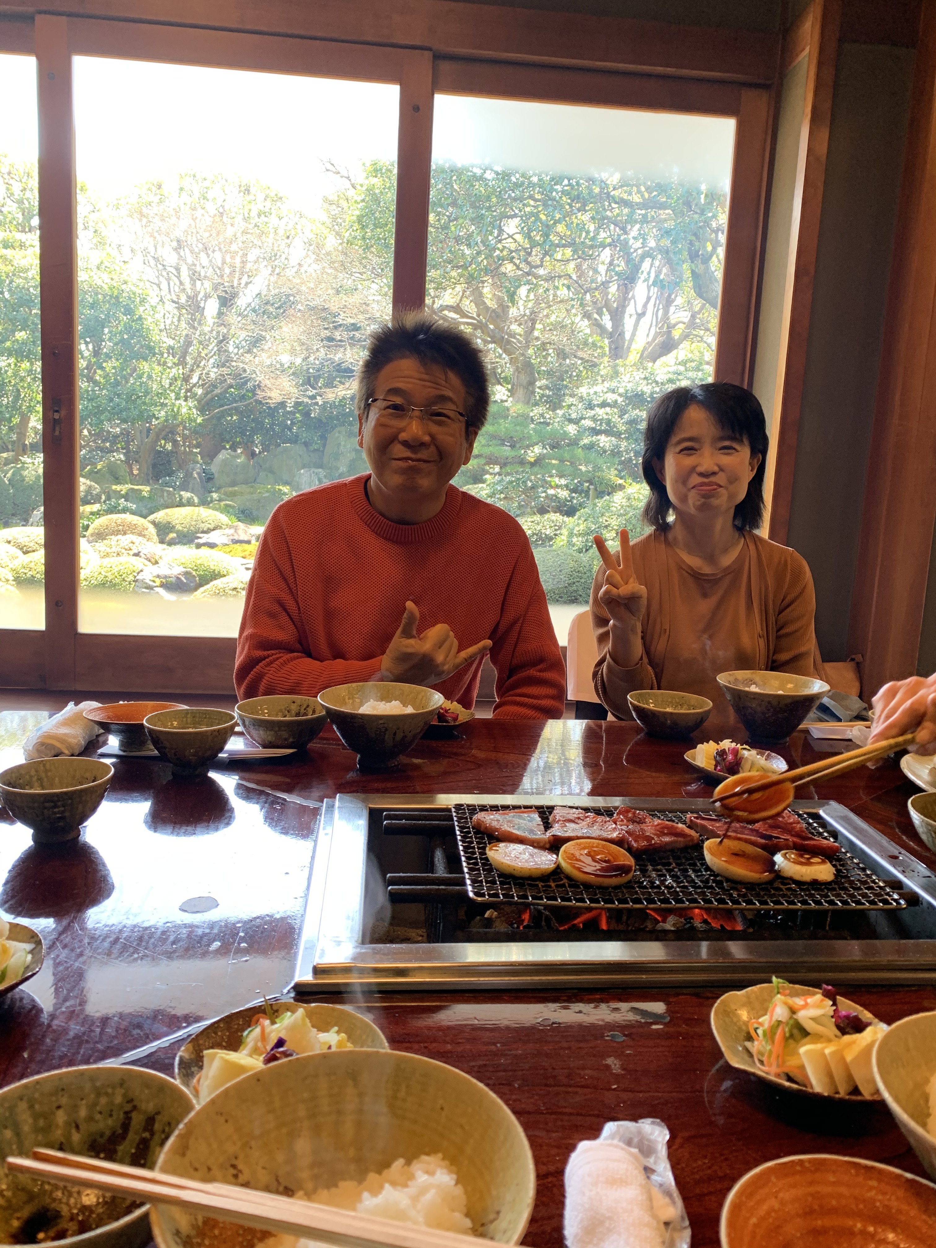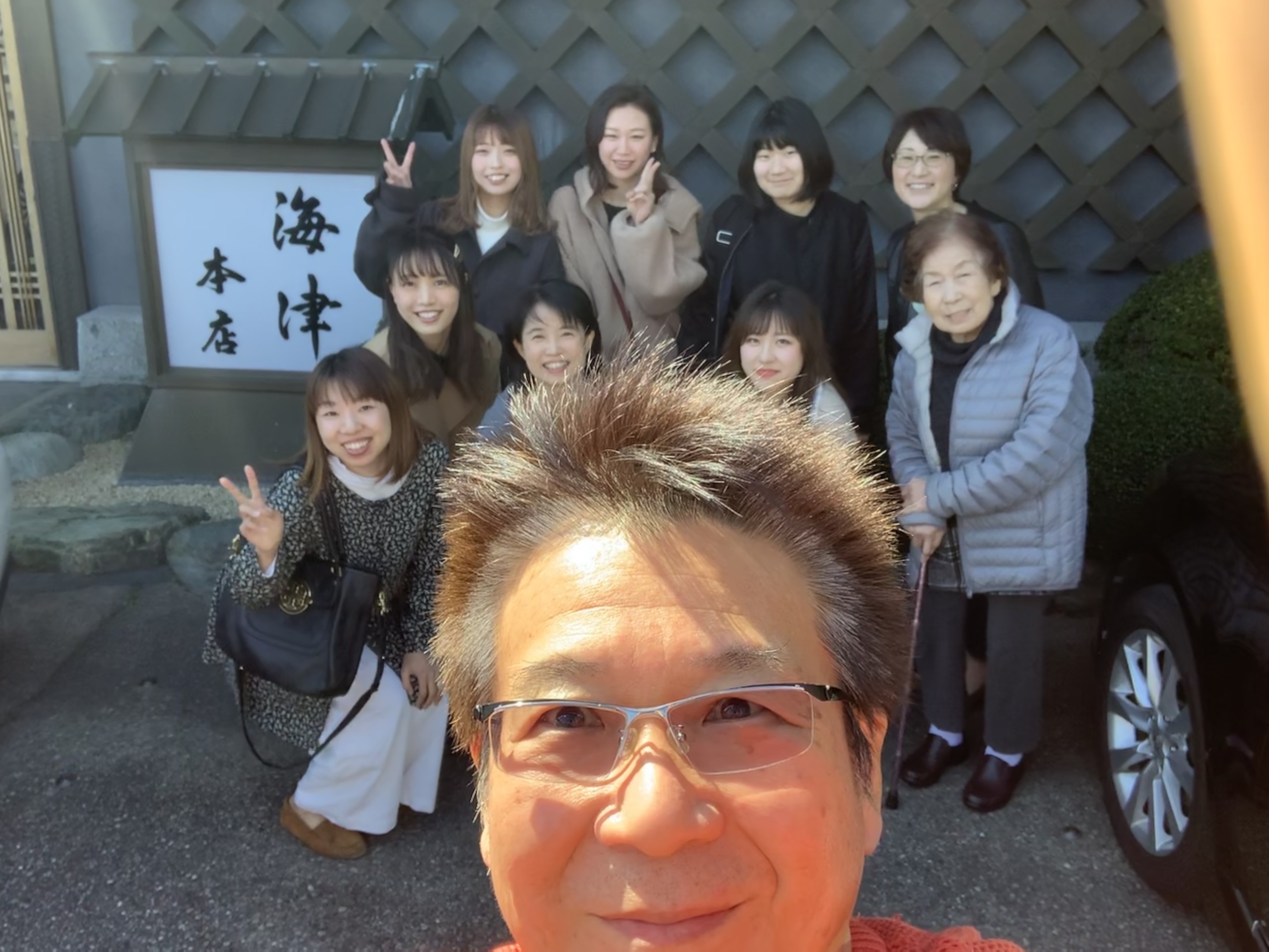 今日は、松阪市の『海津』さんで食事会でした。もちろん、松阪牛の焼き肉です。落ち着いた店構えで、立派な手入れの行き届いた庭園を眺めながら、女中さんが上等な松坂牛のフィレ肉🥩を炭火で丁寧に焼いて、美味しい食べ頃に提供してくれます。そんな雅な時間を満喫する為に午前11:30予約に絶対に間に合う様にスタッフに伝えてありました。すると、みんなが現地全員集合したのが11:00ジャスト。開店まで30分もありました。みんなの期待度の高さが伝わって来ます。いよいよ開店。女中さんに店内に通され赤い絨毯の上を少し緊張しながら、お部屋に通されました。立派な御庭が見える和室で、床間には早咲きの八重桜が見事に生けてありました。二つのテーブルに分かれて座ります。炭火の火が点してあり、炭火の香りと遠赤外線の熱がこれから開かれる最高級の宴の予感を漂わせています。女中さんが運んで来てくれた松坂牛のフィレ肉🥩にみんなの視線は釘付けです。こんにちは😃フィレ肉君🥩。まず、記念写真カシャツ。網の上に丁寧に乗せられたフィレ肉は、炭火で炙られゆっくりと焼かれていきます。食べ頃に焼かれたフィレ肉は女中さんが「今、美味しいですよ。」と教えてくれます。あまりにも柔らかいので箸で🥢掴むと切れてしまいそうです。食べると、もう歯🦷が要らないくらい柔らかくて美味しい❗️みんな同感「生きてて良かった〜‼️」大合唱、大絶賛です。楽しい時間がゆったりと流れていきます。もちろん仲良しの皆んなならばなおさらです。大満足した後に、少し早目ではありますがホワイトデーのプレゼント🎁にロキシタンのハンドクリームを渡しました。好みのハンドクリームを選んでもらう順番はジャンケン✊✌️✋で決めてました。基本的ではありますが、ジャンケンは盛り上がります。