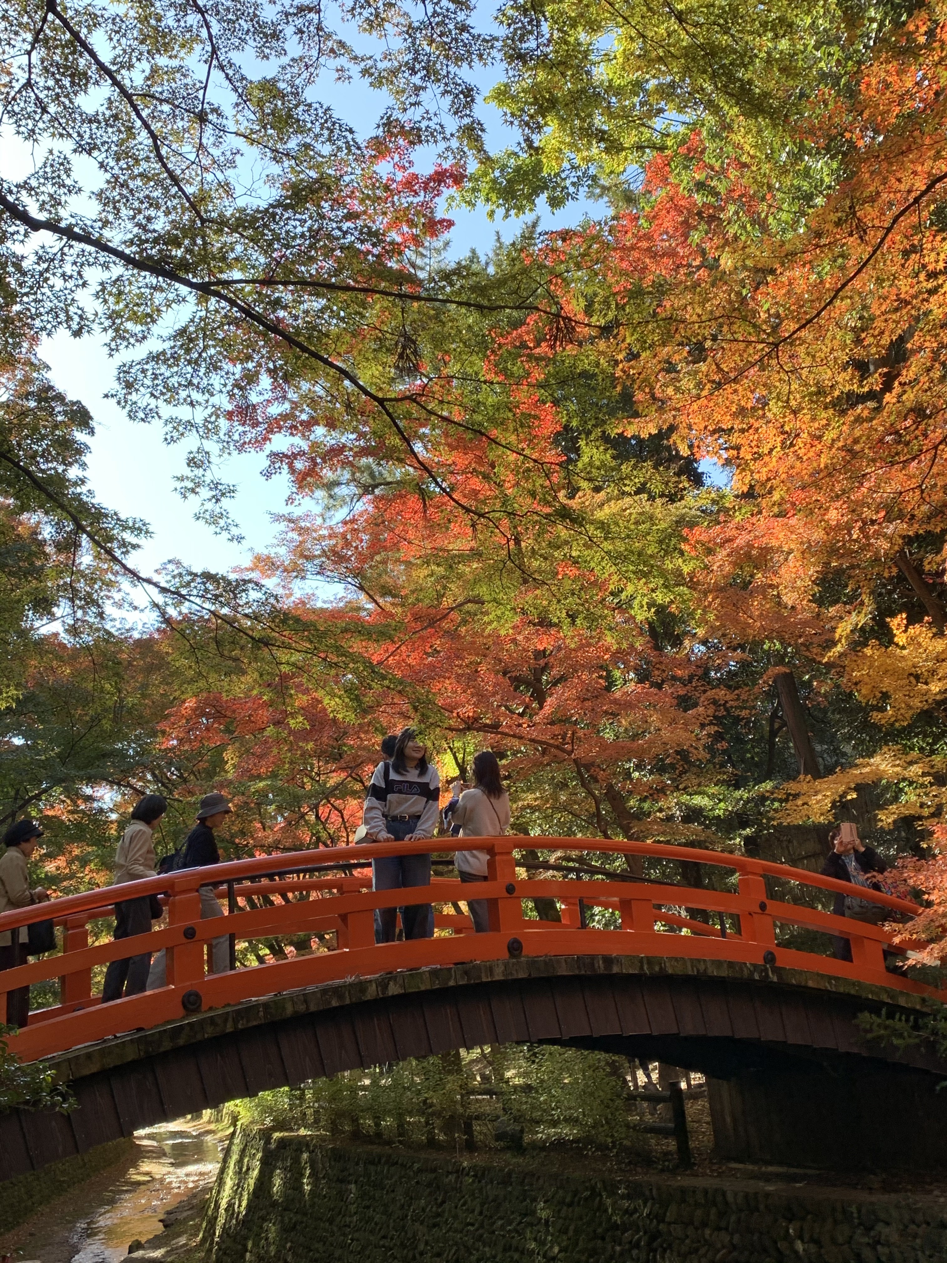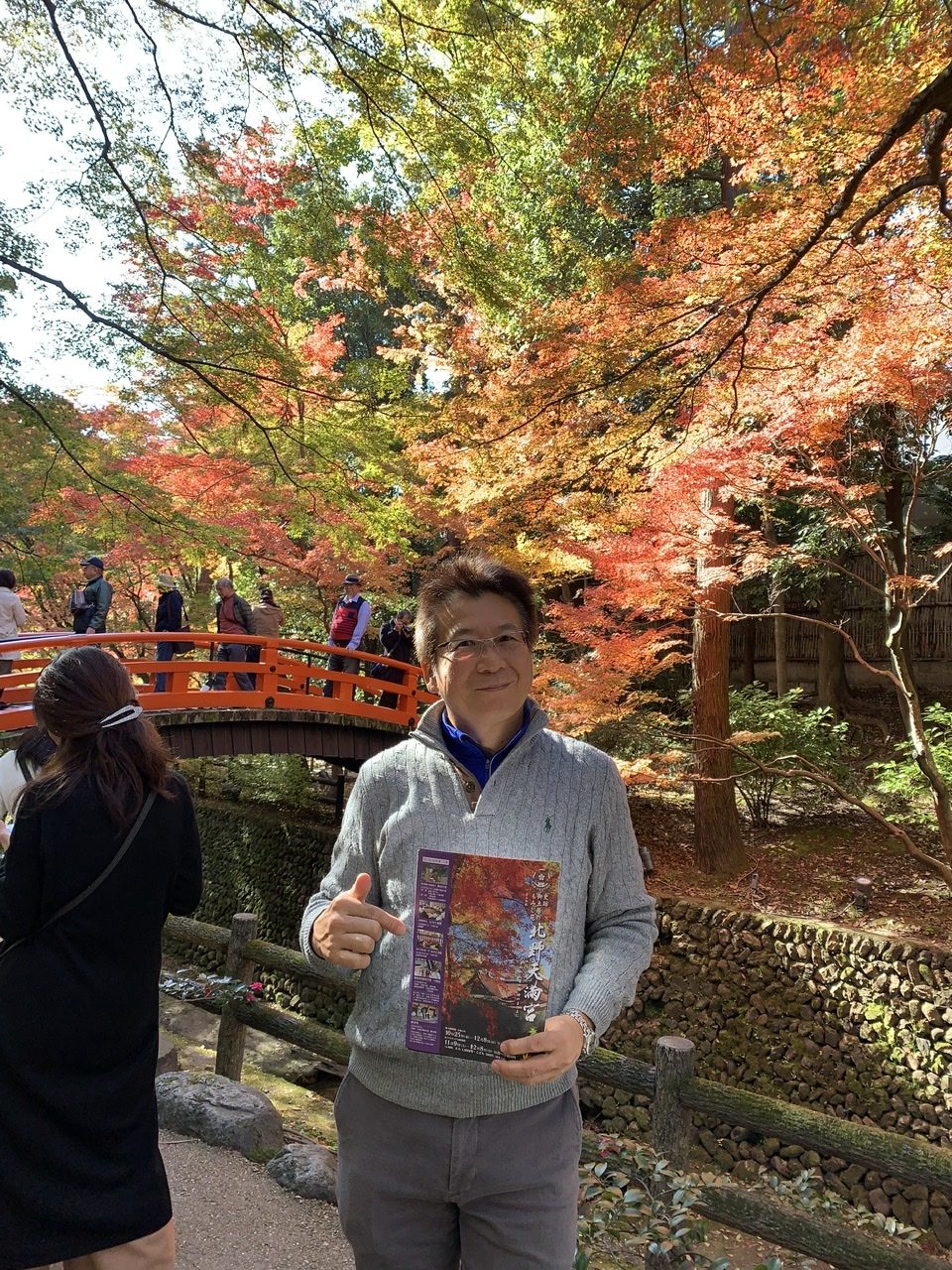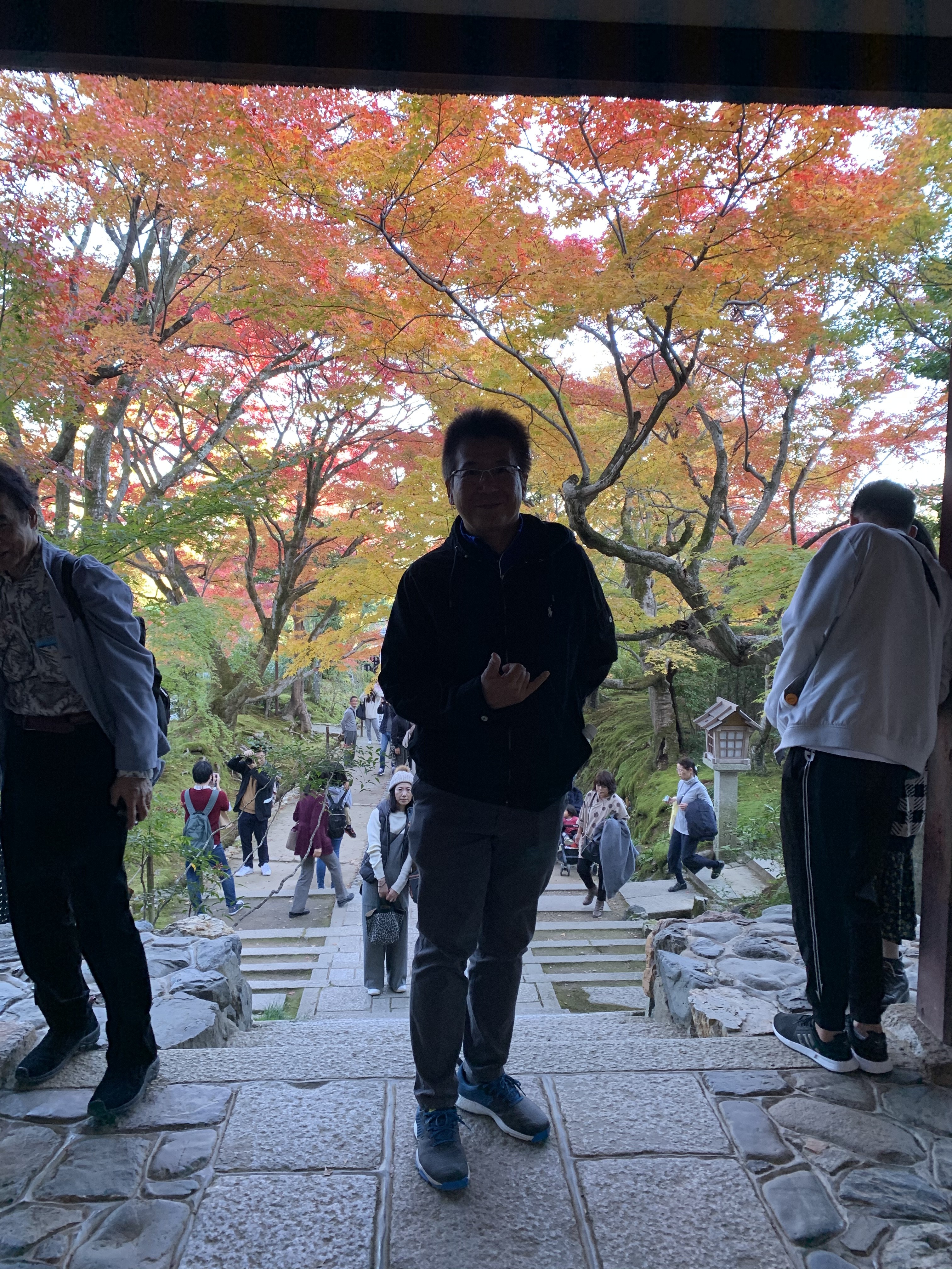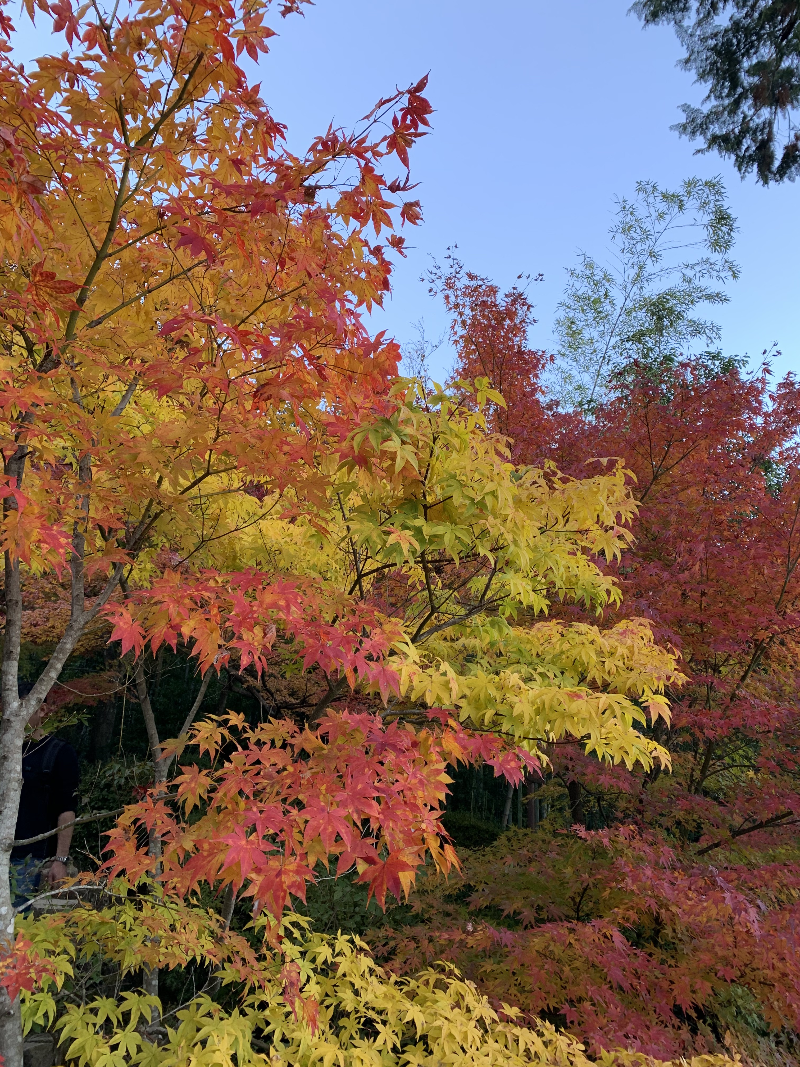 つい最近まで半袖のポロシャツでいられたのにと思っていたら、気がつけば寒がりの私は掛け毛布、敷き毛布もしてガッツリ冬支度です。今日は毎年恒例の京都紅葉狩り🍁です。朝から好天に恵まれ、暖かい1日になるの天気予報を信じて鈴鹿を8:30に出発、新名神高速道路🛣は行楽日和のせいか少し混雑していましたが、その時間も車内での楽しい会話の時間になるのであまり気になりませんでした。娘のお気に入りの嵐の曲を聴きながら、快適に走ります。滋賀県の信楽くらいにさしかかると山々も色づいています。京都東インター出口は混雑していたので、京都南インターでおりました。京都市内も混雑していました。先ず、学問の神様である菅原道真公が祀られている北野天満宮に行きました。梅の名所として有名なのですが紅葉🍁も有名だそうです。道真公にお詣りをします。お賽銭は十分ご縁があります様にと、いつもの様に15円です。そして、忘れてならないのが参道の左側に道真公の母君が祀られている判氏社と称されたお社をお参りする事です。受験のシーズンになると天上の神様の国では、おそらく道真公も大忙しだと思います。願い事の順番待ちは半端ない位だと思います。そこで私達は、道真公に直接お願いした後に、母君に「道真公のお母さん、いつも息子さんとても忙しそうですね。感心します。いっぱいの願い事を叶えるのって大変ですよねー。そこでなんなんですが、お母さん、息子さんにちょっと、晩ご飯の時でもよろしいから榮さんの所の娘さん今年受験なんやて、そやから順番早めてお願いきいてあげたってくれやん。とお話ししてくれませんか。」とお願いします。もちろん、お賽銭は15円です。神聖な気持ちでお参りをした後、紅葉🍁観賞エリアに入園料1000円を払い入りました。1000円払うの少しためらいましたが、園内の紅葉🍁の燃える様な赤、イチョウの眩しい様な黄金色の美しさに充分な対価がありました。始めて入ったエリアでしたがハッキリ、お勧めです。落ち着いた雰囲気で季節の風情を満喫することが出来ました。