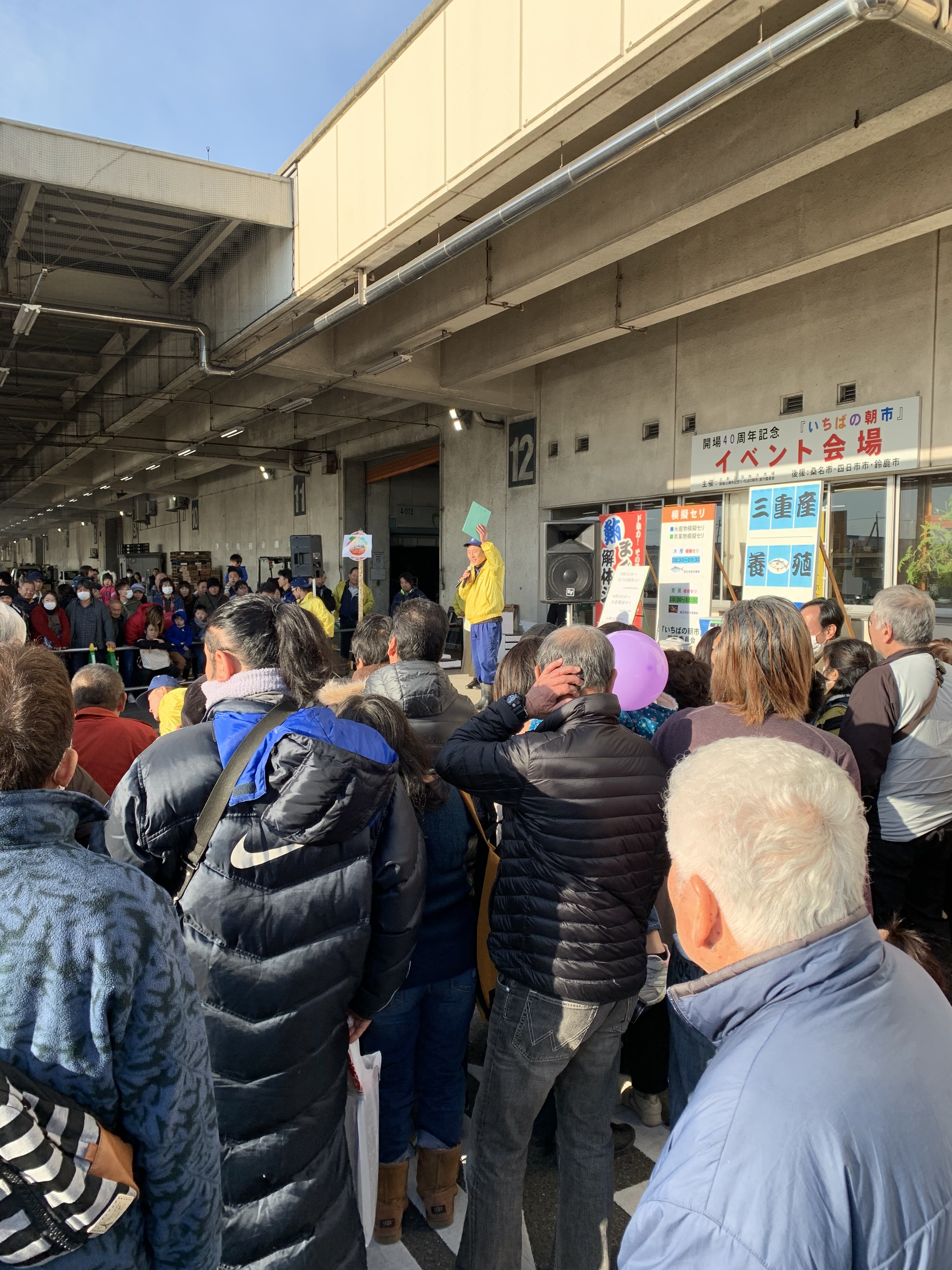 現地集合のスタッフ家族と合流し、結果報告会と記念撮影をしました。スタッフ家族の幸せオーラに榮家の皆んなは嬉しくなりました。温かな初冬の早朝の北勢市場は、賑やかで活気のある楽しい時間が流れていました。