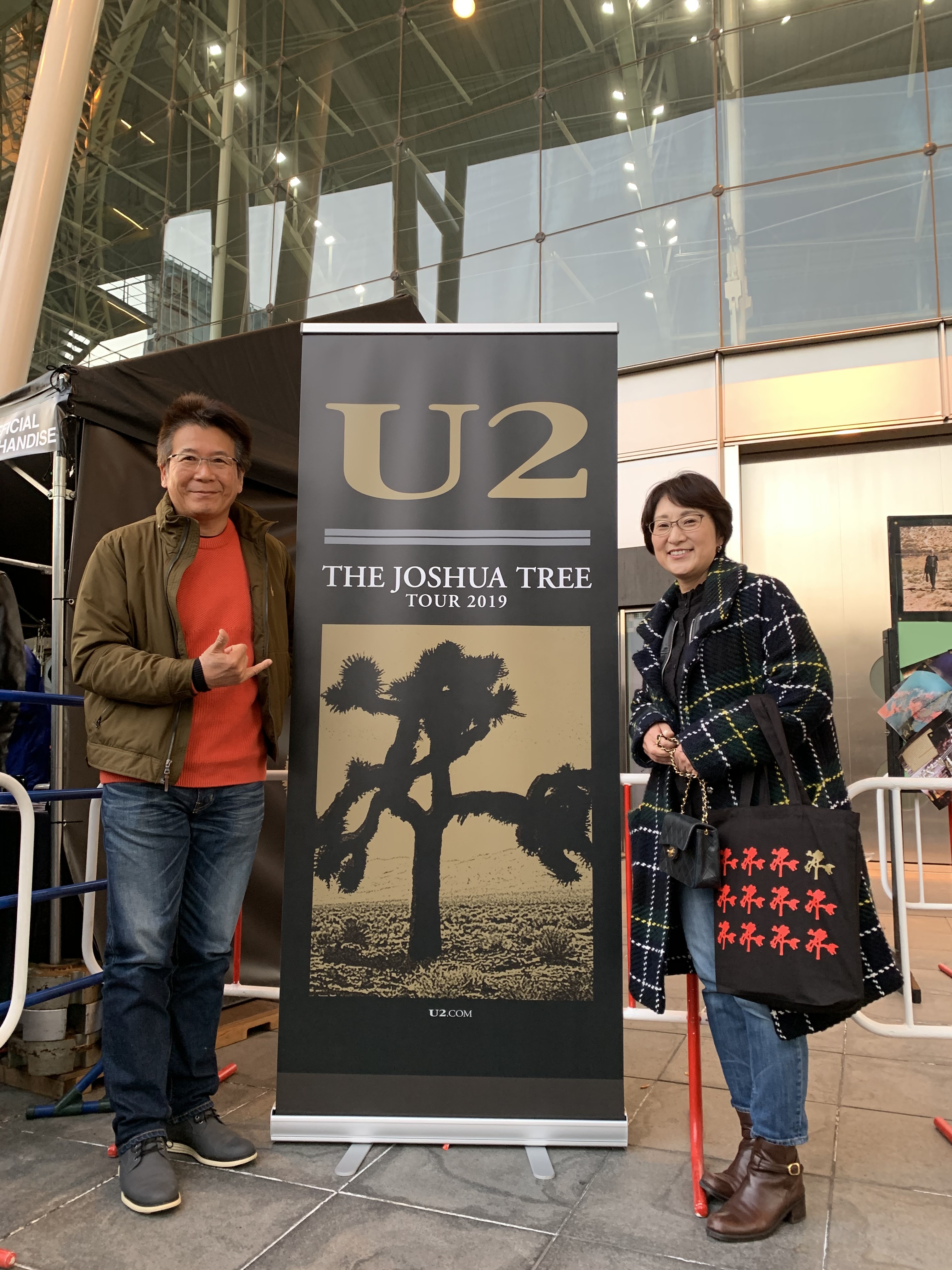 pm4:00さいたま新都心駅に到着、駅前のロイヤルホストでハンバーグセットを食べて体力温存です。さいたまスーパーアリーナの周辺にはU2のファンでいっぱいでした。展示してあるポスターの前で記念撮影、とても嬉しそいな彼女の笑顔です。U2の来日は13年ぶりになります。その時は彼女だけの参加で、私は子守で留守番でした。今回は13年の間に私もU2を学習して参戦です。世界的に認められている一流のロックバンドのコンサートに私も興奮気味です。グッズも買いました。Tシャツとプログラム、トートバッグ。コンサート会場周辺で飽きるくらいの記念撮影。pm5:00チェックインの開始です。アフリカ難民支援やAIDS対策基金にチケット代の半分が寄付されるRED ZONEのエントリーです。スタンディング(立ち席)ではありますが、ステージにかぶり付きのエリアです。テロ対策で何度もチェックを受けましたがワクワクです。やっと会場に誘導されました。ステージから10列目でした。私は背が高いのでステージを見る事ができるのですが、不運にも嫁さんの前には身長180センチはある男性がいました。「前、見える?」と聞くと遠慮しているのか「大丈夫。」の返事でした。開演の時間も迫ってくるとみるみると会場はファンで満たされて来ました。すると「そっちの方に替わってもらっていい?」と。「もちろん。今日は最高の日何だからベストポジションでね。」スタンバイ オッケー👌です。pm7:30ラリー・マレン・Jr.の登場、ドラムソロから『ヨシュア・トゥリーツアー』開幕‼️ギター ジ・エッジ、ベース アダム・クレイトン、そしてボーカル ボノの登場に嫁さんを筆頭に大歓声と共に、地響きを引き起こす足踏みは反戦を歌うSunday bloody Sunday。いきなりクライマックスです。13年ぶりの彼らとの再会は、目の前にはU2しか見えていない16歳のロック大好き😘娘に変貌していました。(かなり無理がありますが)。メインステージには8kの巨大スクリーンがセッティングされ、映し出される映像はU2の演奏を最高の芸術品の様に変えていました。言葉で表現できないくらい素晴らしさに、流石、カリスマ的ロックバンドをひしひしと感じました。楽しい時間はあっという間に過ぎてしまいます。完全燃焼しました。後で聞けば、ブラッド・ピット、米津玄師、RADWIMPS、BUMP OF CHICKEN、今井翼など有名芸能人も来ていたそうです。大興奮の中、さいたま新都心駅に向かいました。駅前はライブ帰りの人達でごった返しでしたが、みんな大満足の顔をしていました。