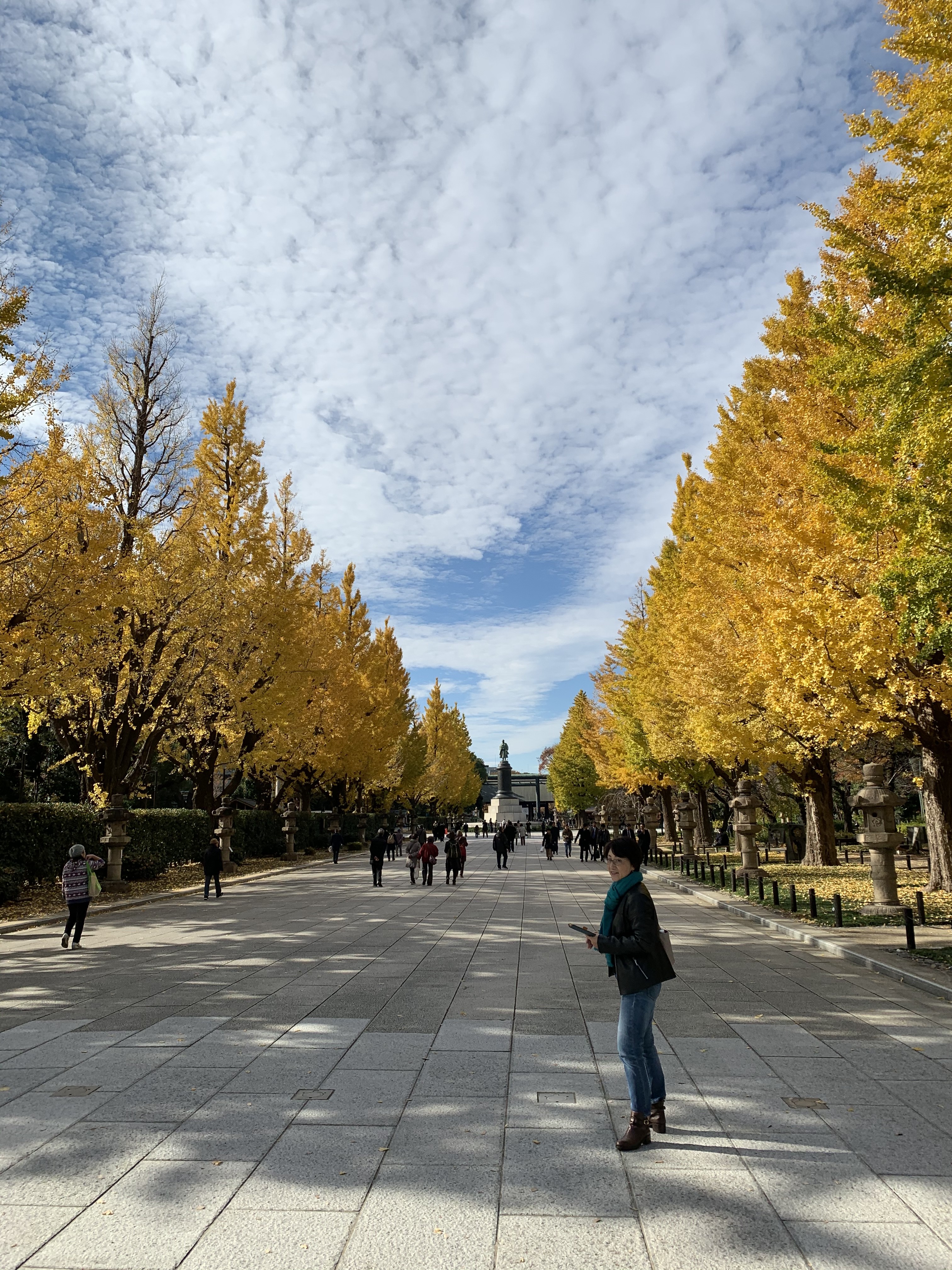 初めて靖国神社を参拝して来ました。今、平和である事の幸せをしみじみと感じ、戦没者の方々に追悼の意を表しました。境内の銀杏並木の黄金色が晴天の青空に映えていました。
