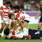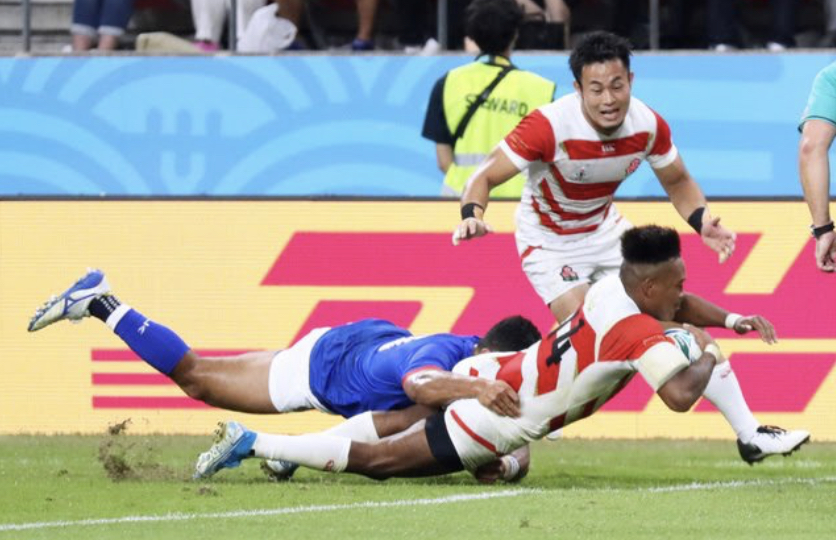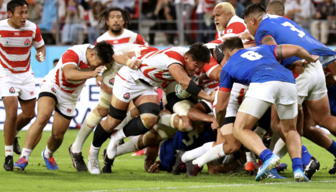 ラスト1分 スクラム。ドガッ!ガッツリと組まれた巨漢達、地獄合宿で磨いた魂のニッポンスクラムが、サモア🇼🇸の太りやすいポリネシアンの体質に筋肉の鎧を身に纏った重戦車の様なスクラムをじわりじわりと押し後退させて行きます。「押せぇ〜!押せぇ〜‼️押せぇ〜‼️」「トライまで持ち込めぇ〜‼️」日本は、サモアに勝利は確実です。4トライ目でボーナスポイント1が加わります。ワールドカップが始まる前まで、「なんで、ボール前に投げたらダメなの?ノッコンって何?モールって、イオンモールなんちゃって、」と言っていた嫁さんが、勝点の仕組みまで熟知しています。もの凄い進化率です。出世魚ならば、卵から、いきなりブりです。ラックから出されたボールは、田中選手から矢の様なパス、左に展開した松島選手に渡りトライ‼️テレビ📺の前で、榮家はサモアの戦士の踊りシバタウを狂喜乱舞「マツシマコータロ〜‼️走れコータロー‼️」「ノット リリース ア ボール!姫野ジャッカル!ノッコン 帝京ボール!ドロップ ゴール!オフサイド!ノーサイド!」知ってる限りのラグビー🏉用語が飛び出します。勝った、ニッポン、ファイト!一発!リポビタンD!8強まで、あと少しです。頑張れ‼️