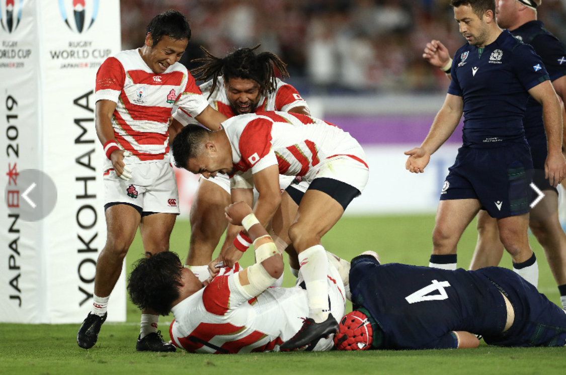 「5!4!3!2!1‼️ウォー‼️」ガッツリ組まれた日本🇯🇵とスコットランド🏴󠁧󠁢󠁳󠁣󠁴󠁿スクラムの巨漢達の肉弾戦。横浜国際総合競技場、超満員の日本サポーターで埋め尽くされたスタジアム🏟からの大声援と一緒に私達もカウントダウン。ピーッ‼️大歓声に打ち消されようとするホイッスルの音。「ノーサイド」その瞬間、「やったー!」嫁さんと強くハイタッチ🤚です。桜ジャパン日本代表ラグビーw杯8強決定です。ありがとう😊日本代表。正直、まさかここまでくるとは、思っていませんでした。地獄の練習合宿を乗り越え、弛まない努力、チームメイトを信じて、誰にも負けない位に努力したのだから、絶対に負けないという自信と信念。必死に走り、巨漢に体当たりされても前へ前へ、突進していく松島幸太郎。右脇腹を痛め交代を余儀無くされたホンダヒートの具智元選手も、痛みを堪える彼の目の奥に見えた勝利への執念。巨漢無表情の決して笑わない稲垣敬太のウィリアム・トゥポウのパスをしっかりと抱えて、代表初トライ。でも、笑わなかった。今季を最後に引退し、医師の道を志す福岡堅樹の救命救急・ドクターヘリ山下智久の疾風の如く軽快に2トライ。日本代表の一挙一動に力が入ります。胸が熱くなり、時に目頭が熱くなる時もありました。
