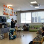 館長さんに挨拶し、控え室(ベッドがありました。)に通されネタの仕込をします。スタンバイ、オッケー👌。スタッフさんを含め20名位のオーディエンスが待ってました。皆さん温かく迎えてくれました。いつも同じ様な演目を披露しました。とても喜んでくれました。私の真後ろが事務所になっていたので、仕込みや、タネが丸見えになっていたのですが事務所の方に大人の対応をして頂き助かりました。手品を次々と披露していき、みんなも楽しく笑っていました。呪文に「カ・タ・パ・ラ」「あ、い、う、べ」とし、嚥下機能回復のトレーニングに役立つと説明し、少しだけ歯医者情報も入れておきました。腕ギロチンの手品の時はいつもドキドキします。演者がドキドキするのですから、当然、見ている方はもっとドキドキします。今日は少し焦りました。一番前で真ん中で見ていたおばぁちゃんがギロチンがガタンと落ちた時ピクッと動いた瞬間に、職員の方が近くに駆け寄り「〇〇さん大丈夫ですか。ビックリしたよね。」と。私の方がもっとビックリしました。事故もなくショーは無事終了しました。みんな大満足みたいでした。