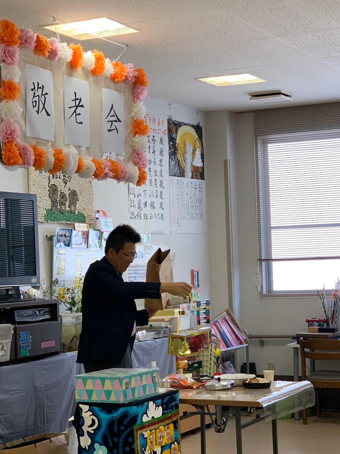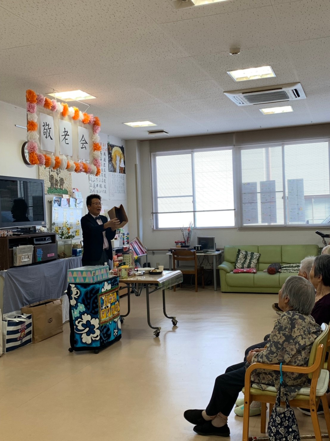伊勢マリンホームデイサービスに到着すると職員の方が、蝶ネクタイ姿の私達でもベリー ウエルカムでした。カーテンで仕切られたお風呂の前の臨時控え室で急いで手品のネタの仕込みをしていると、係りの方が「お名前を、どうやって紹介しましょうか?」と聞かれ、とっさに「マジック☆こうちゃん でお願いします。」と。「お待たせしました。それでは今日の敬老会のお楽しみ手品です。マジック☆こうちゃんのマジックショーです。張り切ってどうぞ!」さっそうと『こうちゃん』登場です。30人位の御年配の方々は初対面の私に緊張気味でした。私も、歯医者の講演としてではなく、手品好きな、おっさんがボランティアにマジックを披露しに来たというポジションなので、緊張します。そして手品を進めていきます。いつもの様に、シュウマイ、キャンディ🍬、ポップコーン🍿、カップケーキ🧁、麦茶などなどと、色々と不思議と共に出していきます。シルクを使ったマジックを披露している時には、ギャラリーと私の間には距離は無くなっていました。手品の途中に、唾液腺のマッサージや誤嚥性肺炎の予防に「あ、い、う、べ体操」や「カ、タ、パラ」の口の周囲の筋肉の体操をしました。とても熱心に体操してくれました。さあ、クライマックスの出し物「腕ギロチン」では、アシスタントのひろみ・キャンベルの腕が切れないようにと両手を合わせて「南無阿弥陀仏、南無阿弥陀仏・・・」と拝むおばあちゃんやら👵、いつもはリアクションの薄いというおじいちゃん👴が、身を乗り出して見てくれてたりでかなり盛り上がりました。