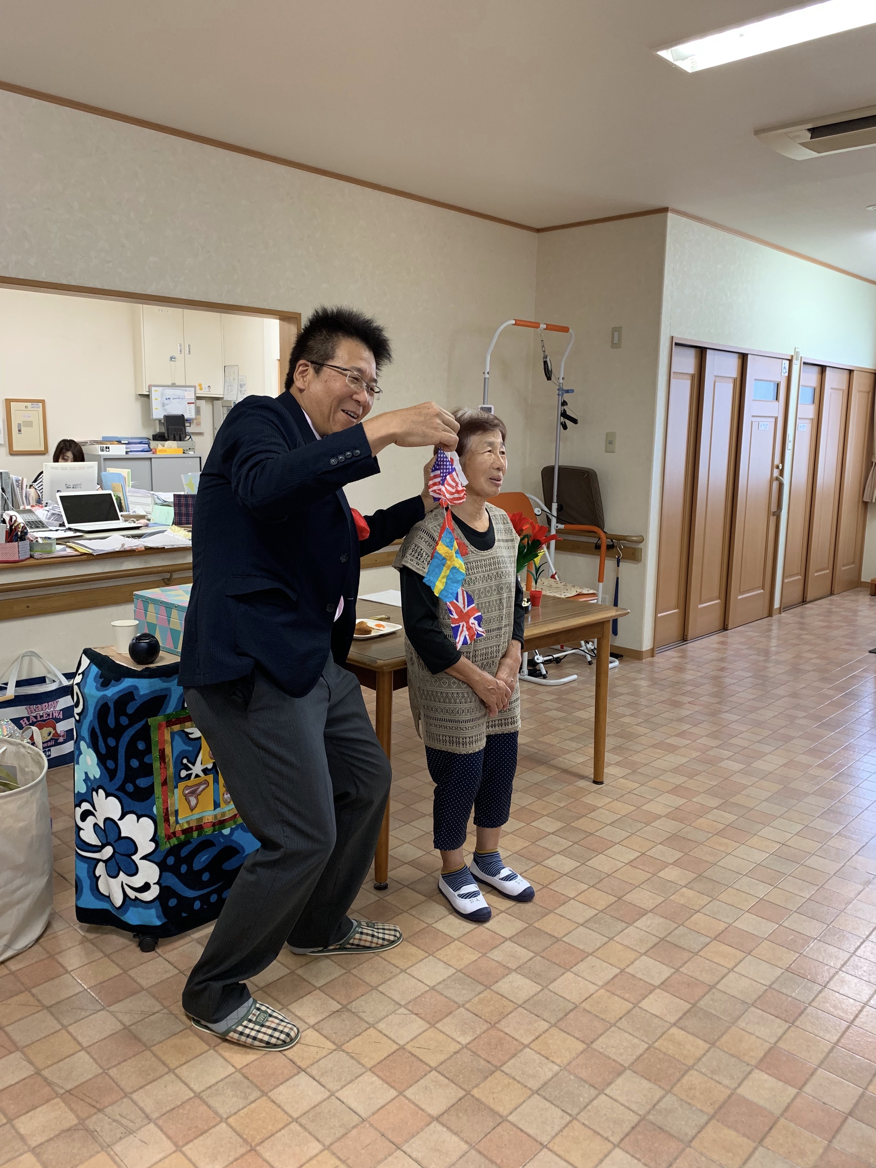 マジック☆こーちゃん大人気です。今日は玉垣町のデイサービス『落花生』からの出演依頼があり、アシスタントのひろみ・キャンベルを伴って参上しました。もちろん手品🎩の披露です。ネタの仕込みがある為に、いつも約束の時の30分前に現地に到着します。「手品の余興に来ました。榮です。」職員の方が、「あれっ、さかえ歯科の先生と奥さん!手品って先生がするの?」ウチの患者さんだったのです。とっさに、「私はマジック☆こーちゃんです。そして助手のひろみ・キャンベルです。他人の空似です。」ととぼけたのですが、他の職員の方に「先生、親知らず抜くの上手やに。」と説明して下さいました。