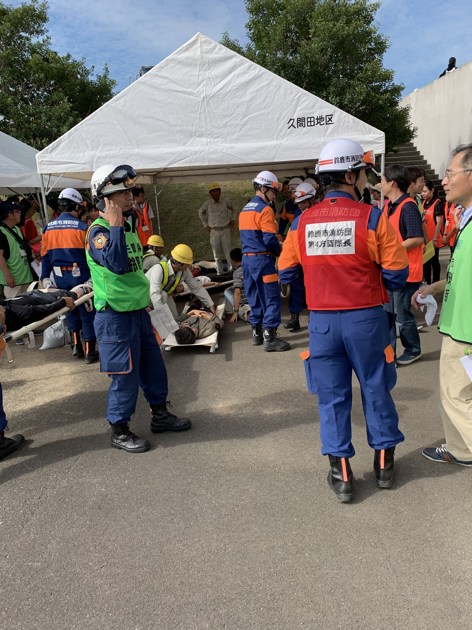 石薬師の三重県消防学校で鈴鹿市総合防災訓練がありました。昨年は台風の為に中止になった事業です。訓練の想定は令和元年9月29日am9:15南海トラフを震源とするマグネチュード9.0の海溝型地震が発生し、市内は最大震度7の揺れを観測、さらに大津波警報が発令、市内の多くの地区で人的及び建物等の被害、交通施設及びライフライン等の被害が発生している。訓練の集合時間はam8:15だったのですが、俄然やる気満々の私は40分前に現地に到着しました。まだ、人はまばらでした。駐車場から消防団の人らしい団体がやって来ました。みんな白いヘルメットを被っていました。ヘルメットは必需品なのか?ボールペンとペットボトルの水しか持って来ていない私は、少し不安になりました。