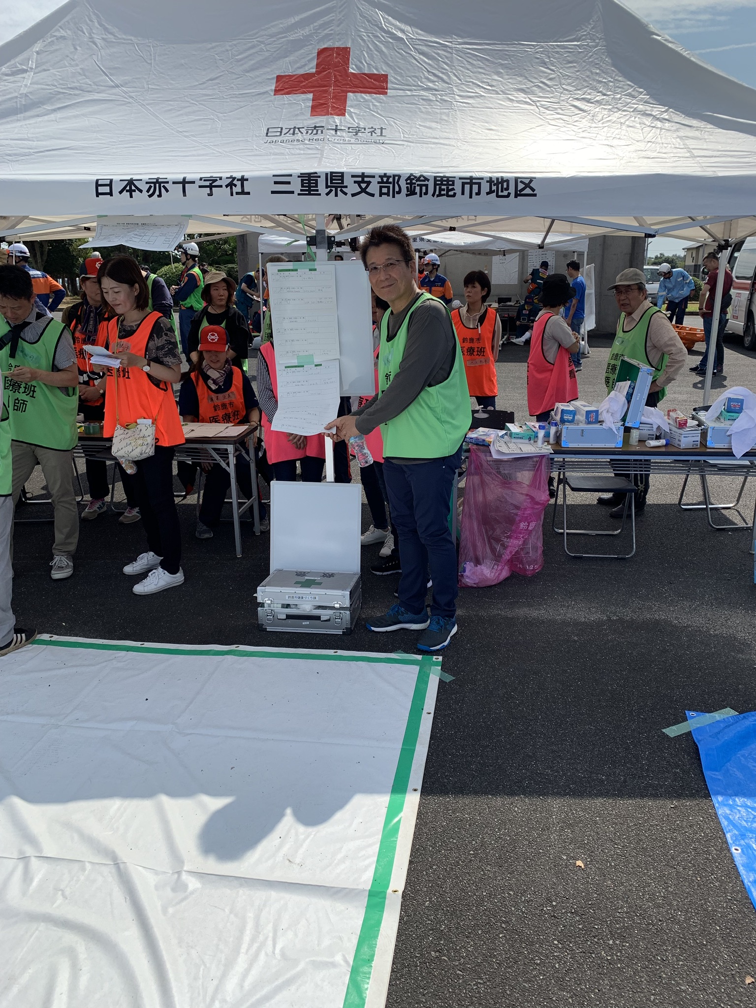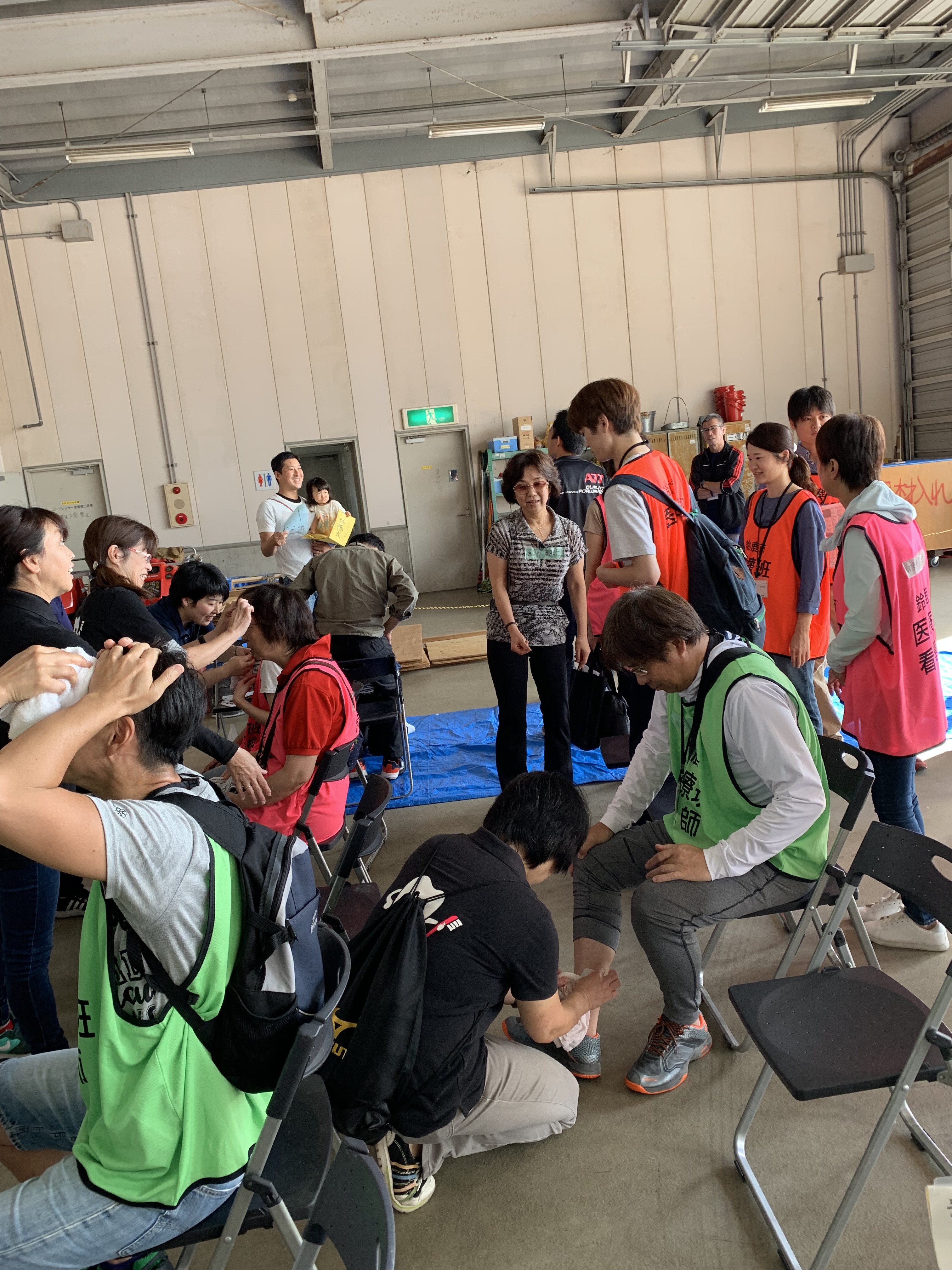 消防学校の広い敷地には、様々テントや見た事のない自衛隊車両、パトカーなどが置いてありました。なぜかワクワクしてしまいます。そうこうしているうちに、集合時間になりました。私は医療班としての訓練です。前半は負傷者役、後半はトリアージ、処置役の段取りです。まずどんな負傷者役になるのか配役が決められました。私は、AB型、腹部打撲、歩行可能の負傷者役です。特殊メイクをしてもらいにメイク室(パイプ椅子が並べてあるだけ)へ。メイク担当は知り合いの衛生士さんです。「先生は、どこのケガなん?」「腹部打撲。ハデにメイクやってください。お願いします。」とシャツを捲り上げ、お腹を出して見せると、「先生!これもう手遅れです。」と、タプタプのお腹を見て大笑いです。「北斗の拳のハートみたいやろ。」と言っても世代の違う彼女たちにはわかりません、説明するのも面倒だったのでスルーしました。ハロウィンで使うゾンビシールをお腹に貼ってもらいました。とってもリアルに青アザになったお腹を見て、家に帰ってから嫁さんと娘を驚かそうと思いました。メイクを済ませてから、開会式でした。ゾンビシールでメイクした負傷者役の沢山の方々も並んで市長の話を聞いている様子は不思議な光景でした。am9:15地震発生です。警報が鳴り、その場にうずくまり、頭を守り低い体勢でじっとしているシェイクアウトをしました。揺れも収まった程でケガした場所にスタンバイしました。「ウーッ、痛いよー❗️」うずくまりお腹を押さえていました。トリアージ役の先生から「大丈夫ですか。お名前は?どちらにお住まいですか?痛いのは、お腹ですか?歩けますか?」アカデミー主演男優賞を狙った熱演をしようと思ったのですが、ふざけてると思われてはいけないのと、恥ずかしさもあったのでアッサリと「大丈夫です。歩けます。」歩ける時点でトリアージは『緑』で自力で最寄りの個人病院に行き手当を受けることになりました。自宅を出る時は、薄れていく意識の中、懐かしかった青春時代の話をし告白できなかった『あの子』に会いたかったと話し、実は私はG r e e e e nのメンバーであるとカミングアウトし、次第に意識不明状態に陥り、トリアージは『赤』に移行、救急車🚑に乗せてもらうつもりだったのですが、還暦前ともなると直前に理性が優先して出来ませんでした。