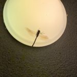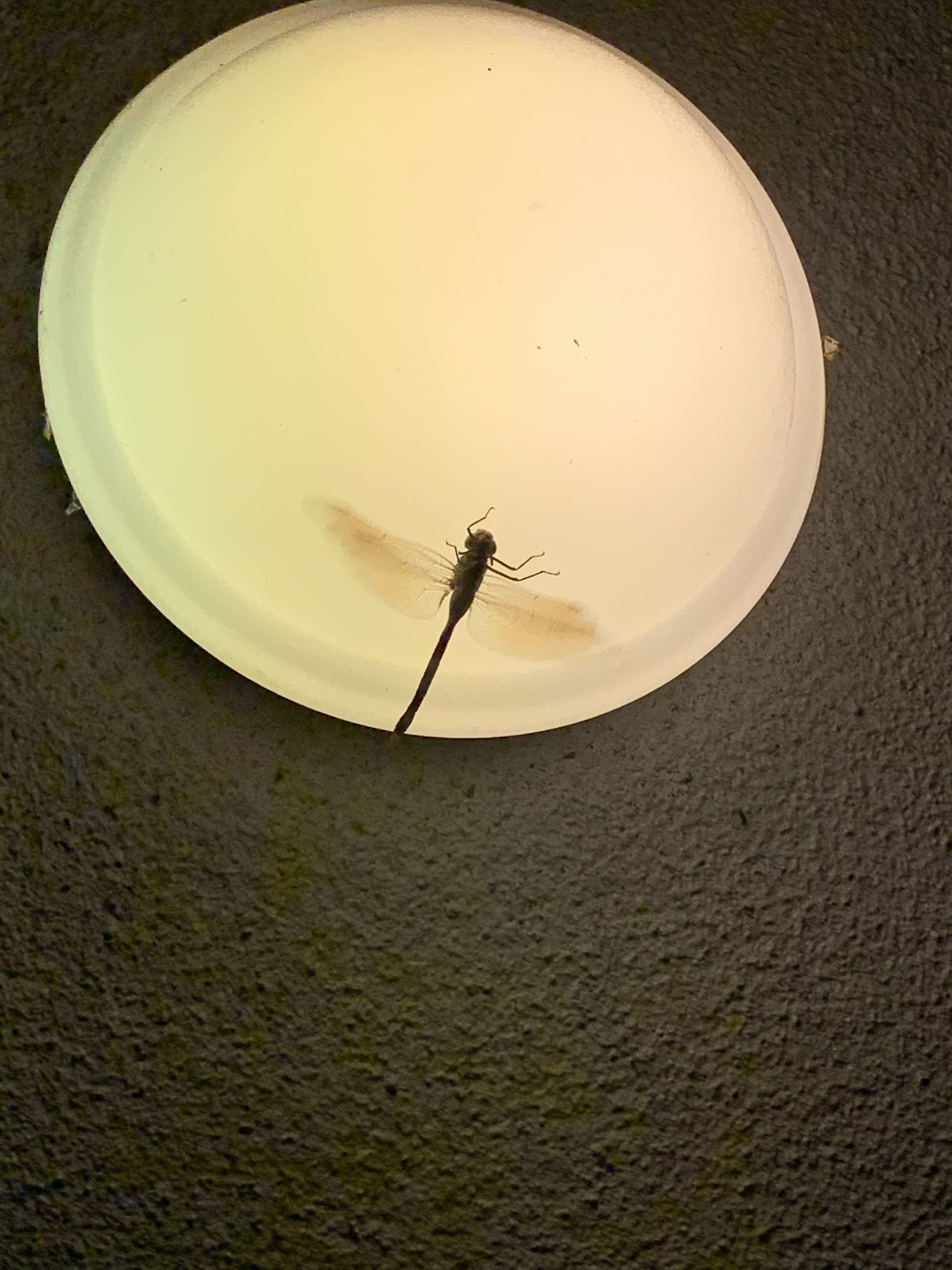 仕事が終わって帰宅すると、玄関の街頭に大きなトンボがとまっていました。な、な、なんと!ギンヤンマではないですか。赤とんぼやシオカラトンボは、よく見かけますがギンヤンマはレアです。子供の頃に捕まえようとするも、見事な滑空テクニックで捕獲できず空高く青空の彼方へ逃げていった事を思い出しました。今、夜で彼の動きも鈍く50数年目にやっとその瞬間を迎えましたが生命のはかなさを知った還暦前の私は、彼を被写体にし、丸く、ほの明るく薄山吹色の電燈を満月に見立てて中秋の名月に遊ぶギンヤンマの風情にシャッターを切りました。
