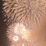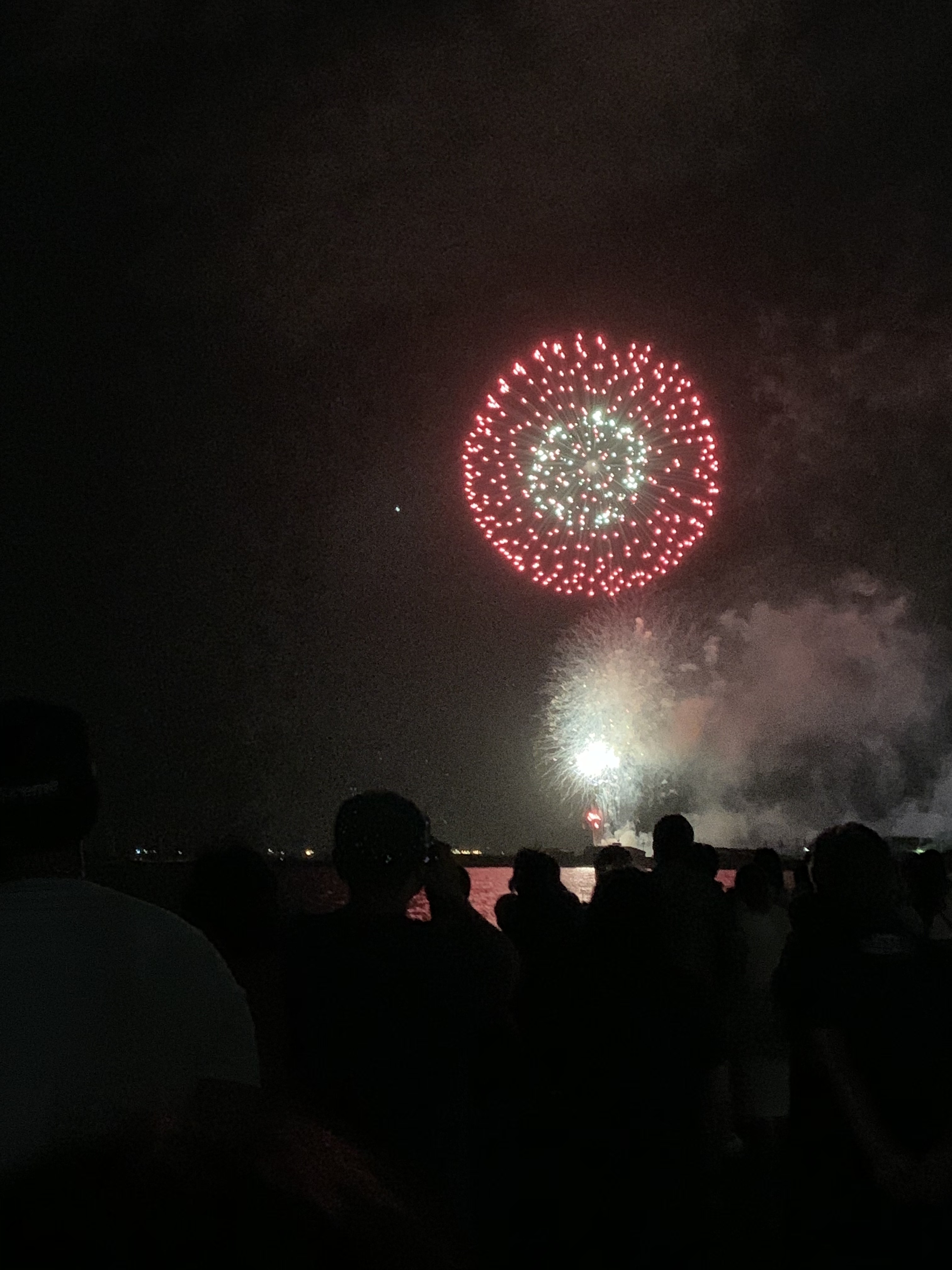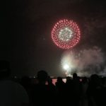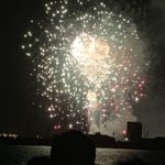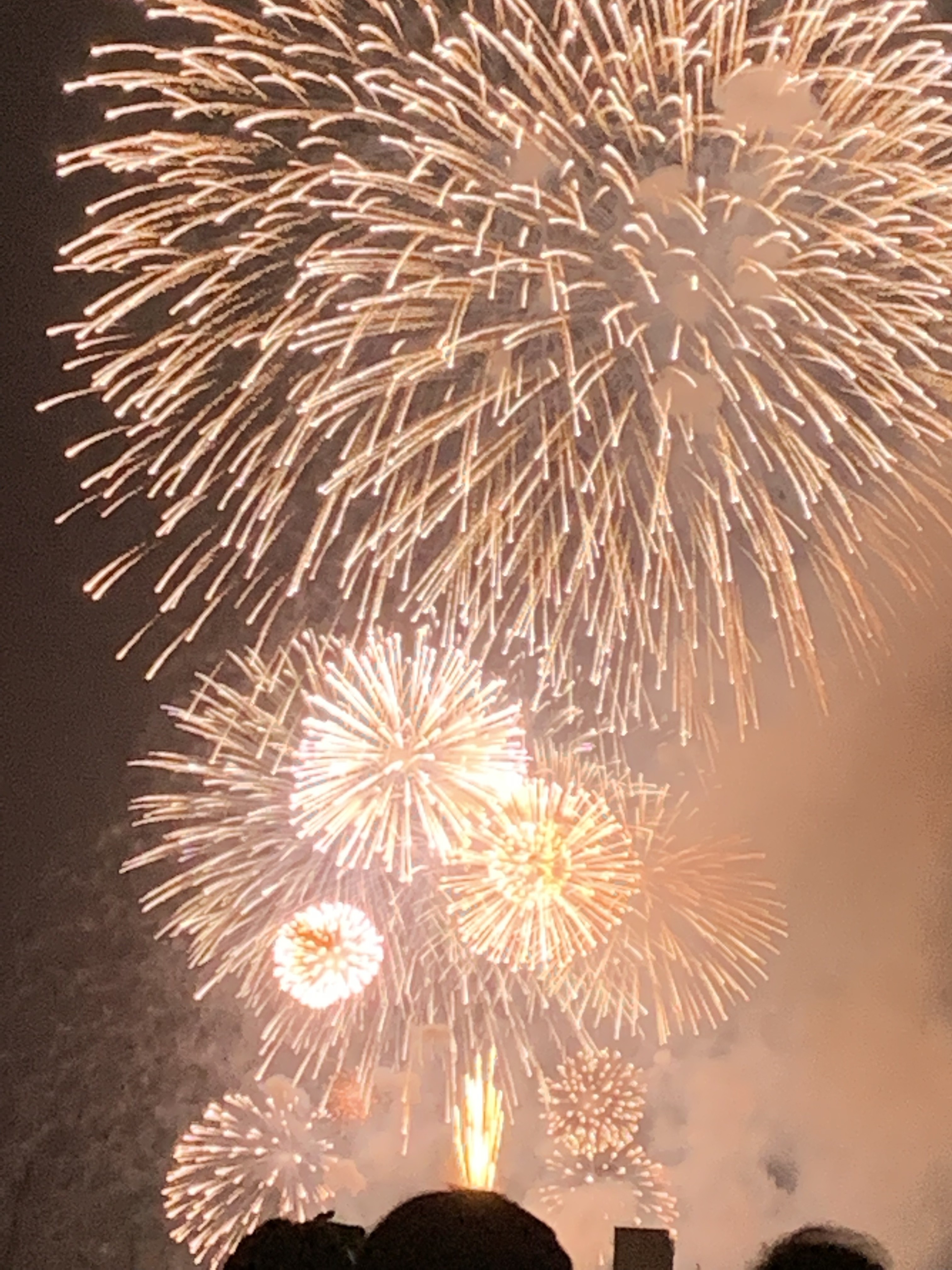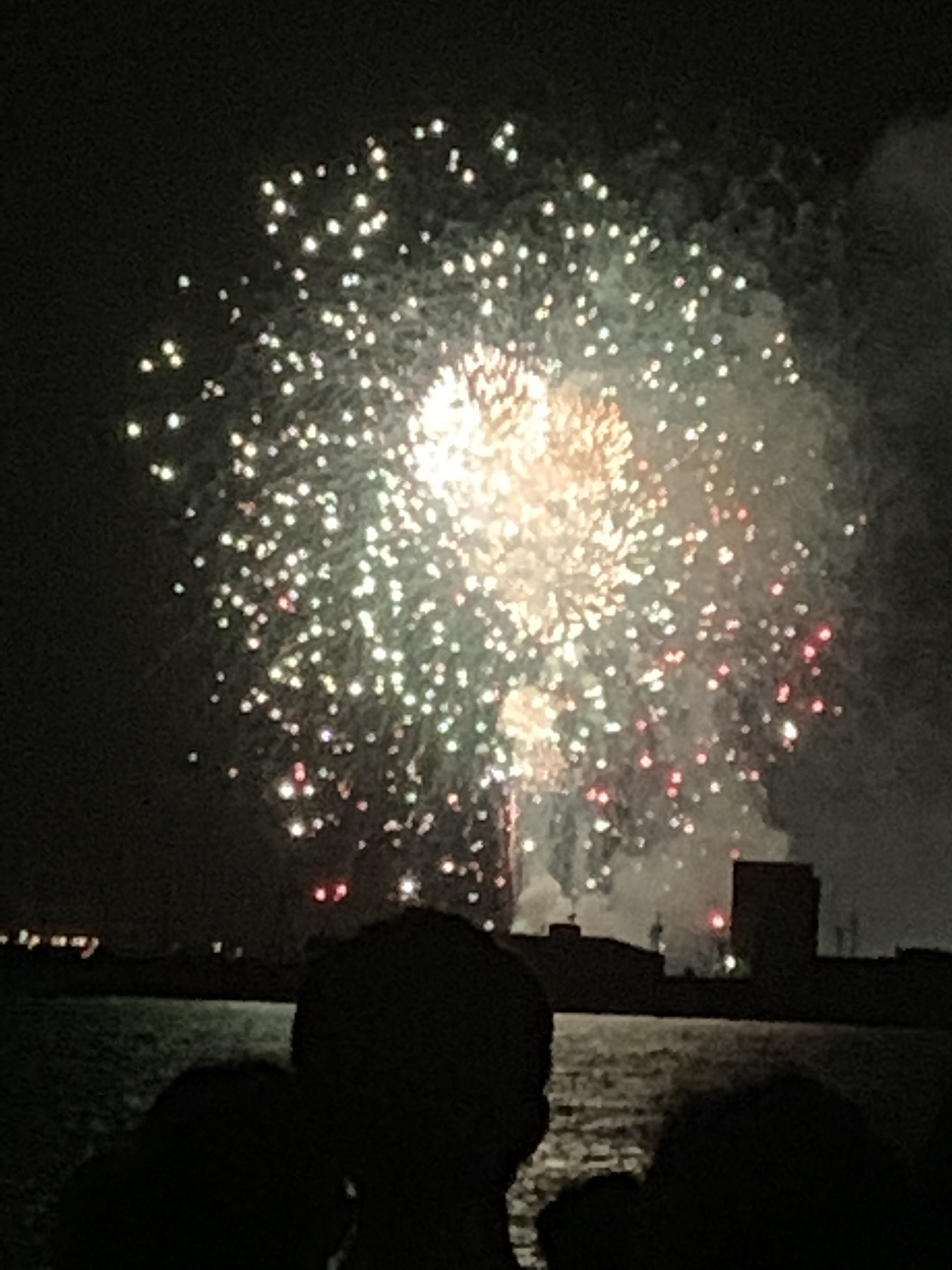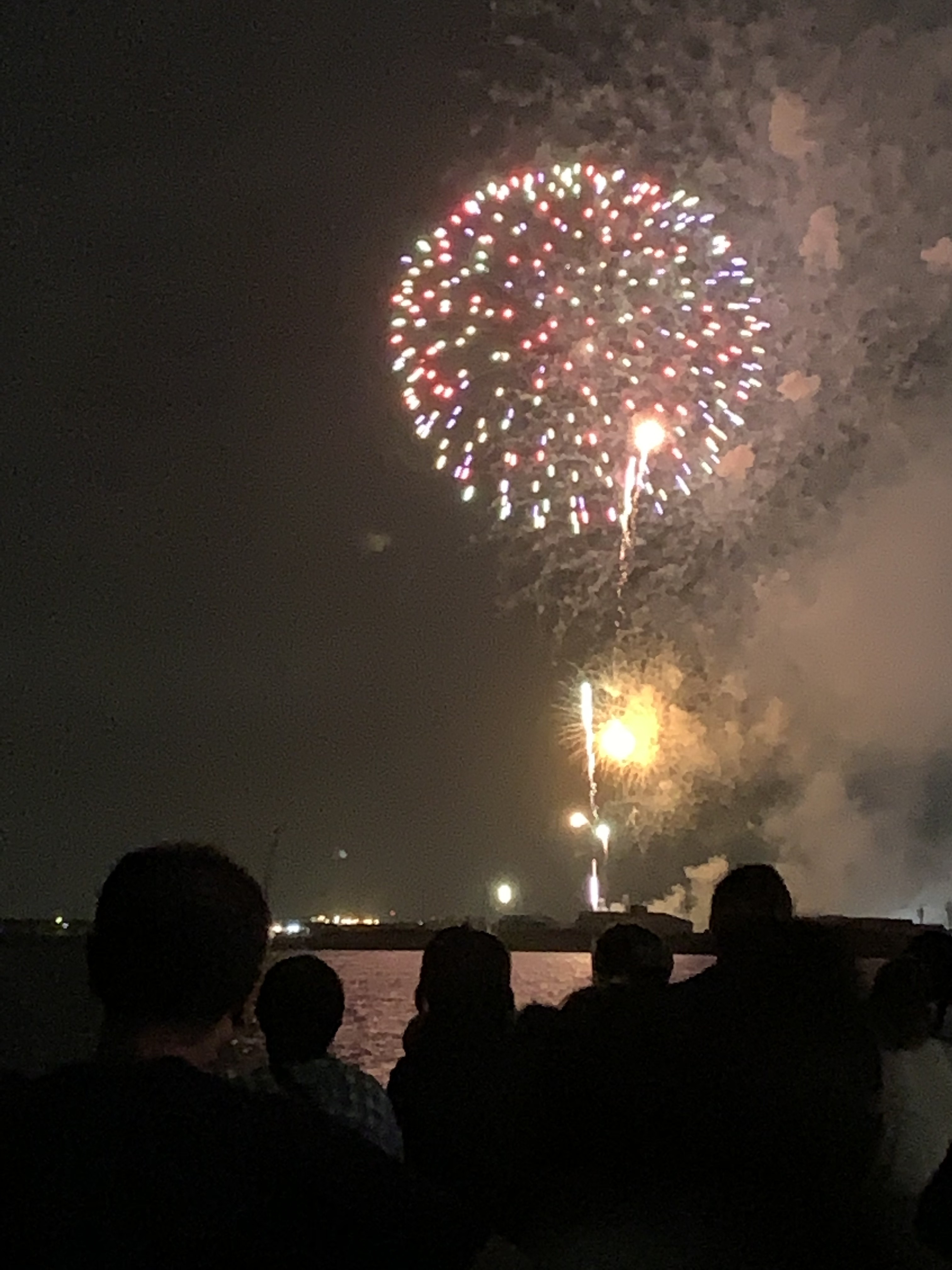 今日、鈴鹿げんき花火を見に行きました。診察を7:30に終了して、嫁さんとスタッフで見に行きました。白子海岸に歩いて向かう時には、もう打ち上げが始まっていました。建物の間から見える花火は綺麗でした。もっと近く、もっと 大きな花火を見たいという願望は自然と、歩く速度を上げます。海岸の堤防に着くと沢山の人でした。私達はみんな、今年初花火です。打ち上げられる花火の美しさと、お腹にまで響く大音響はまさに、花火の醍醐味です。三尺玉を含めて約4000発の花火は1時間弱の間、漆黒の天空をキャンバスにして鮮やかで美しい光と音のパフォーマンスで私達の心を満たしてくれました。