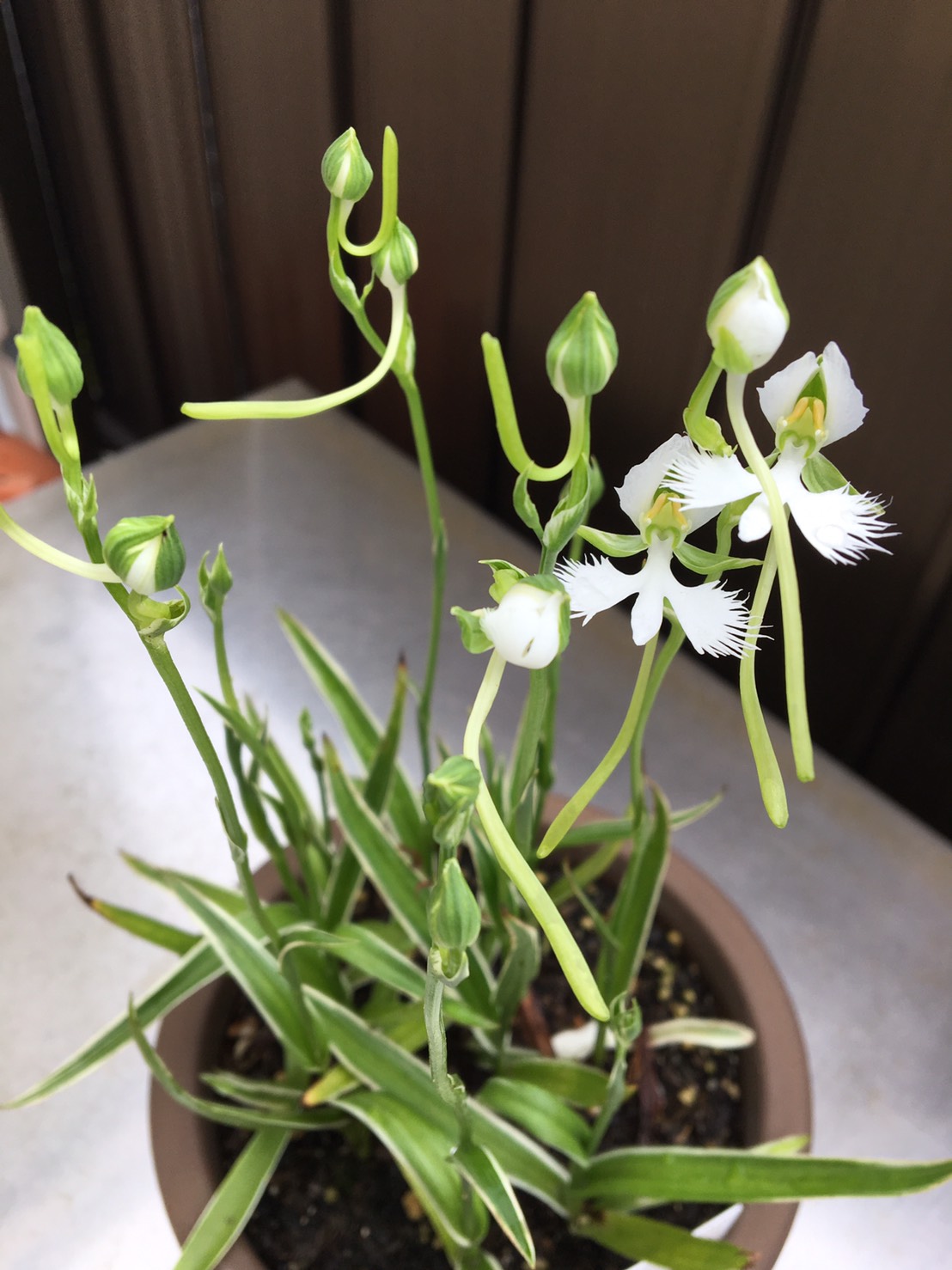 白い綺麗なサギソウの花が咲きました。スタッフの家の植木鉢で咲きました。このサギソウは、患者さんから10年位前に頂いたものです。さかえ歯科にも鉢入りの綺麗なサギソウを頂いたのですが、枯らしてはいけないと思いいっぱいに水をあげすぎた為に根腐れを起こしてしまい枯らしてしまいました。当時、頂いた患者さんから「先生、何事もええ頃加減があるで。大事にしてくれる気持ちはわかるけど。」と笑いながら言ってくれました。でも少しガッカリした顔をしていました。その患者さんも数年前に亡くなりました。毎年サギソウの花の咲くこの頃になると、その患者さんの声が聞こえてくるようです。「天国から見えてますか?サギソウが白い綺麗な花を咲かせましたよ。診察室で、色々話してくれた貴方の笑顔がサギソウの白い花の向こうに見えてきますよ。」