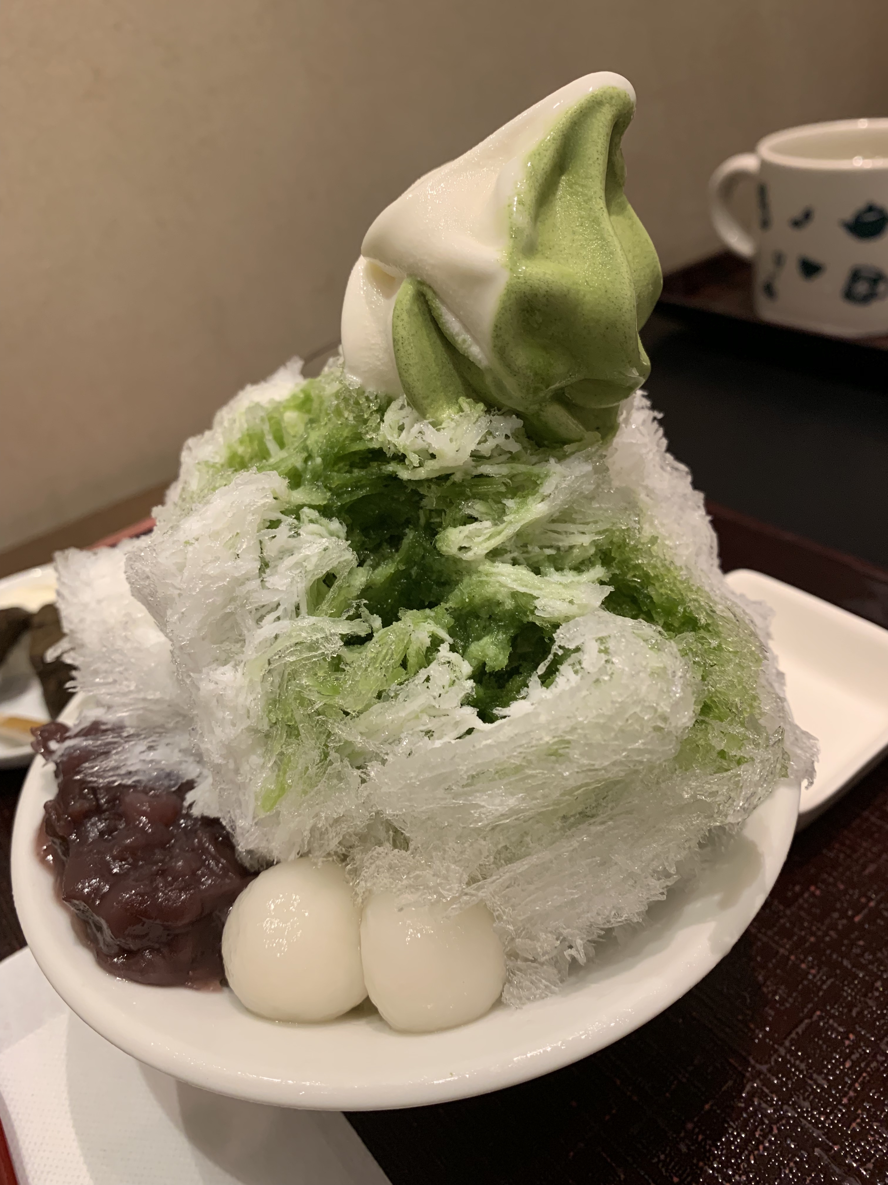 京都の最高気温は38度。暑いのは☀️覚悟で長女の所へ荷物を届けに行きました。そのついでに、京都駅ビルの甘味処、中村藤吉に行きました。以前ウチの紅葉狩り医局旅行でも行った店です。行列のできる店なので開店30分前に並びました。11:00開店。もちろん1番です。いつもは抹茶パフェを食べるのですが、今日は暑い夏にふさわしい抹茶かき氷セット🍧にしました。かき氷の上に抹茶とバニラアイス、濃厚な抹茶のシロップをかけながらスプーンですくって雅🥄に食べます。白玉、あんこ、いい感じです。抹茶ゼリー、白玉、あんこの盛り合わせ。最高でした。名脇役としてチョコレートのケーキ、イイ味出してます。とても贅沢な時間を過ごしました。