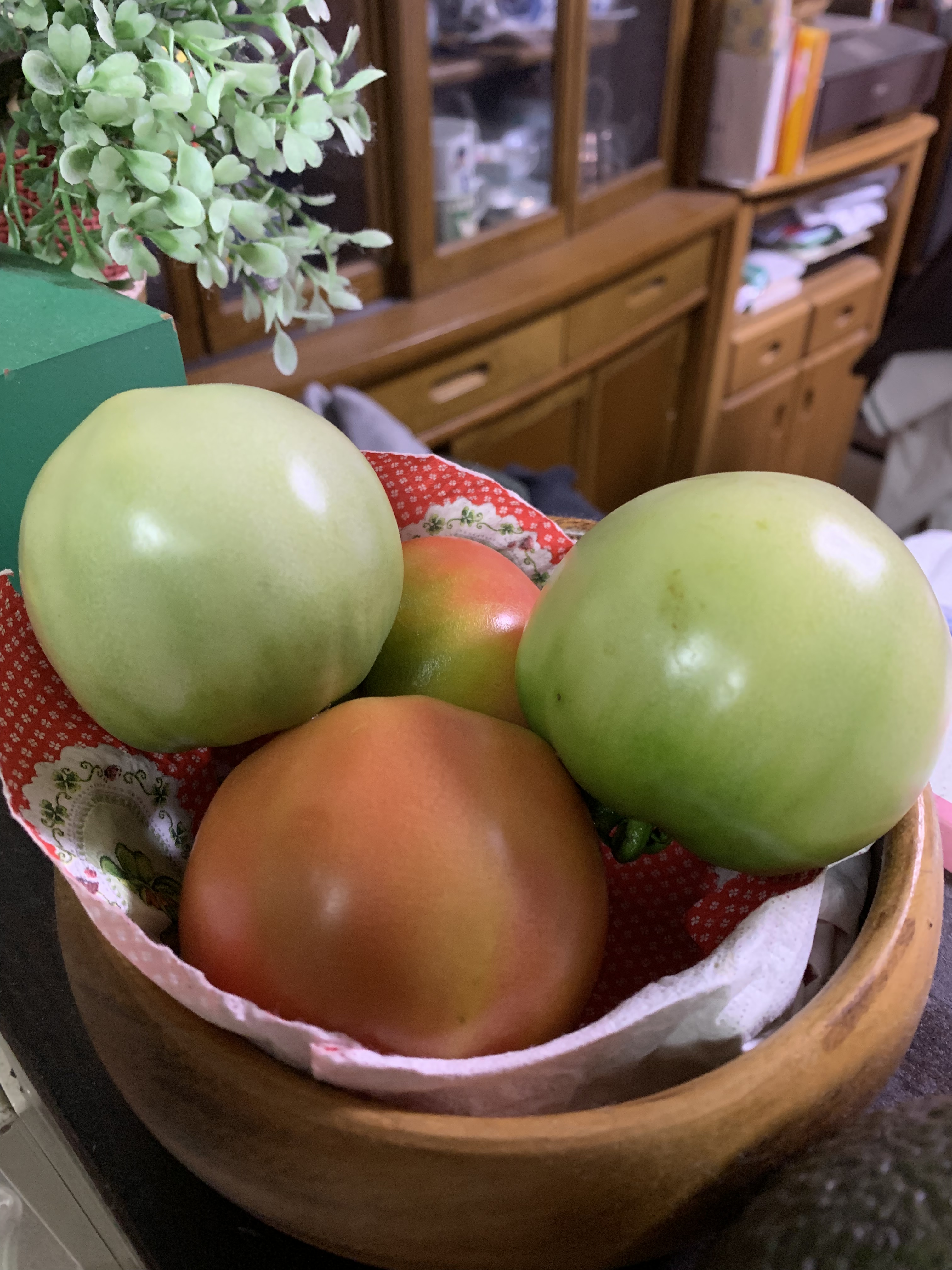 翌朝、庭のトマトの一部が茎から折れていました。残念ながら青いままで7個のトマトを収穫しました。青いトマトの食べ方を調べるとグリーントマトフライという料理がアメリカ南部にありました。ハワイの料理でもありました。青いトマトを4つに輪切りにスライスし、フライを揚げる様に調理します。塩🧂を振りかけて食べると、これが意外や意外、とても美味しかったです。青いトマトは沢山食べすぎると毒があると書いてありましたが、今のところば大丈夫です。