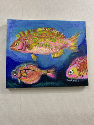 先日に、ひまわりの🌻絵てがみを描いてくれた患者さんの駿君が、今度は油絵を描いてきてくれました。鮮やかな色彩の魚🐟の絵🖼です。プロ顔負けの超大作です。受付の壁に展示させてもらいました。色鮮やかに泳ぐ魚🐟の絵は受付の壁をオーストラリア🇦🇺のグレートバリアリーフのサンゴ礁の海🏖に変えてくれているようでした。駿君は新しい作品が完成したら「さかえ歯科ギャラリー」に展示してくれると約束してくれました。