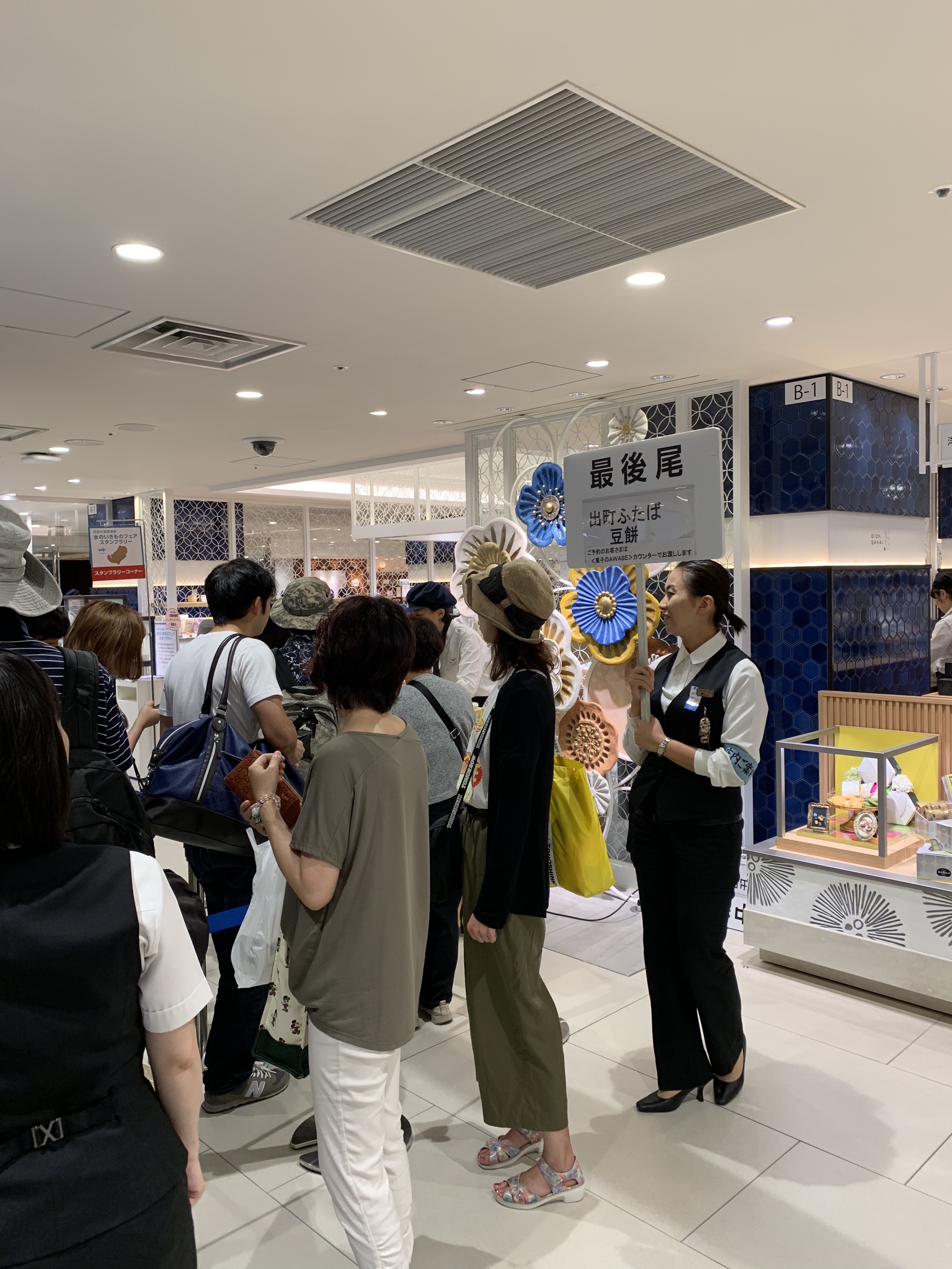 お土産に、抹茶ゼリーを買いました。次のミッションは、昨日テレビで的場浩司さんが絶賛していた「洛匠」のわらび餅を購入する事です。伊勢丹の和菓子売場で抹茶味と、プレーン味の2種類を買いました。そして、12:00に時間指定で販売の「出町ふたば」の豆餅を販売30分前に並んで買いました。出町柳の本店ではかなり長い行列ができるそうです。