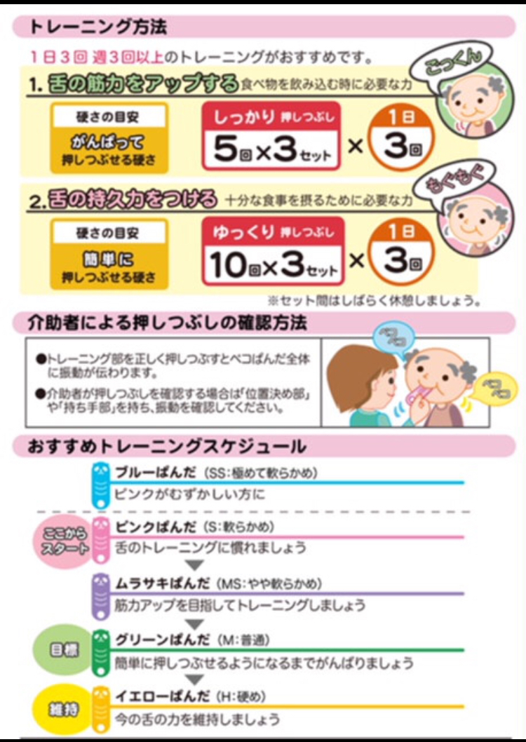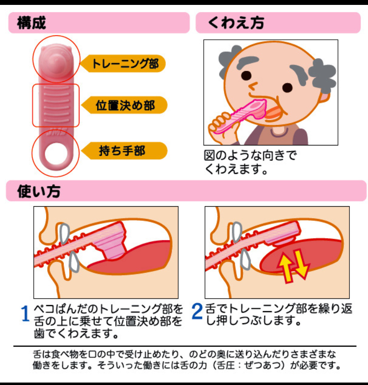 このような症状があり、嚥下障害が認められる場合は舌👅のトレーニングが必要です。つまり嚥下機能(食べ物を飲み込む働き)は、舌の運動機能と深く関係しています。スムーズに食べ物を飲み込んで安全に食事ができるよう、舌の筋力を強化する必要があります。