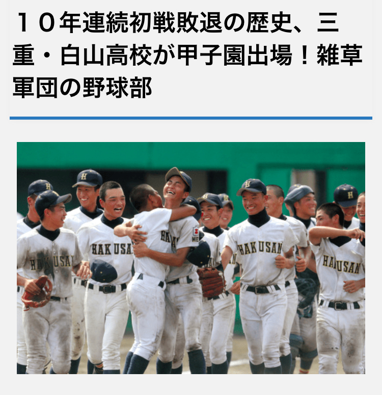夏の風物詩 甲子園 。高校野球の熱戦が繰り広げられています。わが三重県代表は白山高校です。白山高校の野球部は創部が1960年です。奇しくも、私と同い年なのです。夏の三重大会では07年から10年連続初戦敗退だったのです。五年前は部員五人で連合チームでの参加だったそうです。部員はグランドの草むしりをし、部活動費用を得る為に地元の郵便局で年賀状🏣の仕分けをしていたそうです。今春四強の三重高を破っての大快挙の甲子園出場です。嬉しさのあまりか部長の川本牧子先生は甲子園球場見学会の時に入ってはいけないバッターボックスに入り、バットスイングして注意をされました。メンバーの殆どが三重県出身です。練習グランドは甲子園球場と同じくらいの広さらしいです。田舎なので敷地が広くとれるようです。私の中では、映画化🎬決定です。主題歌はG R eeeenにさせてください。知っているかもしれませんが、GR eeeenは4人の歯科医師で構成されています。メディアには活動の都合上、顔は出していません。内緒🤫ですよ。実は右から2番目が私なのです。むかって。本人が言うのだから間違いありません。くれぐれも絶対に他言してはいけませんよ。