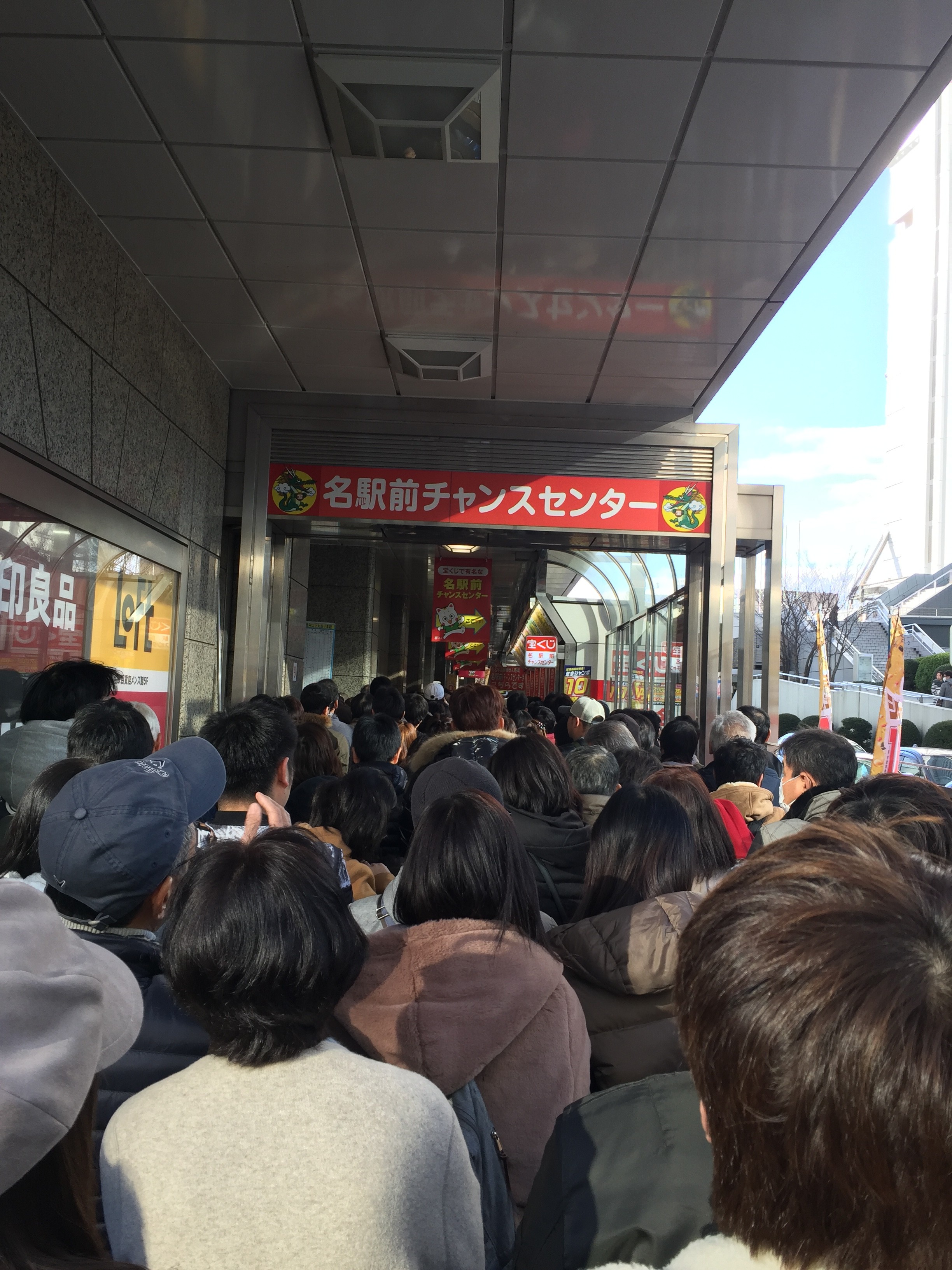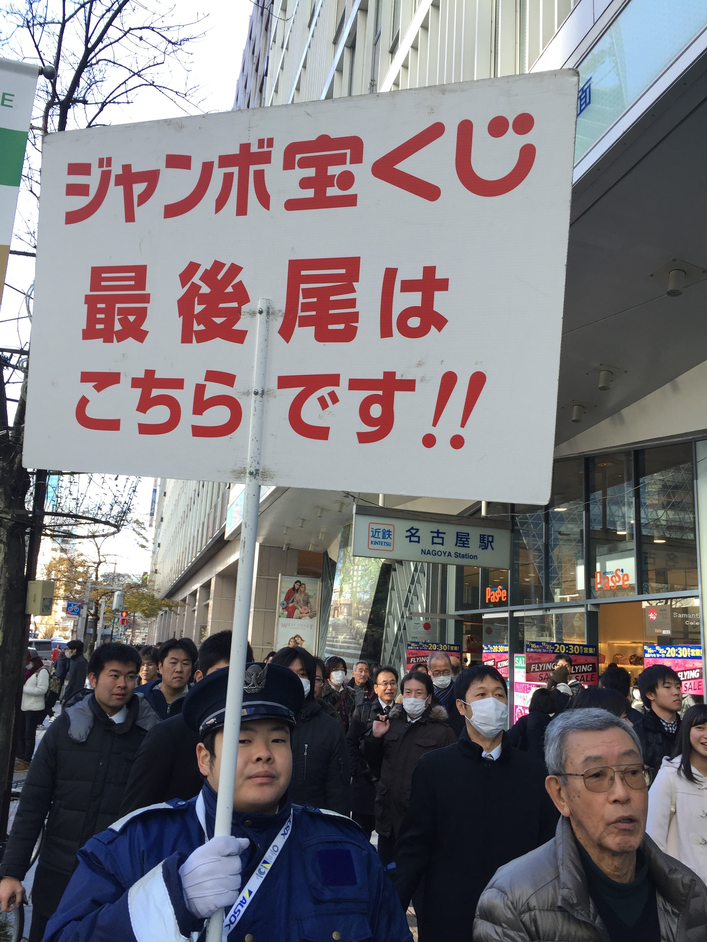 年末の風物詩 年末ジャンボ宝くじ。高額当選がよく出る売り場、名古屋チャンスセンターに夢を買いに行きました。一等前後賞合わせて10億円の夢です。近鉄で名古屋に着き、チャンスセンターに向かいました。すごい行列ができてました。最後尾の看板が遙か彼方に見えるほどでした。早速、列に並びました。並んでいると色んな会話が聞こえて来ます。前に並んでいた20代後半の女性二人組の会話ですが、「ジャンボ10億円は難しそうだから、ミニだと7000万当たりが多そうだからそれにする?」と友達に言うと、「7000万かぁ、中途半端やなぁ。車🚗買ったら終わりやん。」「えっ?」私は、その彼女はどんな車に乗ってるのか尋ねたい聞きたいくらいでした。後ろで待ってたおばあちゃん👵は、「一枚いくらするの?」と言ってました。おばあちゃんのあまりにも少な過ぎる情報量にビックリしました。並んでいる歩道の反対側のビルには、GUCCI、ロエベ、CHANELなどの高級ブティックのロゴや広告が、当選発表が済んだらおいでよ言っている様でした。色んなことを考えでいるうちに、列は進んでいきました。20分位並んでから私の順番になりました。何番の窓口で買おうかなと迷ってる間もありませんでした。膨よかなおばちゃんの売り子さんに、心の中で「10億円の引換券下さい。」と言いました。