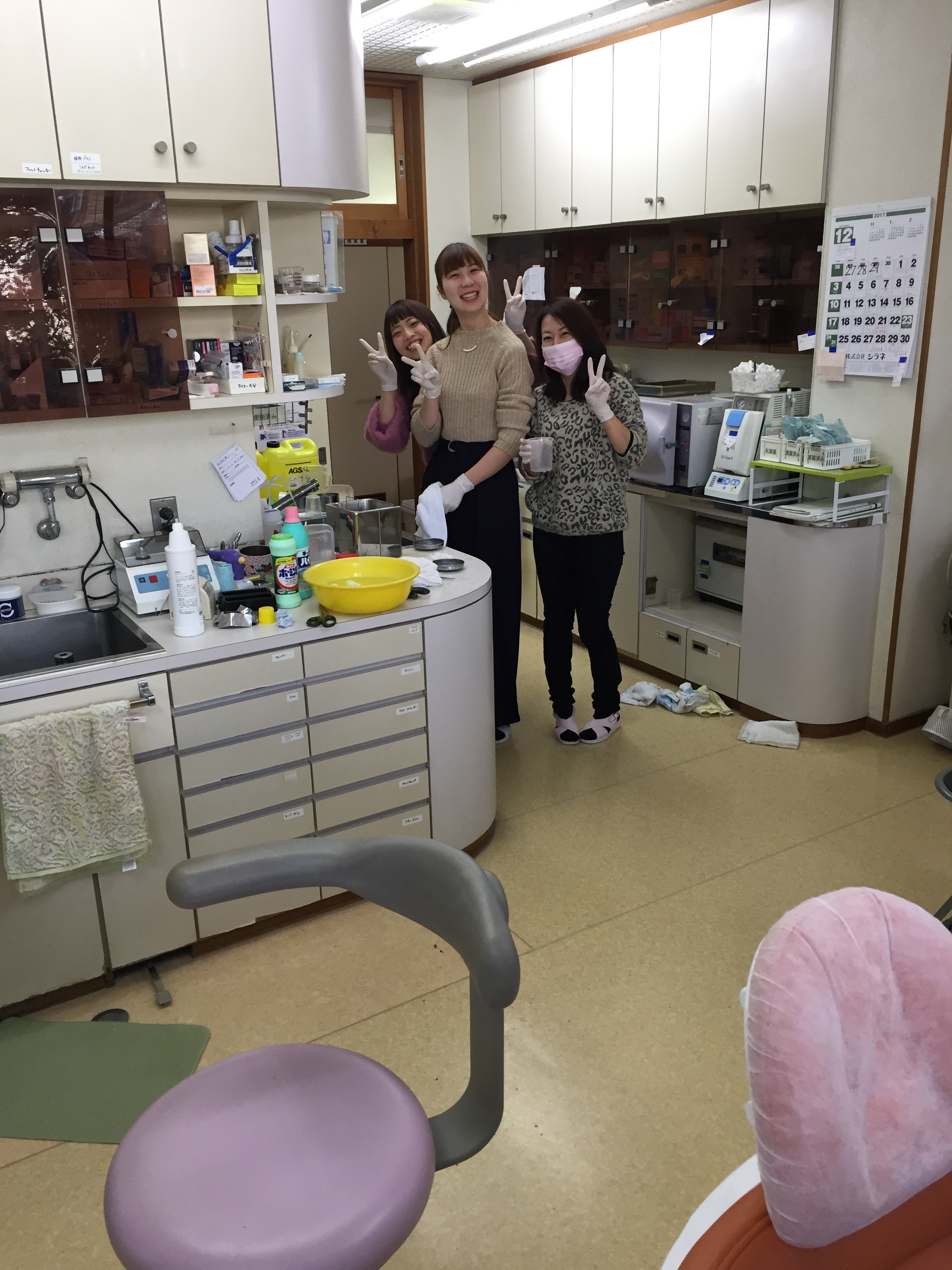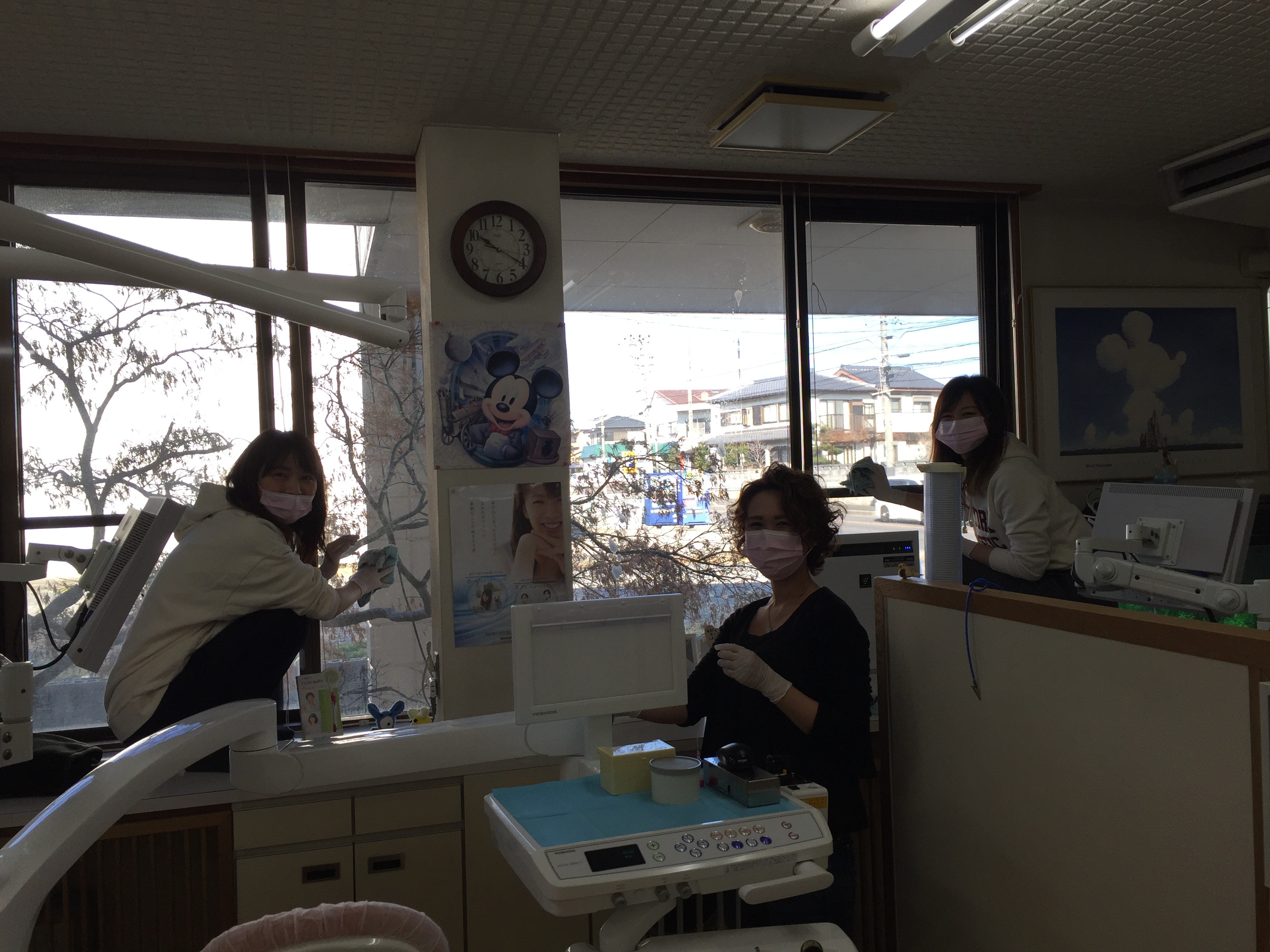 今日は、さかえ歯科の大掃除です。私の担当は水槽の掃除です。これが意外と時間がかかるのです。水槽の中の砂を洗い、水草の装飾やガラスについたコケを綺麗に取り除きます。そして濾過装置のフィルターを交換して完了です。その間スタッフは各々の担当を決め、手際良く診療室をきれいにしていました。棚の上にのって窓拭きをしている様子は、まるでキャッツ・アイの様です。掃除をしている時も、いつもの様に仲良しです。
