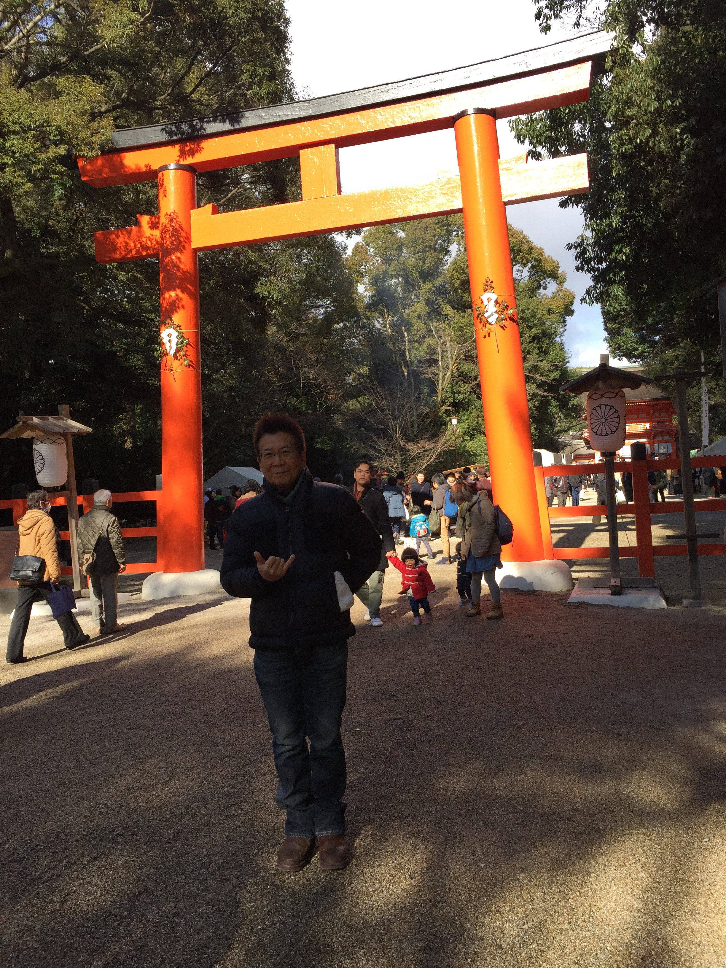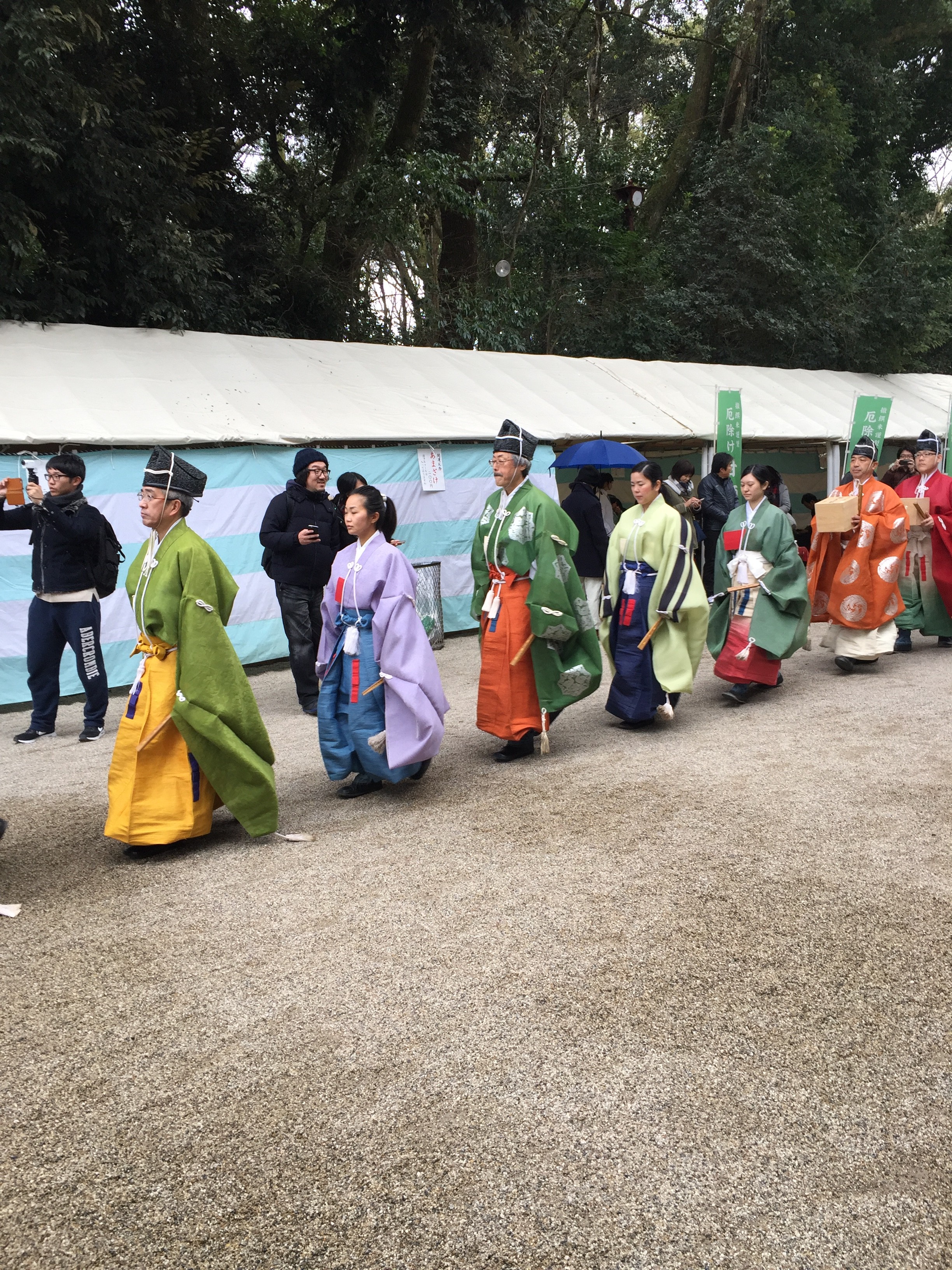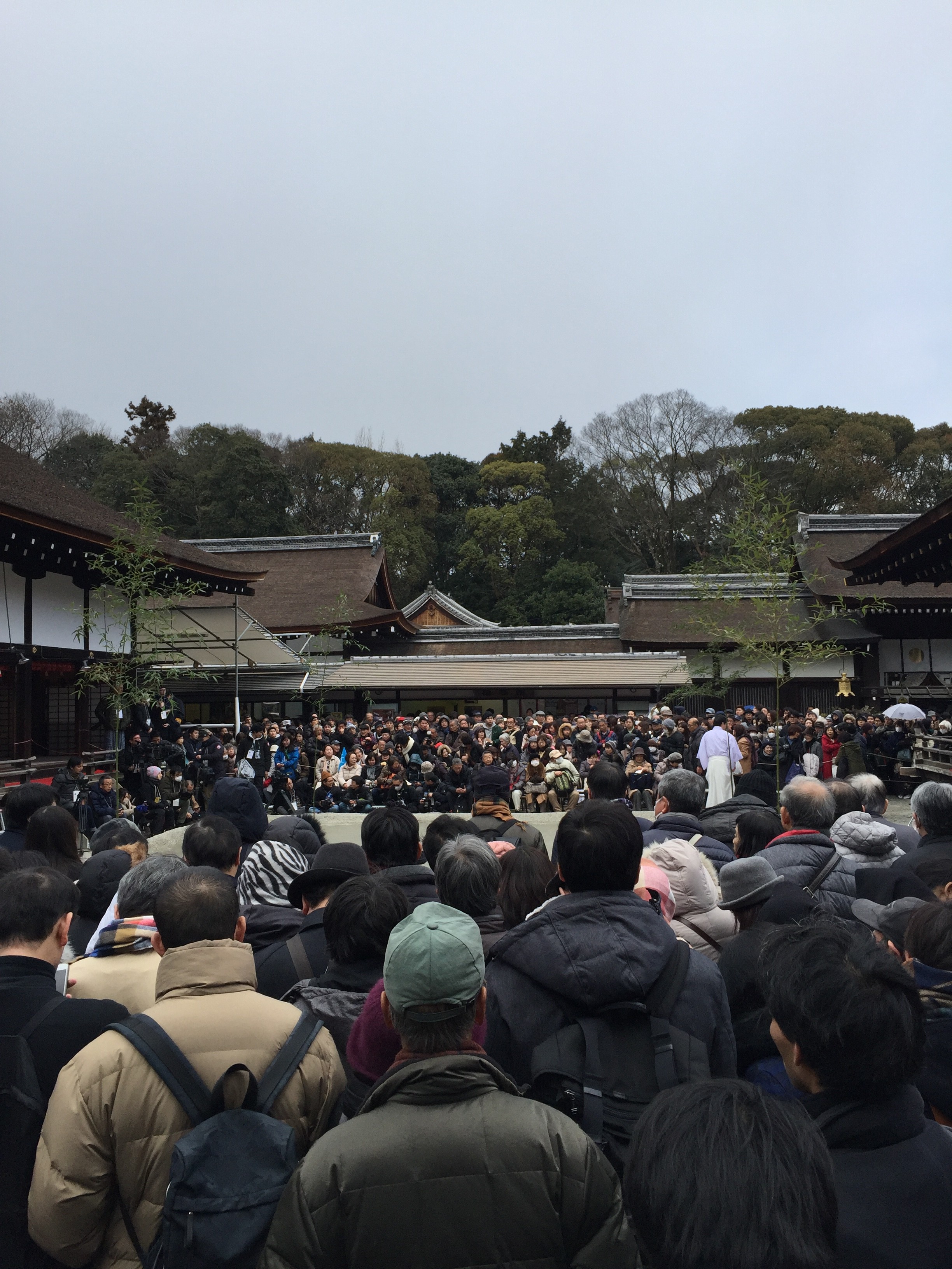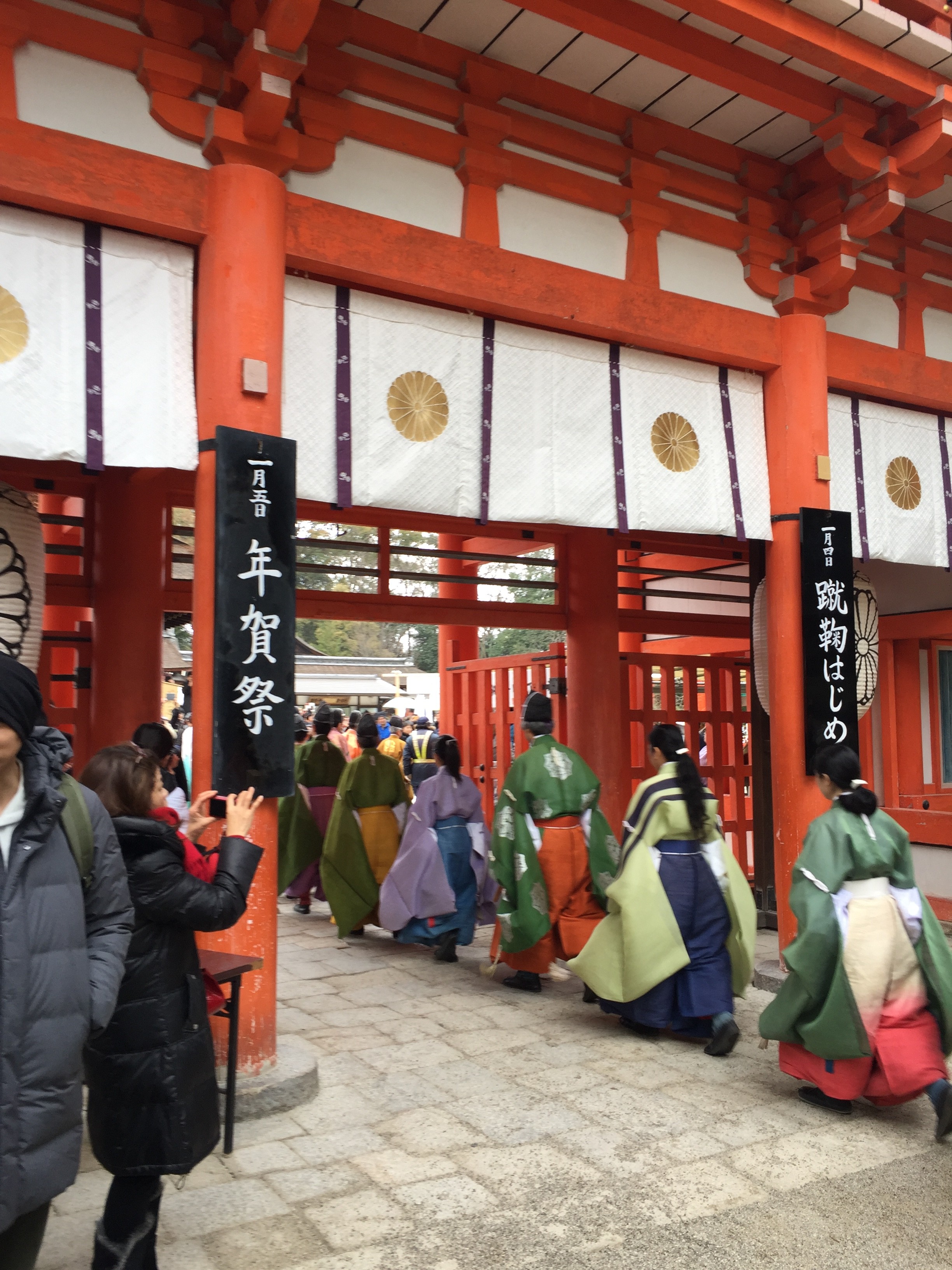 本殿に着き、御賽銭はいつもの15円です。手を合わせて願をかけました。流石の世界遺産です。立派な本殿でした。境内には、初蹴鞠の会場が設置されていました。蹴鞠を見ることは出来ませんでしたが、艶やかな古の衣装に身を包んだケマラー(蹴鞠をする人)の入場行進を見ることができました。