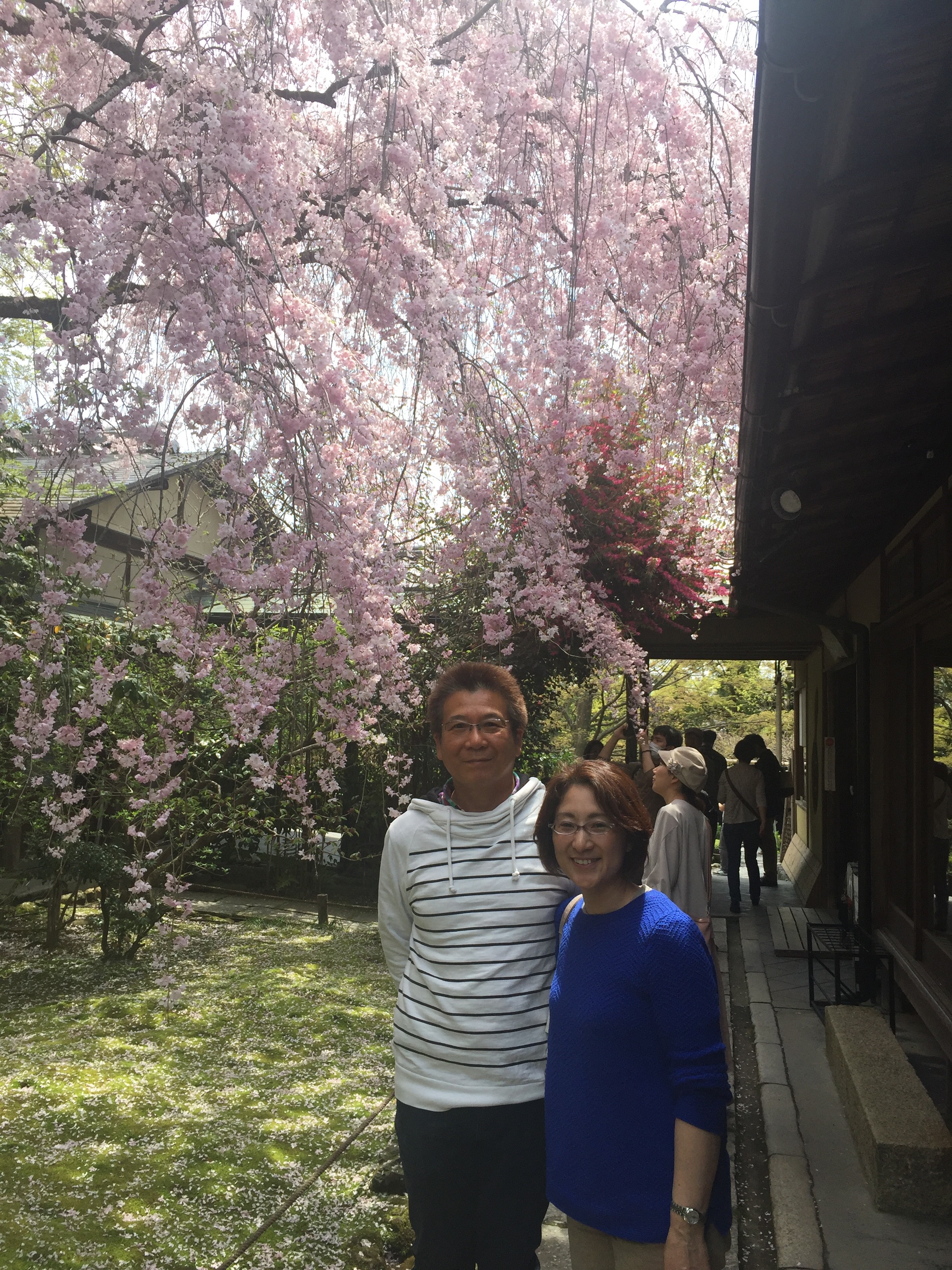 また、退蔵院の庭のしだれ桜にも感動しました。その美しさをカメラ📷の中に何とか収めようと何度もシャッターを押すのですが、その美しさをそのまま収める事は不可能でした。それくらい綺麗でした。久しぶりの嫁さんとのデートだったので、二人のツーショットの写真を若いカップルに頼んで撮ってもらいました。とても自然に撮れていました。そのお返しに、その二人の写真を撮ってあげようとしたら嫁さんが彼氏の隣に入ろうとするではありませんか、「魔除けになるかもね。」私は言ったらその二人の表情も和んで、とてもいい写真が撮れて喜んでいました。別れ際に「お幸せにねっ!」と言うと彼女の頬が満開の桜🌸の花の色の様にうっすらと赤くなった様に見えました。なんか、とてもいい事をしたような気がしました。ひょっとしたら、その後に彼が告白したりして。という妄想も抱きました。サクラ満開の妙心寺での”ラブストーリーは突然に、"でした。