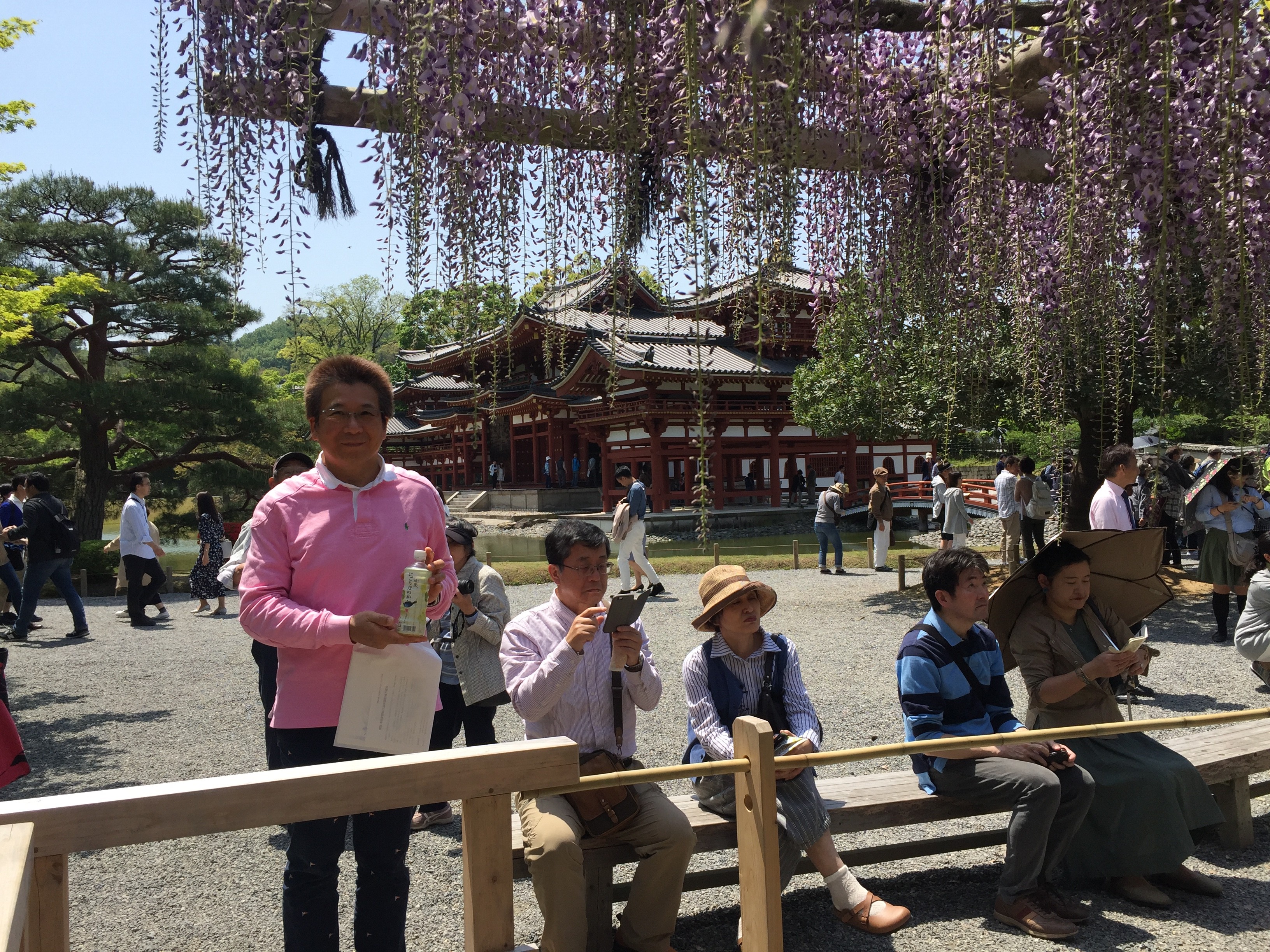 平等院の藤の花は満開間近でした。平等院は約1000年前に建立されたものです。最近、修復されたものですが遠い昔から、そこにずっとあると思うと感慨深いものでした。藤の花の浅い紫色の優雅に垂れさがった様は、とても綺麗でした。平等院ミュージアムの仏像の展示を染み染みと鑑賞し、藤棚の下で記念撮影しました。