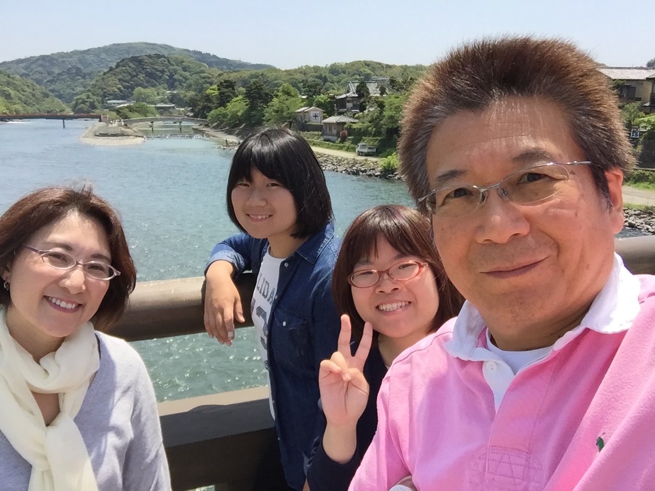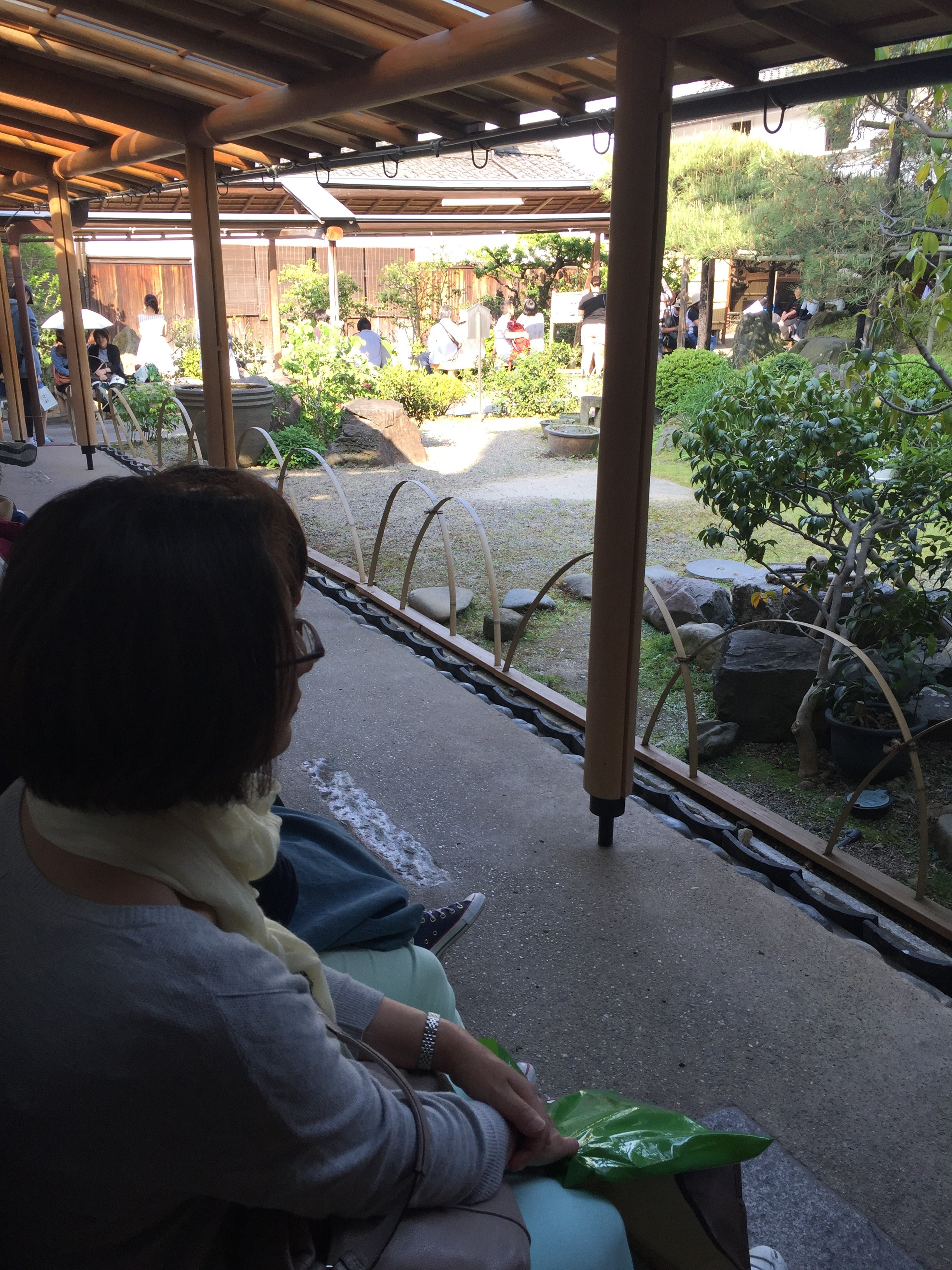 次に宇治橋を渡り宇治上神社を詣りました。沢山歩いたのでお腹もかなり空いて来たので、もう一つの目的地の抹茶パフェ部門一位🥇の中村藤吉の本店に向かいました。お店の表のたたずまいは流石、中村藤吉です。暖簾をくぐると中庭に立派な樹齢何年かと思われる松が圧巻でした。順番待ちのノート📓に名前を書くと172番です。因みに、その時点に通されているのが90番でした。中庭の見える少し日陰の腰掛けに家族四人が仲良くすずめの親子がとまっているみたいに座り、ペチャクチャと近況報告会が始まりました。時々、お土産物コーナーから「今人気の、抹茶のパイの試食いかがですか〜。」と、お姉さんの呼ぶ声が聞こえてくると、「お姉さんが呼んどるで、行ってくるわぁ!」と緊急体制のごとく、交代で店内に入り、そこからは少しだけ、いやらしさがあるので偶然を装って試食するのです。一枚200円のパイを二枚頂きました。パイは購入しませんでしたが、抹茶ゼリーをお土産に買いました。なんだかんだで時間が過ぎました。待つ事、2時間「お待たせしました〜。172番のサカエさま〜!」と、合格発表のようにコール!「ハイッ!」と榮家の人々。店内に誘導され、立派なお庭が見える席に着きました。注文は、絶対お勧めの抹茶ゼリーです。美味!2時間待った甲斐がありました。