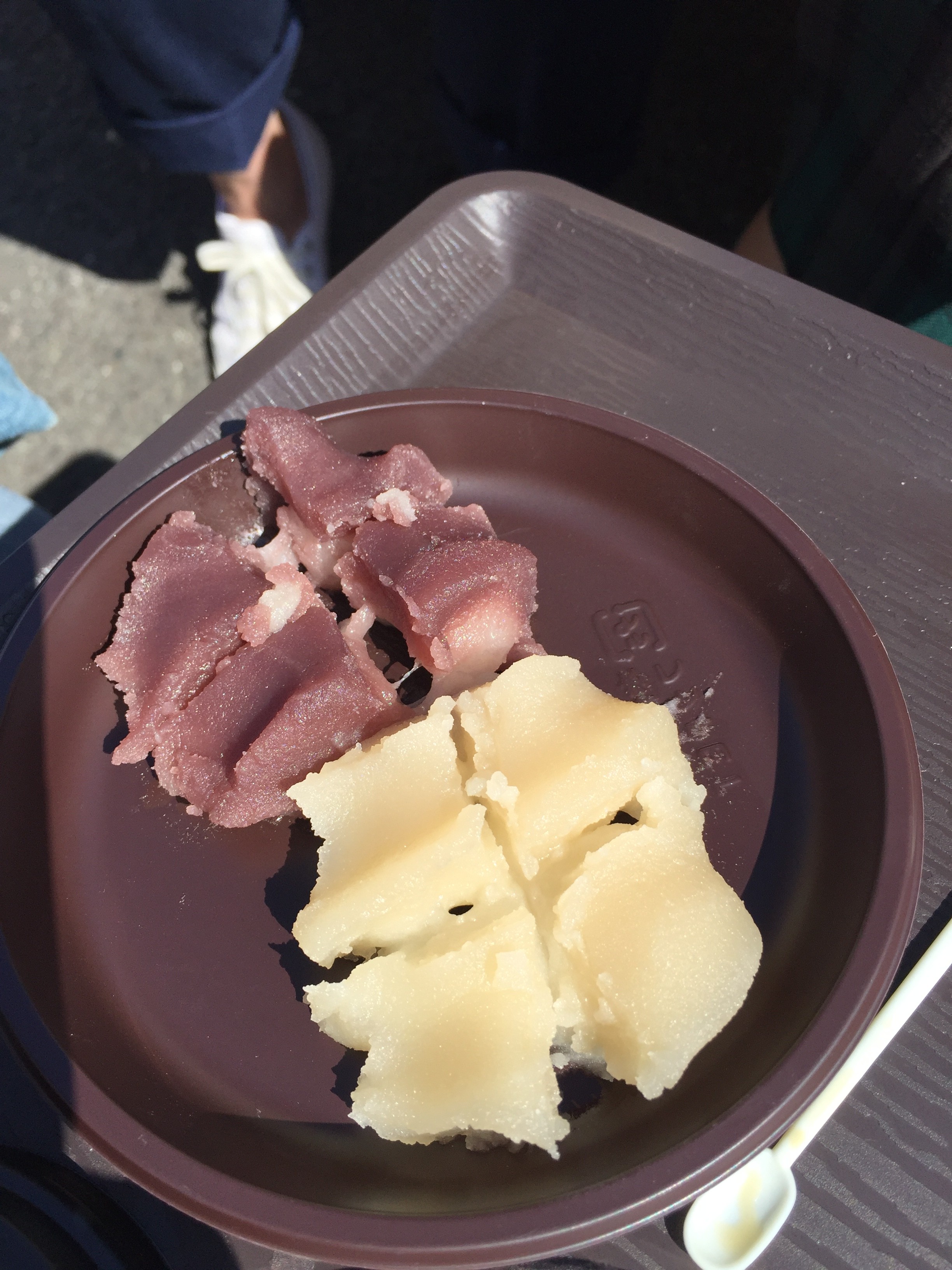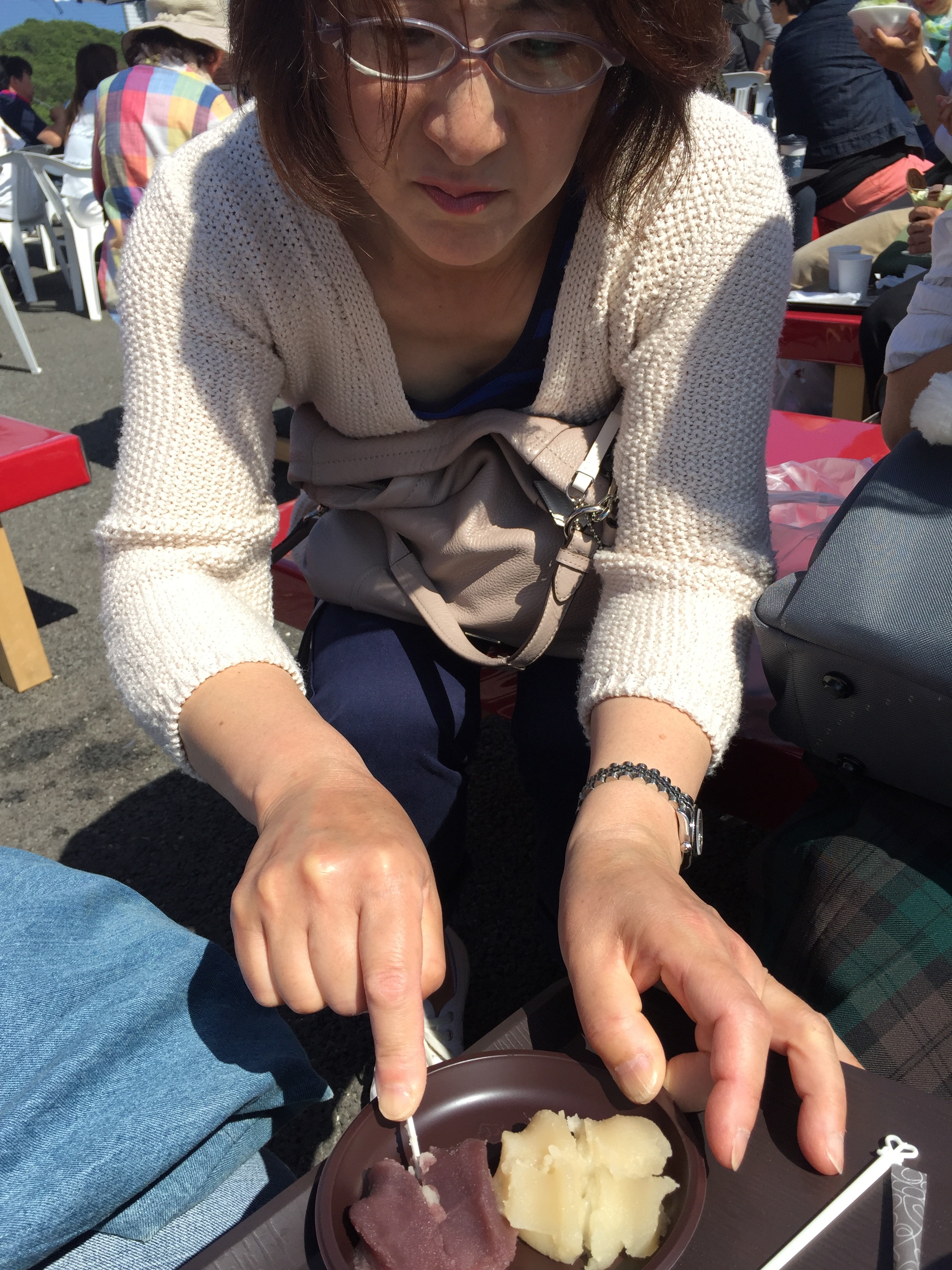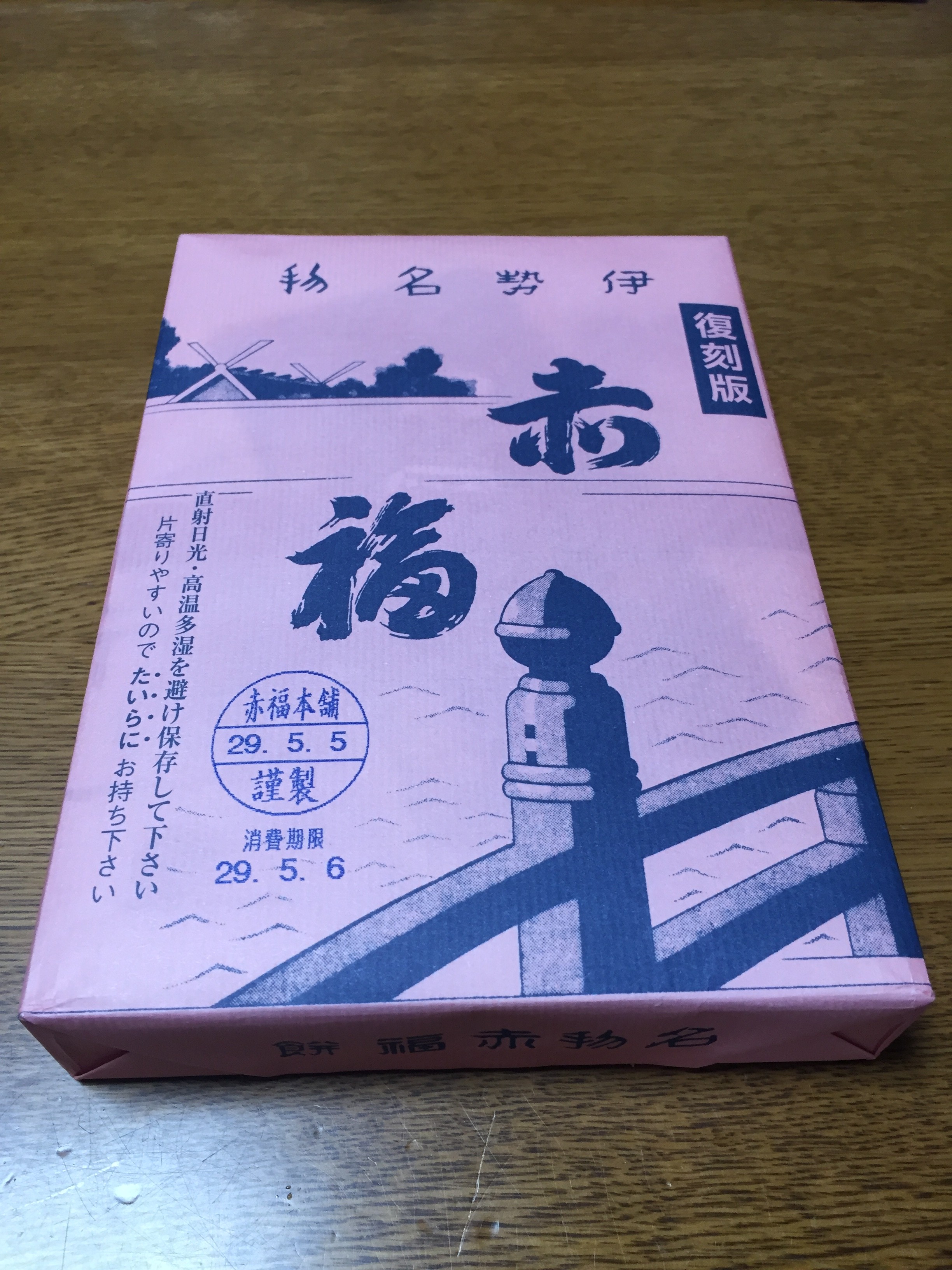 5月5日こどもの日、お伊勢さん菓子博2017に行きました。午前中に急患さんが入ったので、午後から近鉄電車🚃で五十鈴川駅まで行きシャトルバスで会場の三重県営サンアリーナに行きました。入場すると赤福の抽選券が渡され我が家は、祝盆と赤福復刻版が当たりました。聞くと当たったのはラッキーな方だそうです。早速、それぞれを購入しました。祝盆は白あんの赤福と、こしあんの赤福が乗せられているものでした。それぞれの赤福餅を4当分して仲良く食べました。小さくなった赤福に少しさみしい感じがしましたが、とても美味しかったです。それよりも、白あんの赤福は期間限定のプレミアムなので、食べられただけでもラッキーでした。復刻版の赤福餅はパッケージも子供の頃に見たような懐かしさがあり、また味も今のこし餡の味ではなく、黒糖の餡で懐かしくこれもプレミアム感満載でした。
