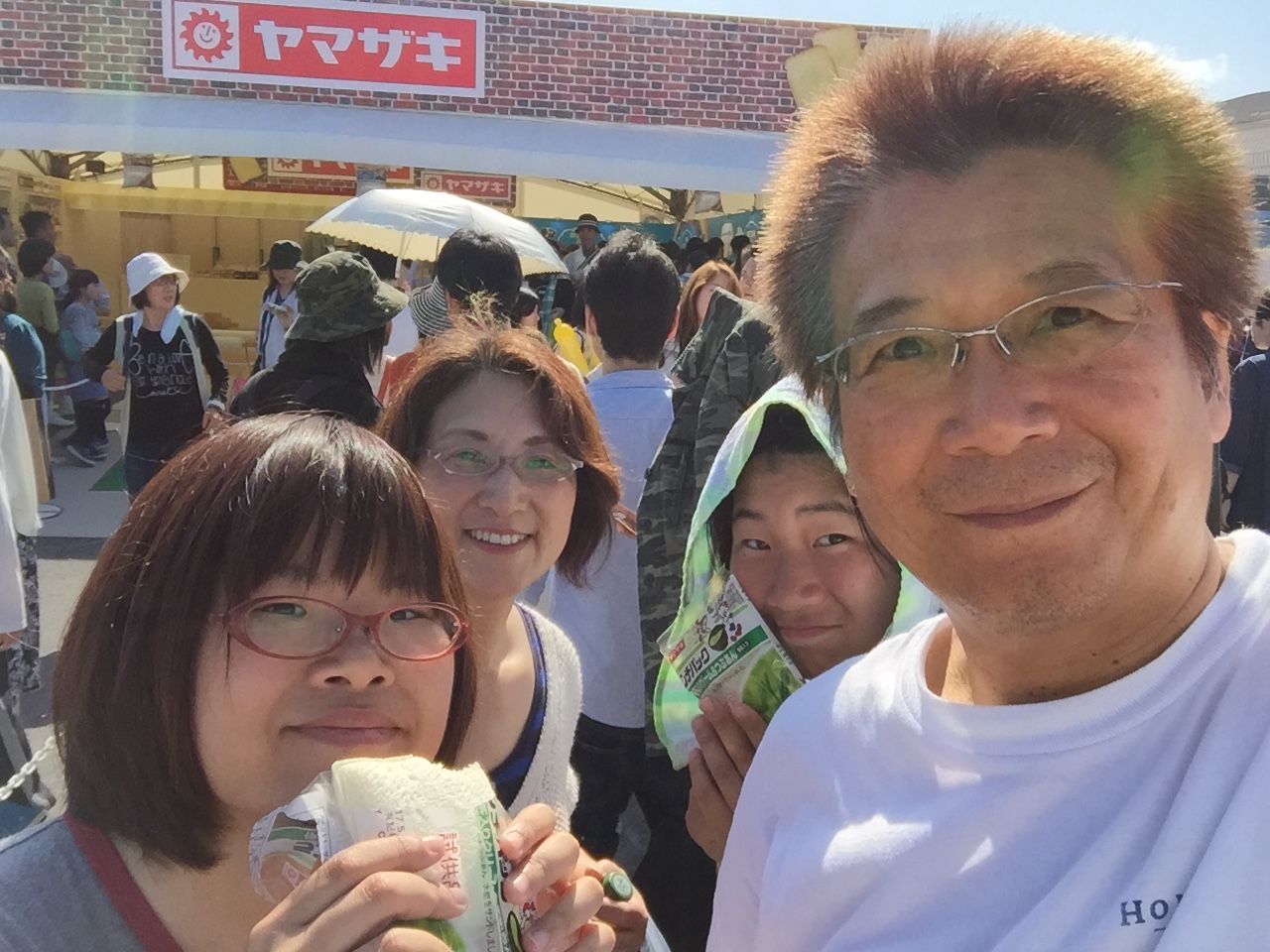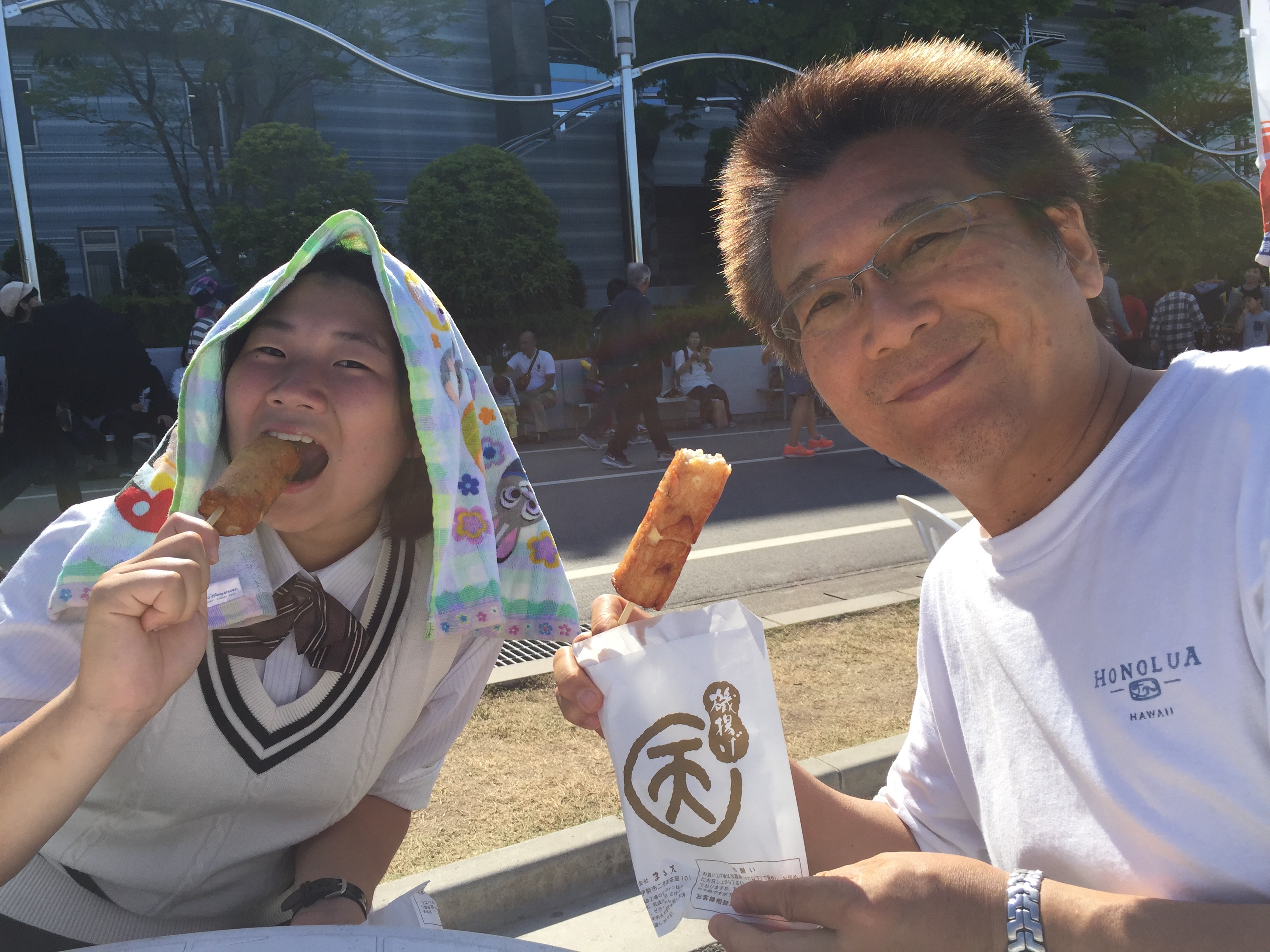 菓子博の会場はゴールデンウィーク真っ只中とあって人でいっぱいでした。お昼ご飯も抜いて沢山の試食をするぞと、意気込んで行ったものの連日の行列に並ぶことに疲れ果て断念する事が不本意ながら多かった様に思えました。しかし、ヤマザキの抹茶とあんこと餅のランチパックの試食には砂漠の中でオアシスを見つけた感じでした。美味しかった!それでも我々のお腹は十分には満たされずにいた時に目の前の現れたのが”まる天”の店です。甘い匂いに誘われた私はカブト虫の歌詞の様に榮家のみんなは、タコ棒、チーズ棒、海老マヨ棒と注文していました。お伊勢さん詣りをする時には、いつもお世話になる”まる天”、この味の安定感は絶対王者です。