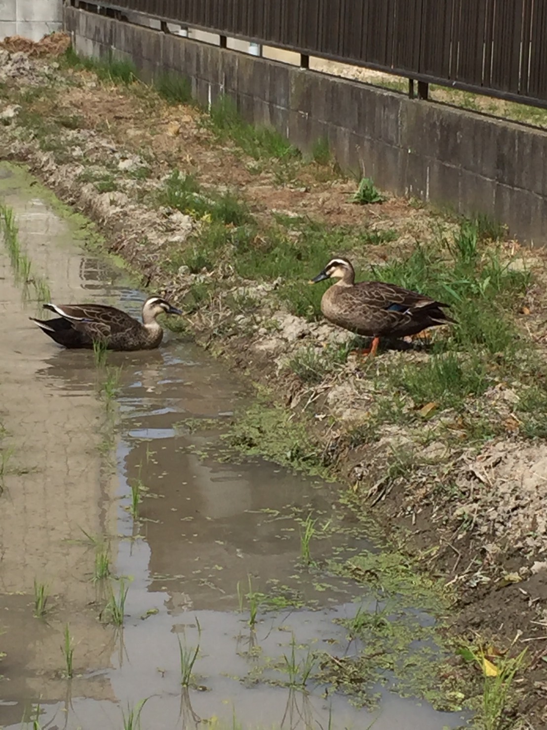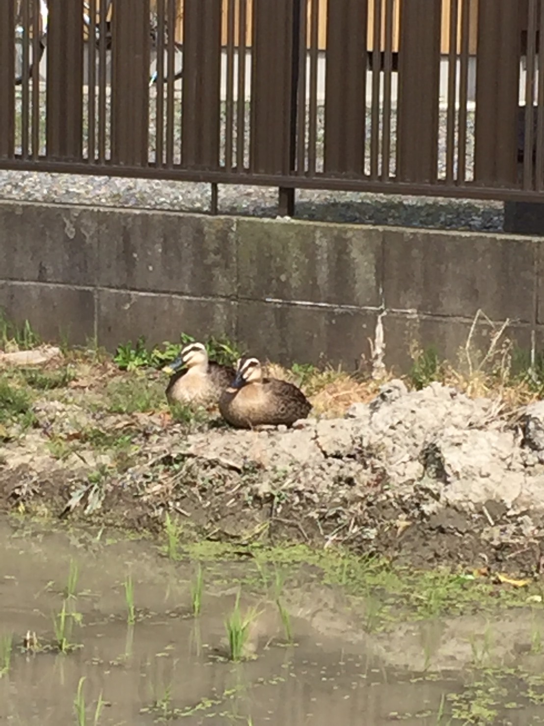 自宅前の田んぼの田植えが終わり、一週間前から鴨のご夫婦がきています。仲よさそうに田んぼの中の虫を食べているようです。のんびりとした光景です。ペタペタと浅い田んぼを歩きながら、二人でクワッ、クワッと何か話しながら楽しそうにも見えます。適当に作業した後はあぜ道に座り込み、ウトウトしています。とても平和です。