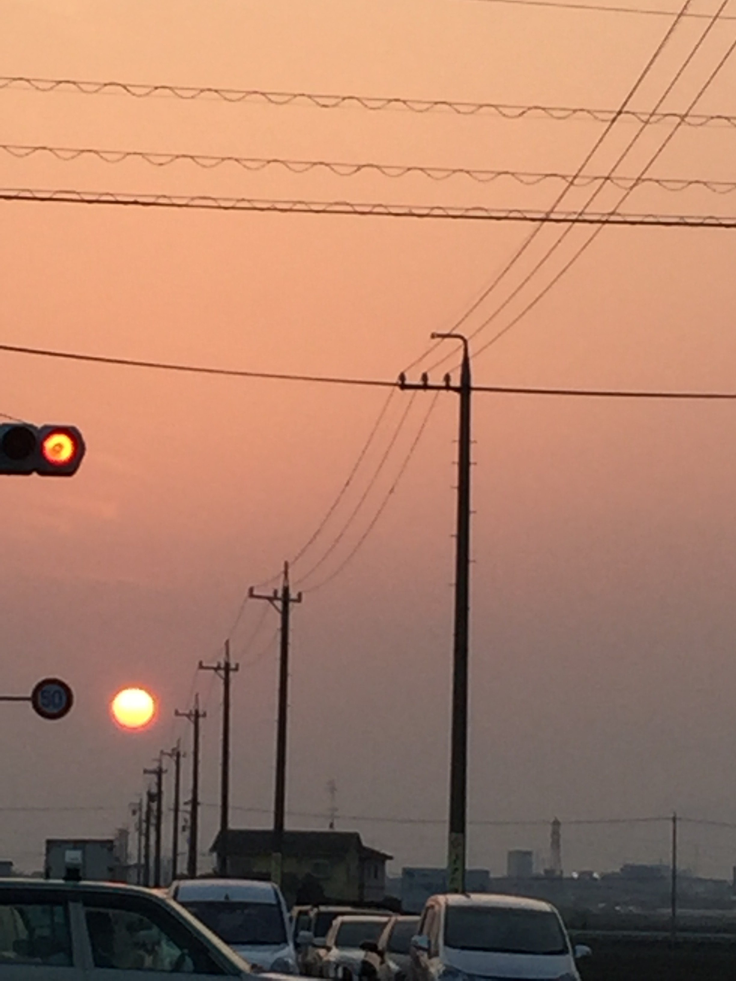 少しセンチメンタルになった所に、真っ赤な夕日がとても綺麗だったので思わずシャッターを押しました。日常の何気ない瞬間に奇跡の一枚が撮れました。丸い夕陽🌞、丸い赤信号🚥、丸い速度標識が同じ大きさです。波打つ電線、間隔が狭くなる電柱などよく見ると、当たり前の風景の中でも間違い探しのクイズの様な風景が隠れています。そんな夕方に🌆、今を生きている事に感謝の気持ちを感じ、今ある平和を大切にしたいと思いました。