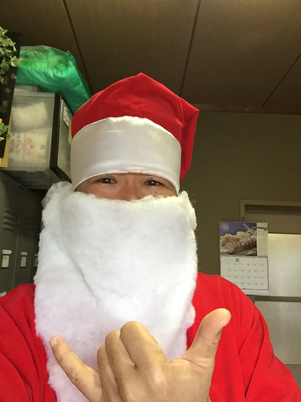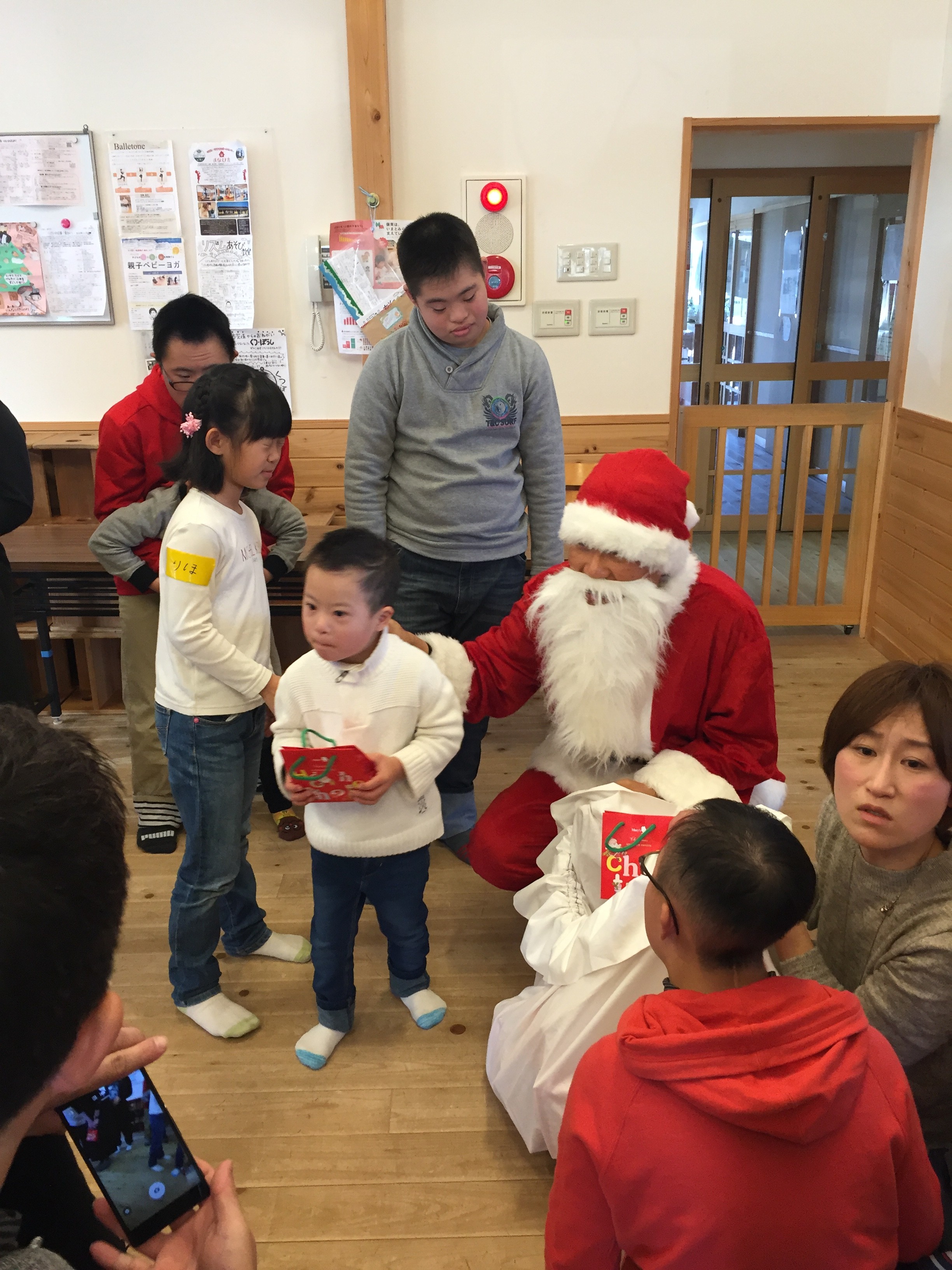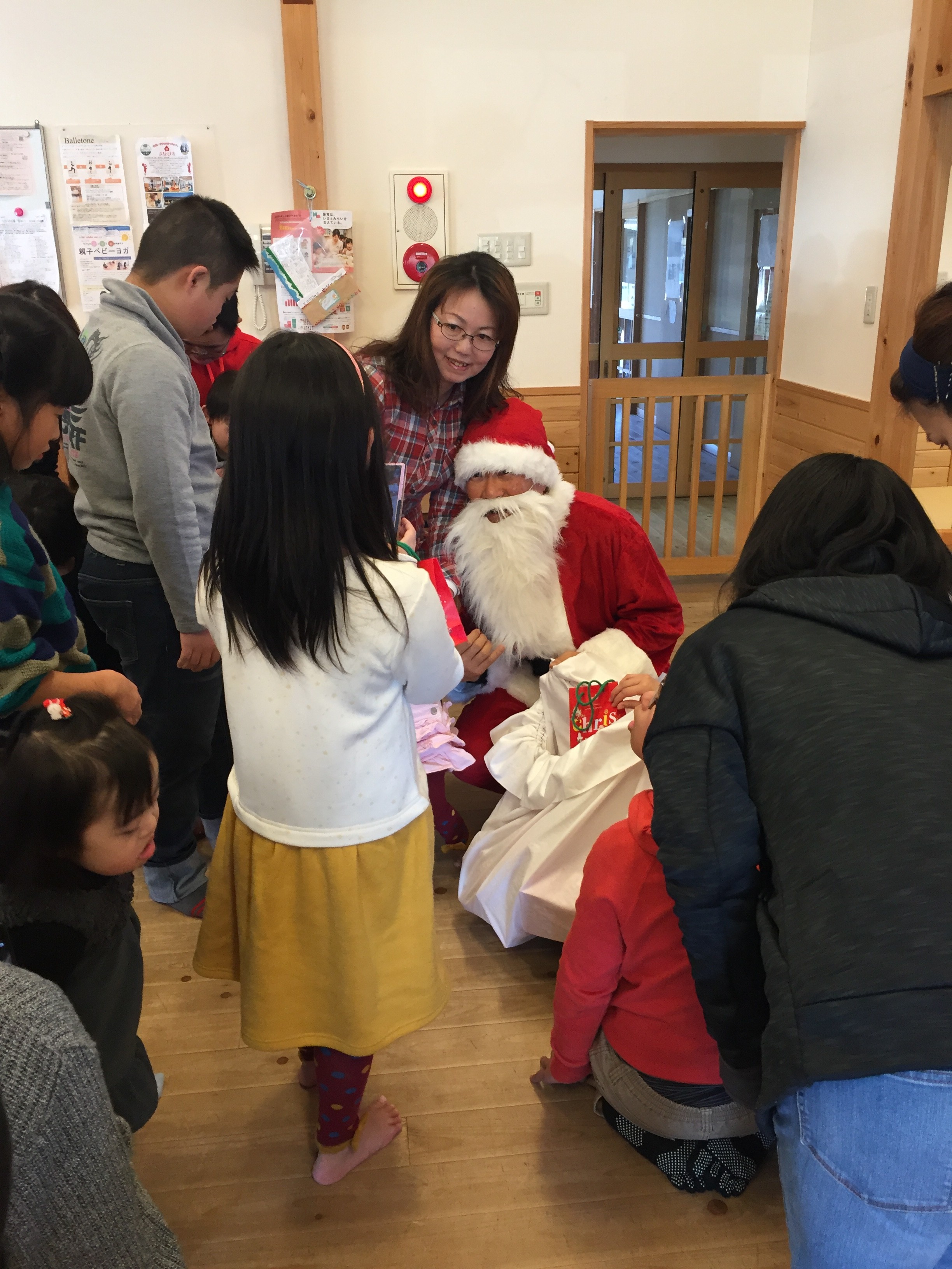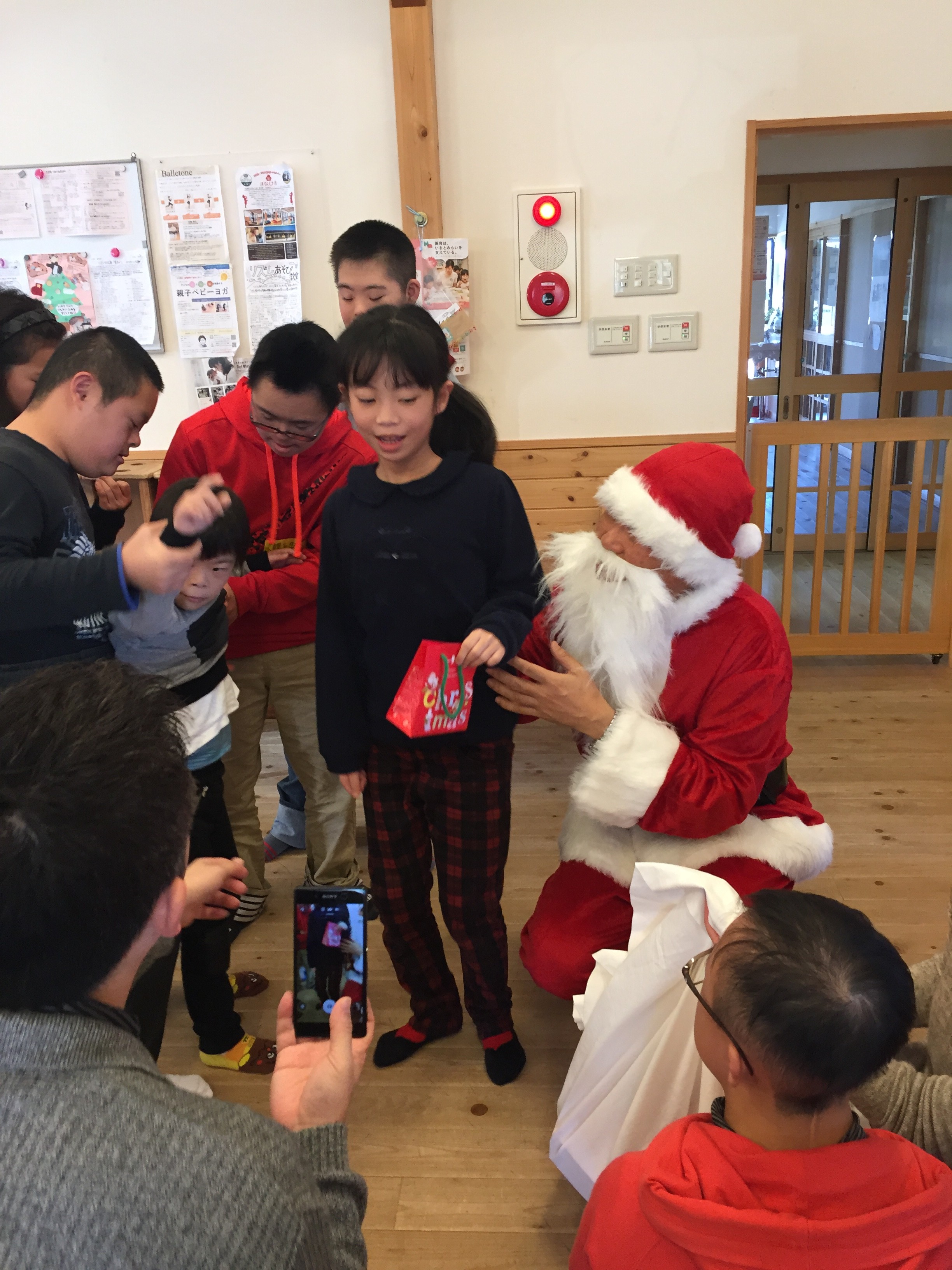マジックショーが終わり、しばらくしていると、体格、背格好が私にそっくりなサンタさんが、大きなプレゼントの入った袋を背負って「フォ、フォ、フォー、良い子にしてたかなぁ!メリークリスマス!」と、大きな声を出しながら登場です。流暢な日本語と、簡単な英語を話しながらプレゼントを子供達に配っていました。写真を求められたら、とてもサービス精神の旺盛なサンタさんはいろんなポーズをしていました。プレゼントを受け取っていた子供たちの目は、とても嬉しそうでした。暖かい日だったので、サンタさんは少し汗をかいていました。衣装のクリーニングのことを気にしていたようでした。プレゼントを配り終わり「いい子にしててね!来年も、また来ます。SEE YOU AGAIN,NEXT YEAR!」と言って帰って行きました。