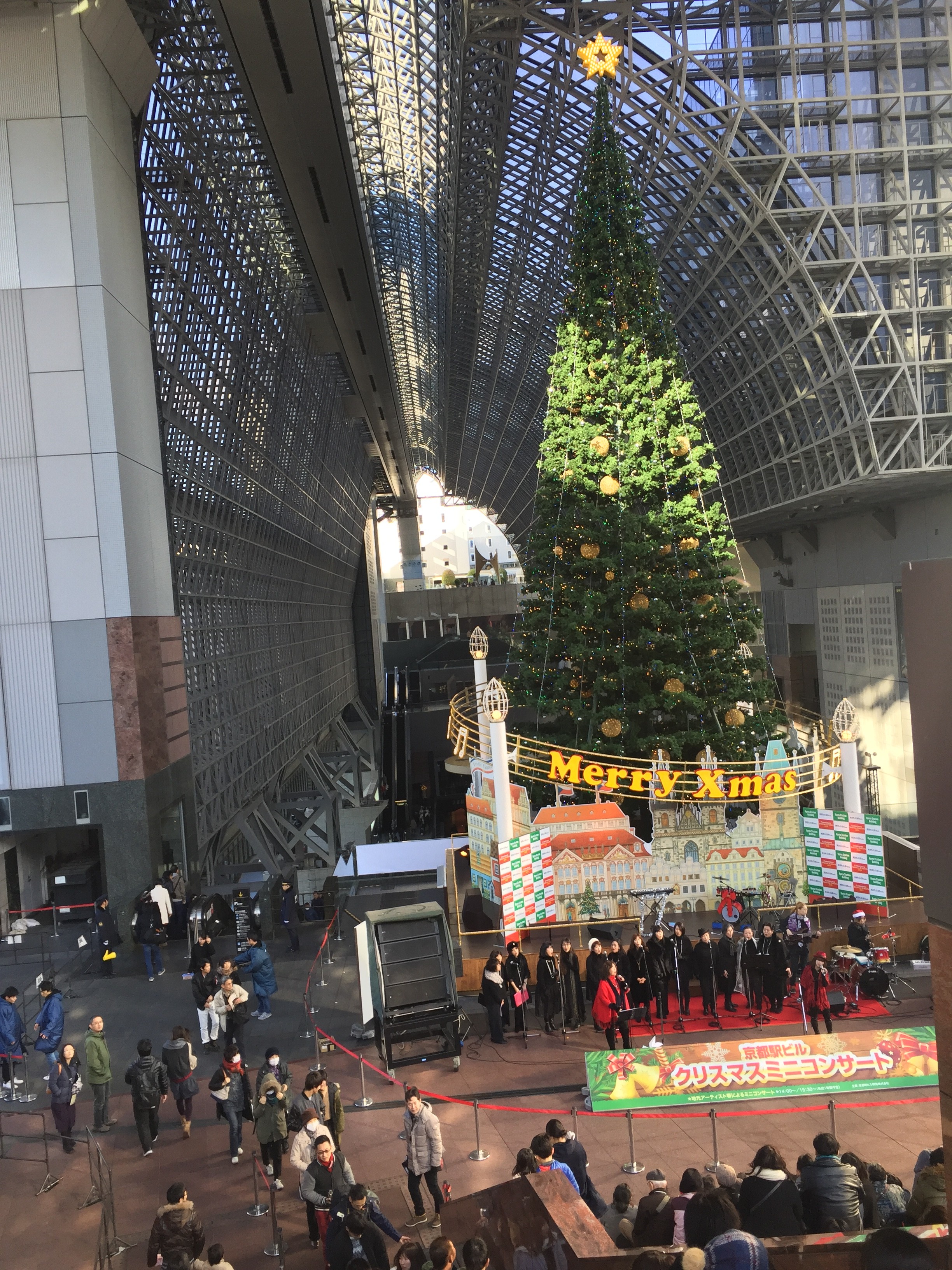 京都の駅ビルはクリスマス一色で巨大なクリスマスツリーの前ではミニコンサートが開かれていました。
