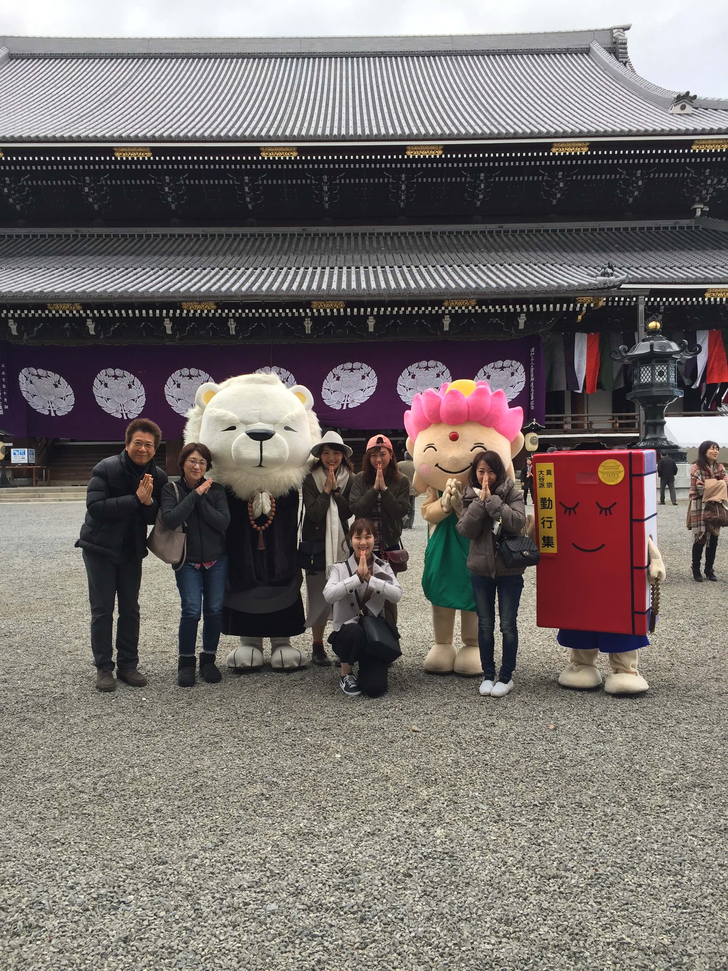 勤労感謝の日の今日、以前から計画していた”京都はんなり紅葉狩り医局旅行”が開催されました。一週間前に作ったてるてる坊主のおかげでしょうか、少し肌寒かったのですが好天に恵まれました。作っておいた旅のしおりを参考にして、ジャーニー オブ さかえ歯科 の始まりです。今回の旅行は二台の車🚘でドライバーは、私と嫁さんが担当しました。am7:30 白子を出発 新名神高速道路を快適なスピードで、お気に入りの”Greeeen”を聴きながら車中の会話も盛り上がり京都に向かいました。そして私がGreeeenのメンバー?で右から(向かって)二番目が私であるとカミングアウトしました。スタッフの誰も信じてくれませんでした。9:10京都に到着し嫁さんと合流。車をパーキングして東本願寺を参りました。その大きさにみんな圧倒され、そして、お坊さんの有難い説法を聞きました。
