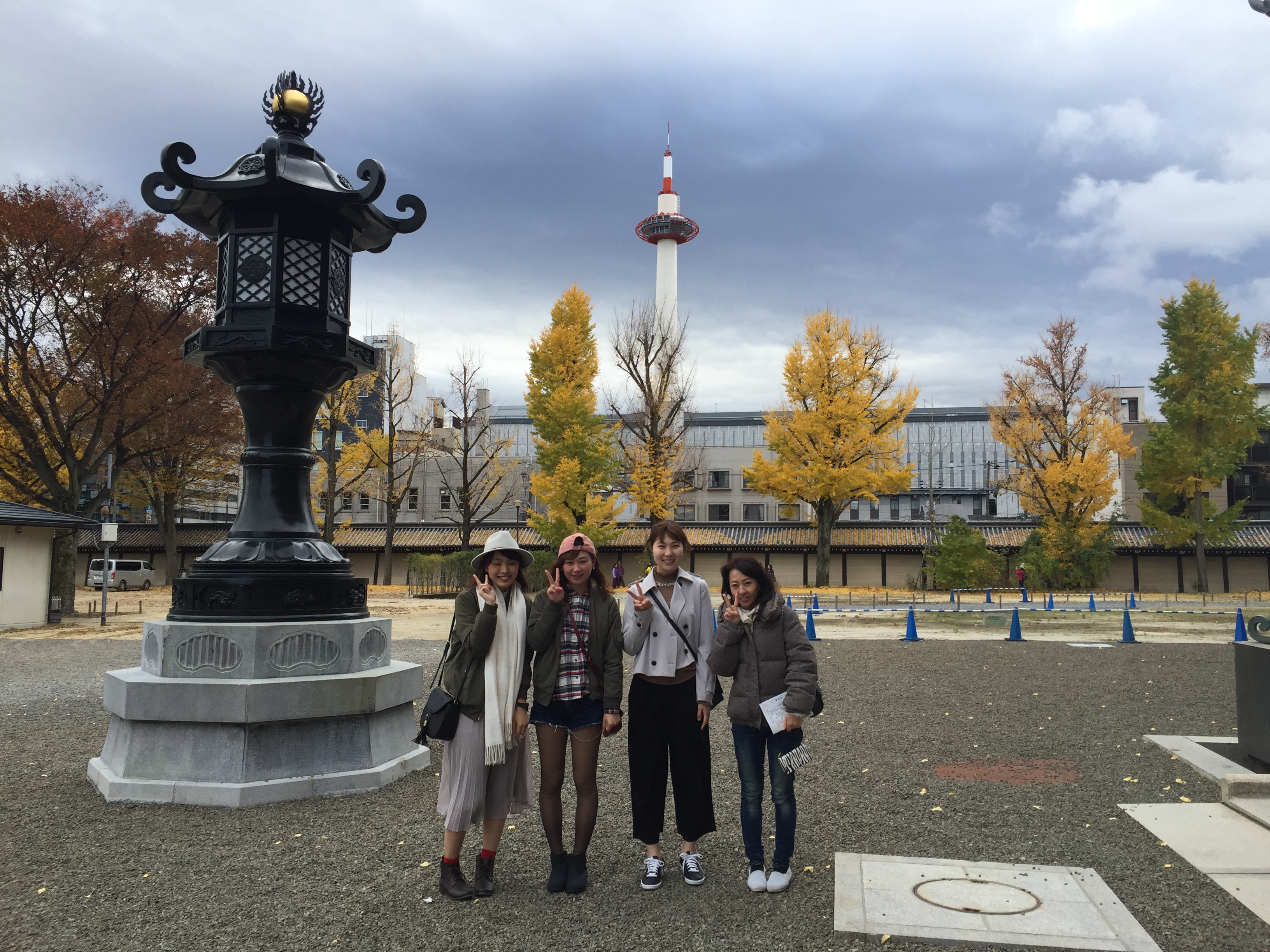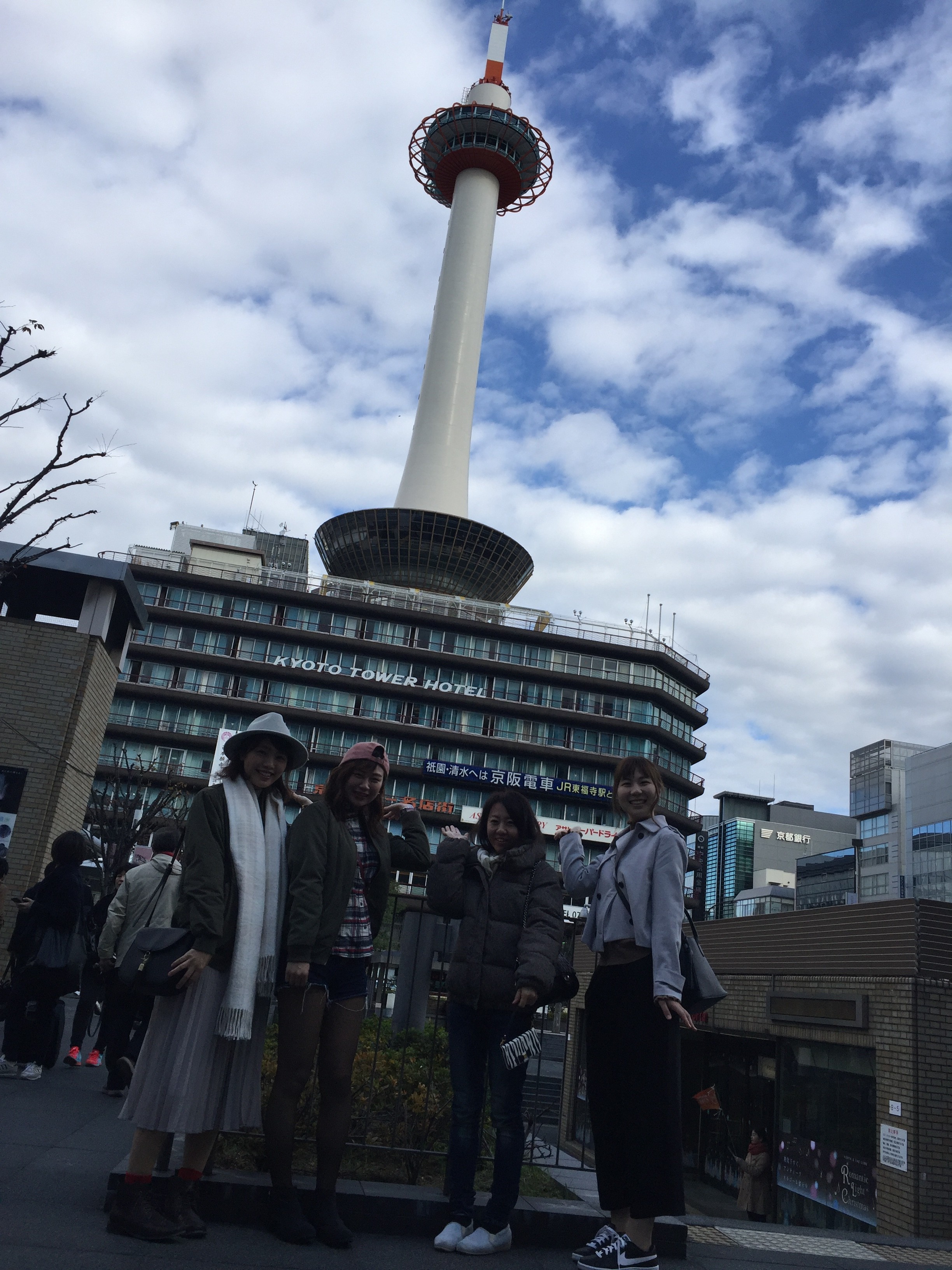 今回の旅行の一つの目的は是非ともスタッフに中村藤吉の抹茶パフェを食べてもらう事です。pm10:00 京都駅前 京都タワーの前でハイポーズ