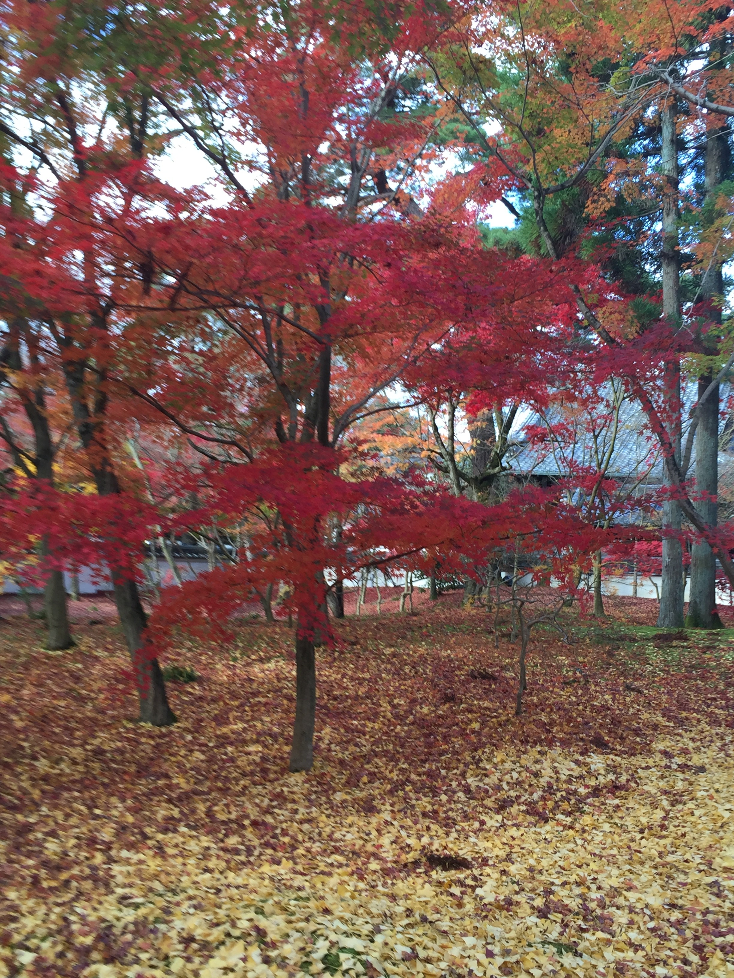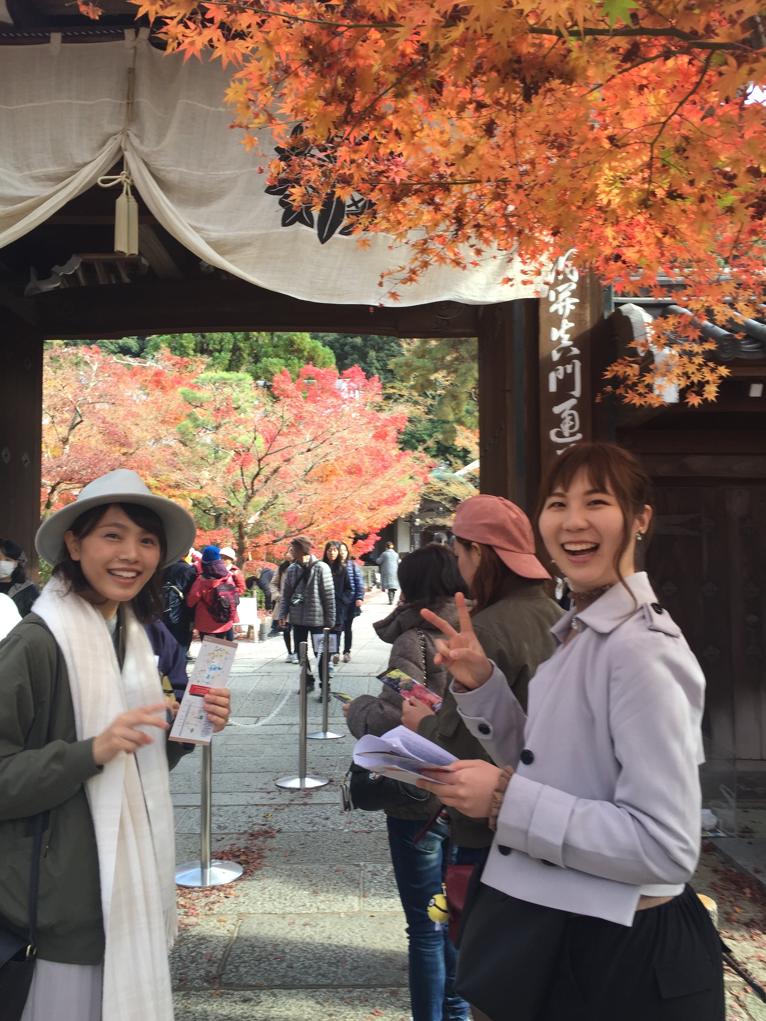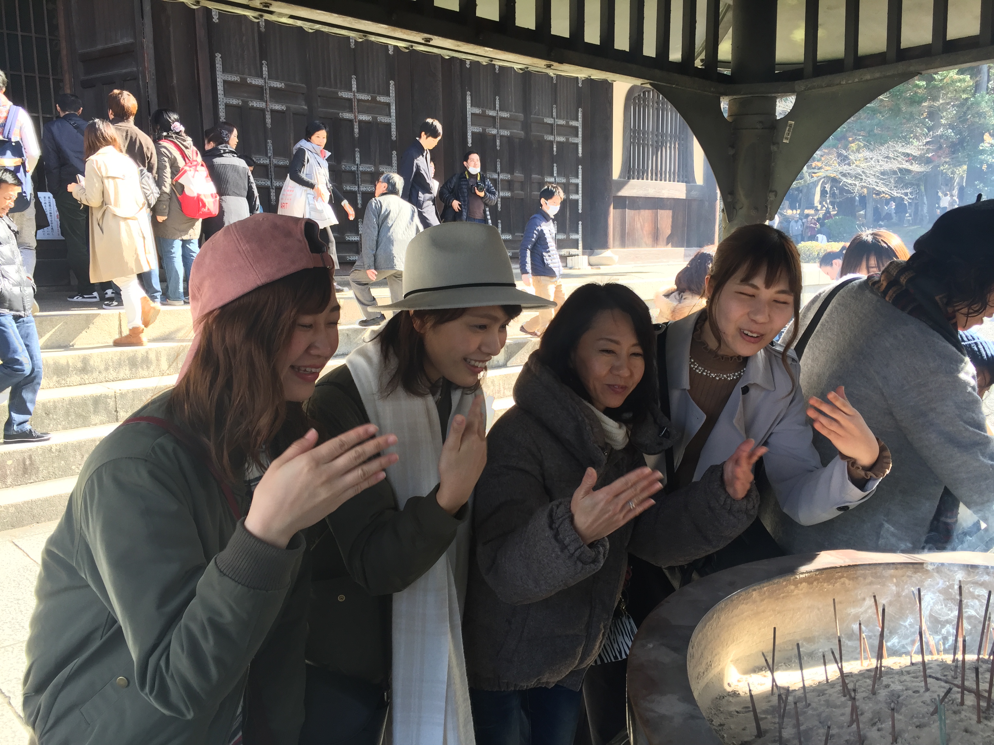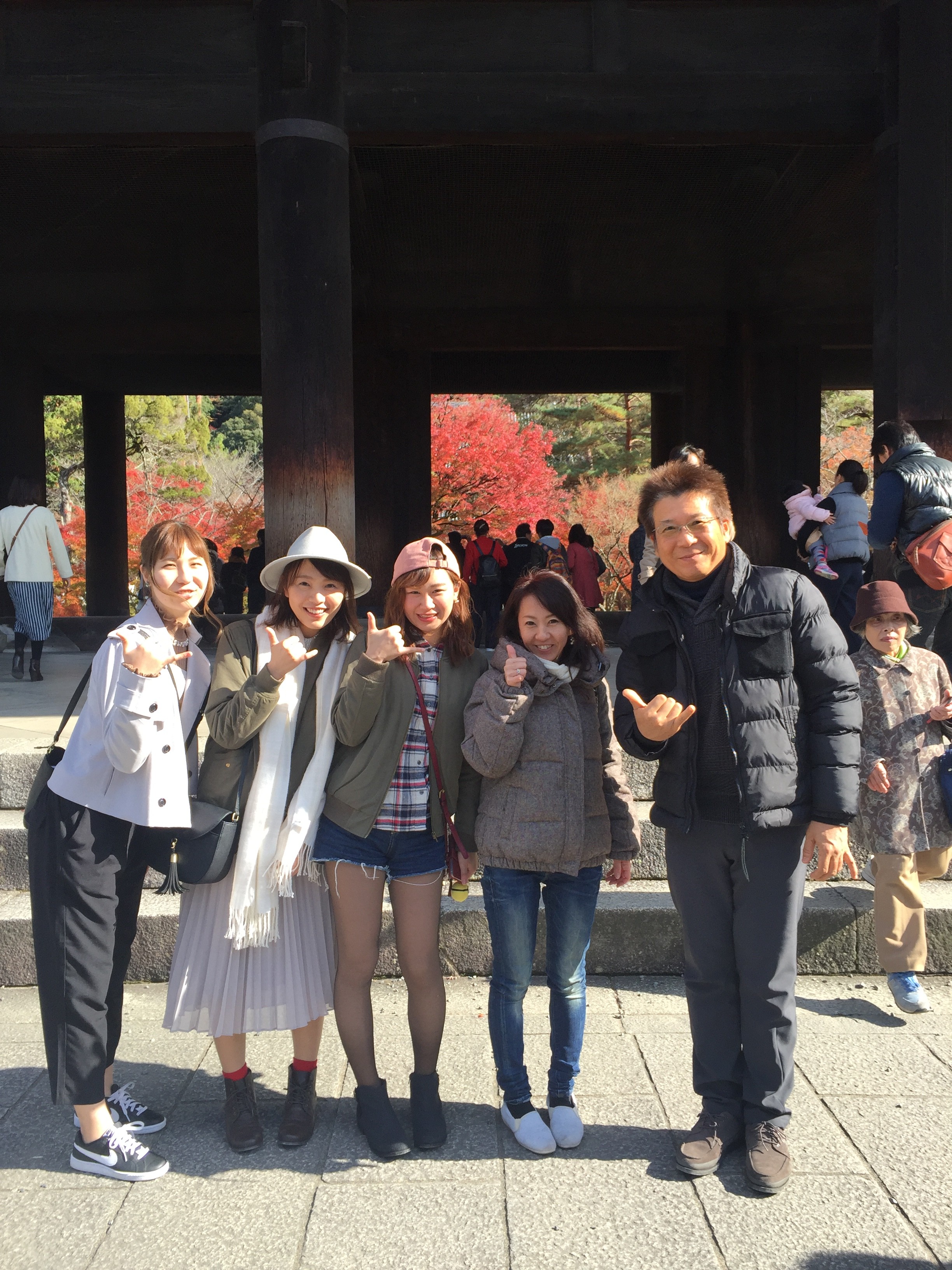 もみじの前で写真を何枚もとりました。線香を供える所ではみんな、いろんなところが良くなる様に煙を浴びました。あまり浴びすぎると燻製になるのではないかと少し心配になりました。イチョウの黄色の葉っぱで遊ぶ若手青春三人娘です。モミジの赤がとても綺麗で何度も感激です