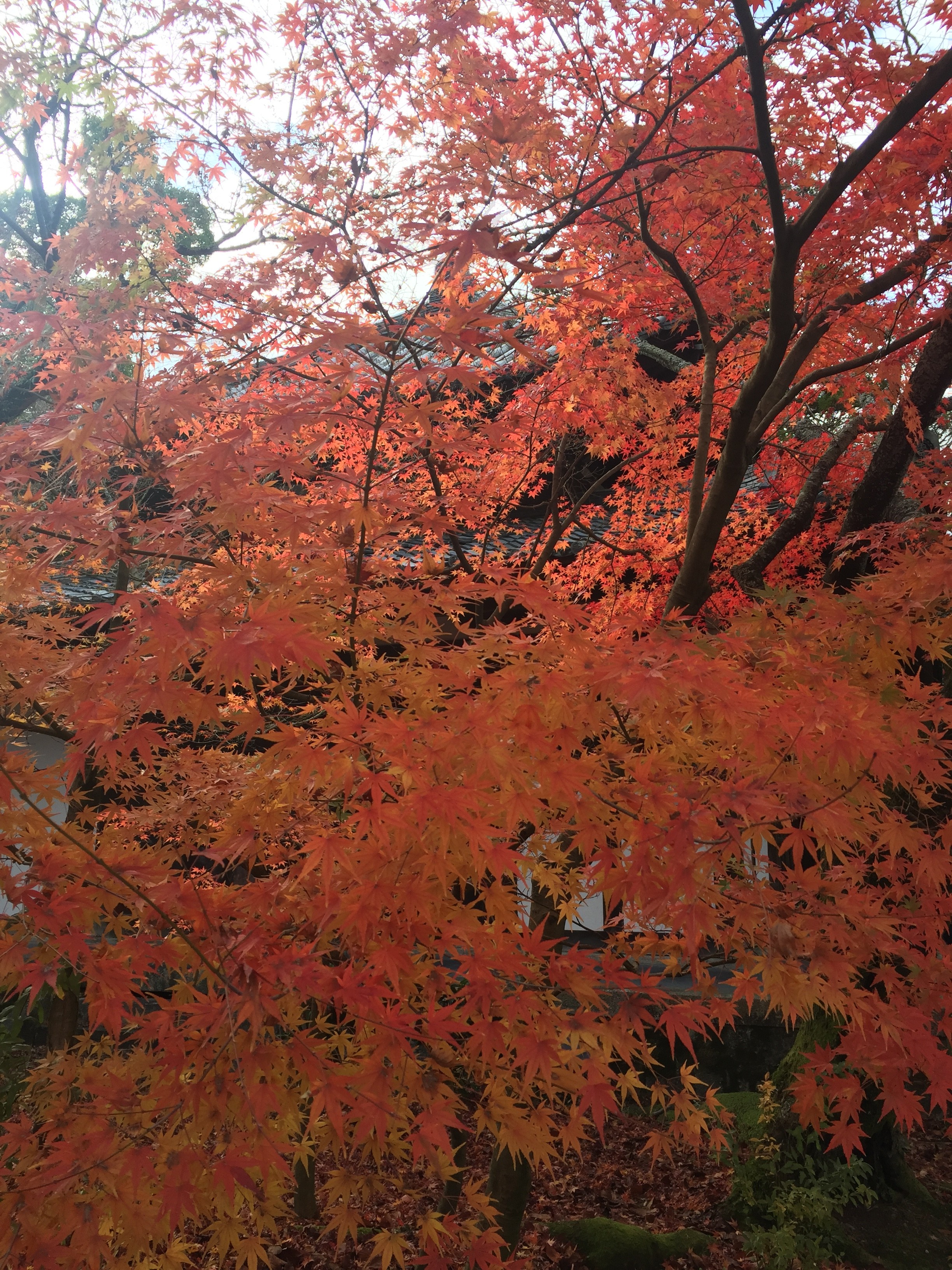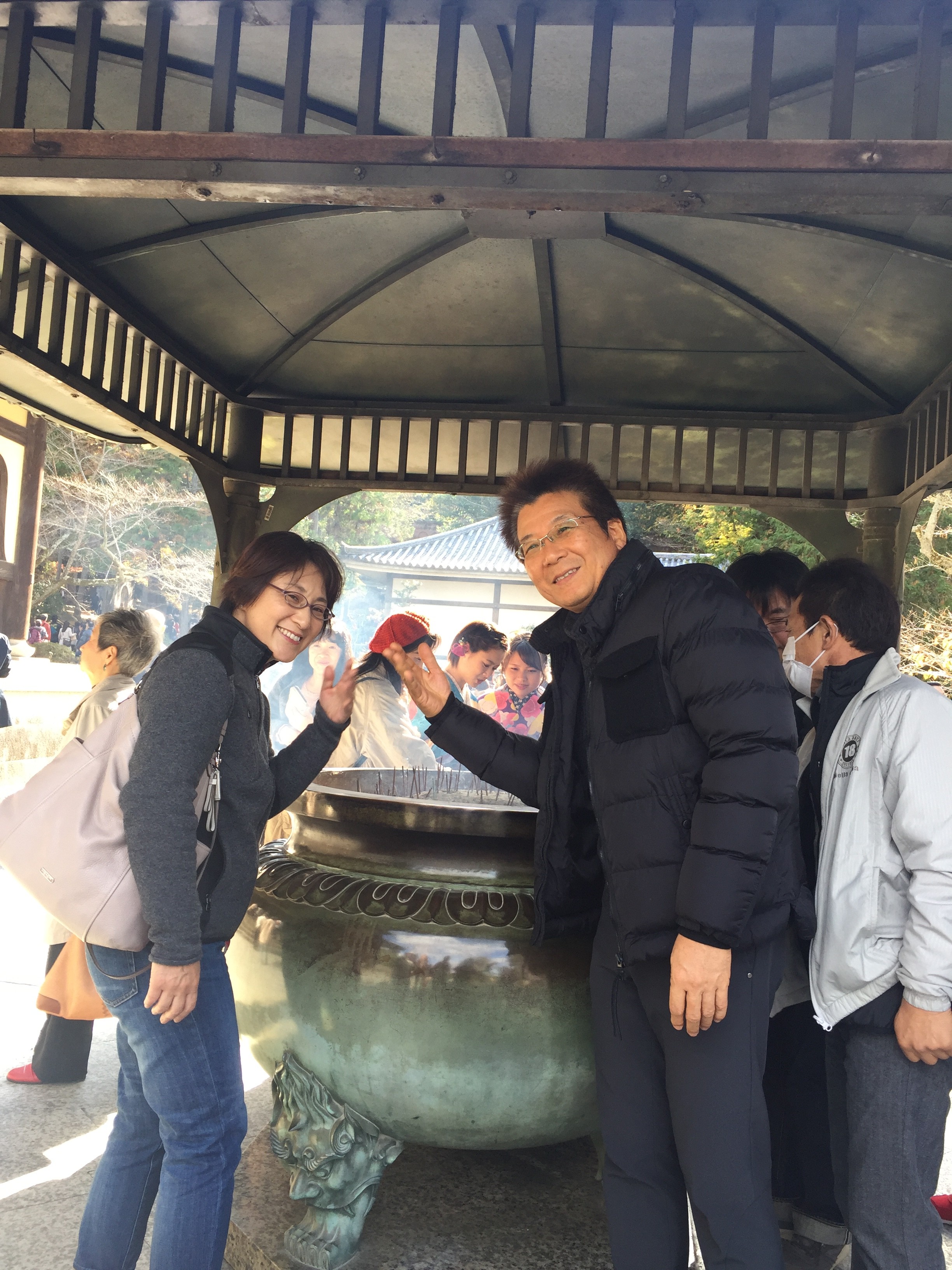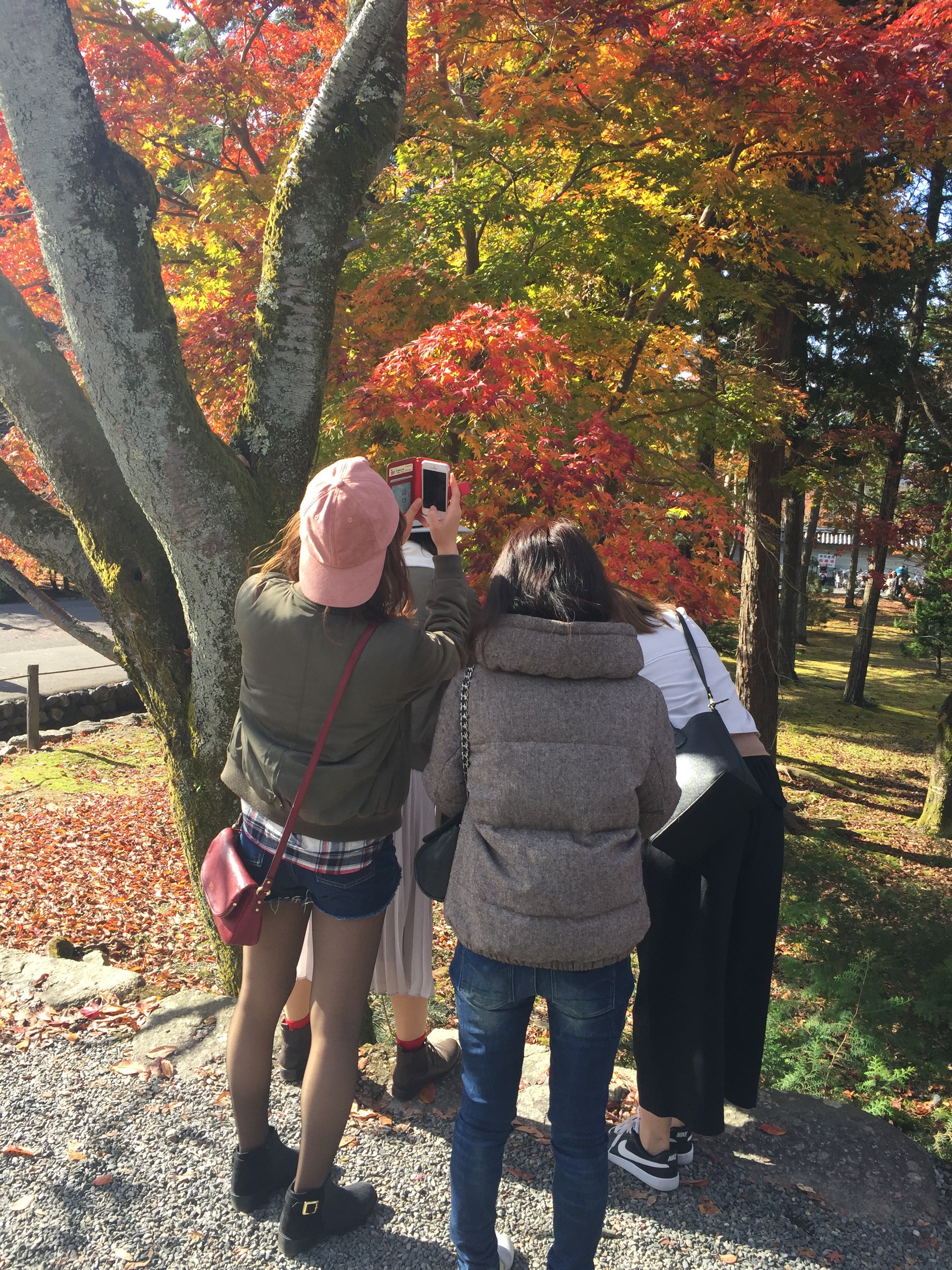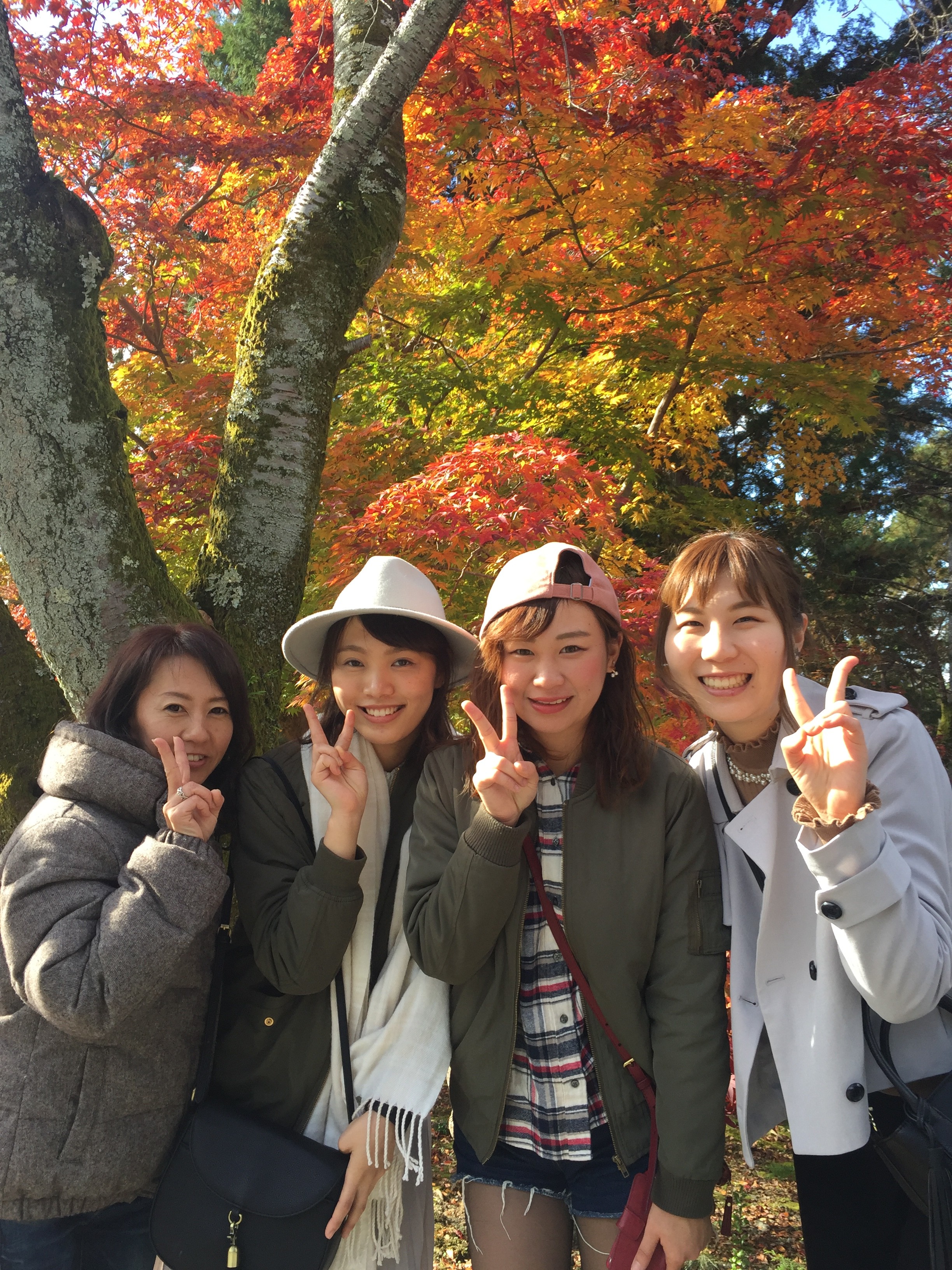 もみじの前で写真を何枚もとりました。線香を供える所ではみんな、いろんなところが良くなる様に煙を浴びました。あまり浴びすぎると燻製になるのではないかと少し心配になりました。イチョウの黄色の葉っぱで遊ぶ若手青春三人娘です。モミジの赤がとても綺麗で何度も感激です
