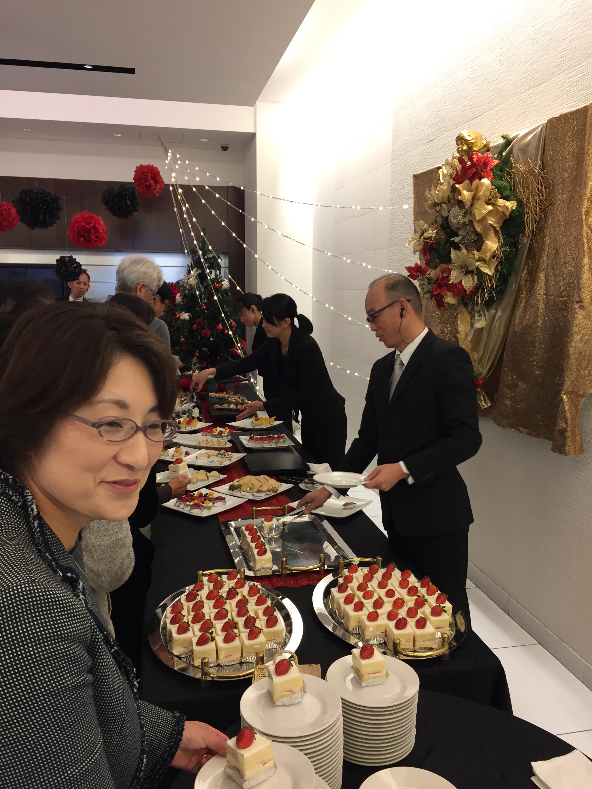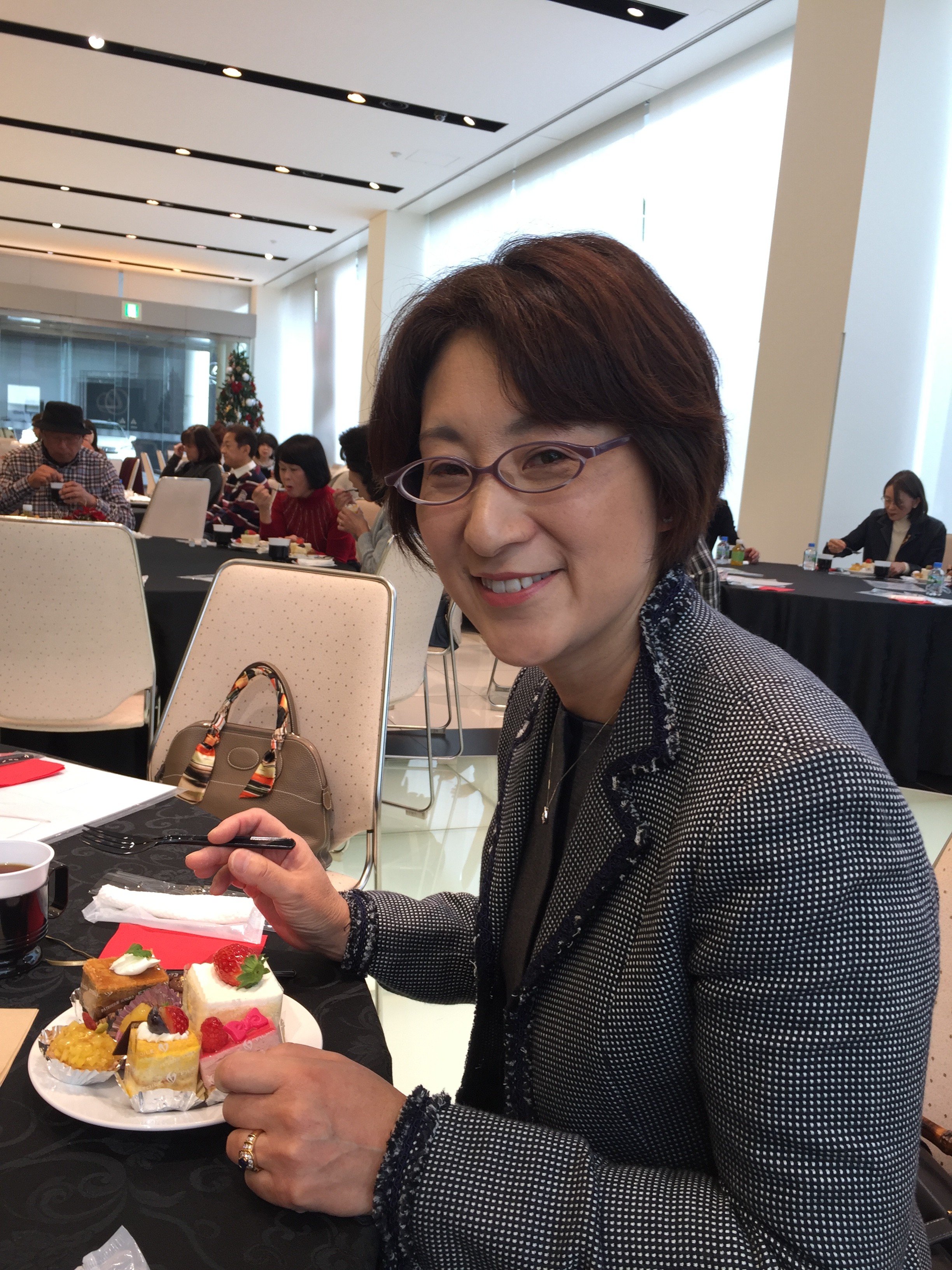 今日は、車屋さんの主催の少し早いクリスマスイベントに行ってきました。ケーキバイキングがあるという事で、先着順の電話予約を嫁さんに頑張ってもらい幸運にもゲットできました。13:30から元ラッツアンドスターのトランペッターの桑野信義さんのミニライブが始まるまでの間にケーキバイキング(食べ放題)がありました。12:30受付で1時間の間が勝負?です。先にイチゴのショートケーキが乗っている皿を渡され給仕役の方に、欲しいケーキを頼むのですが、あれもこれも注文すると、あっと言う間に皿の上はラッシュアワーになってしまいました。第一陣はこれくらいにして、コーヒーをもらい席に着きました。