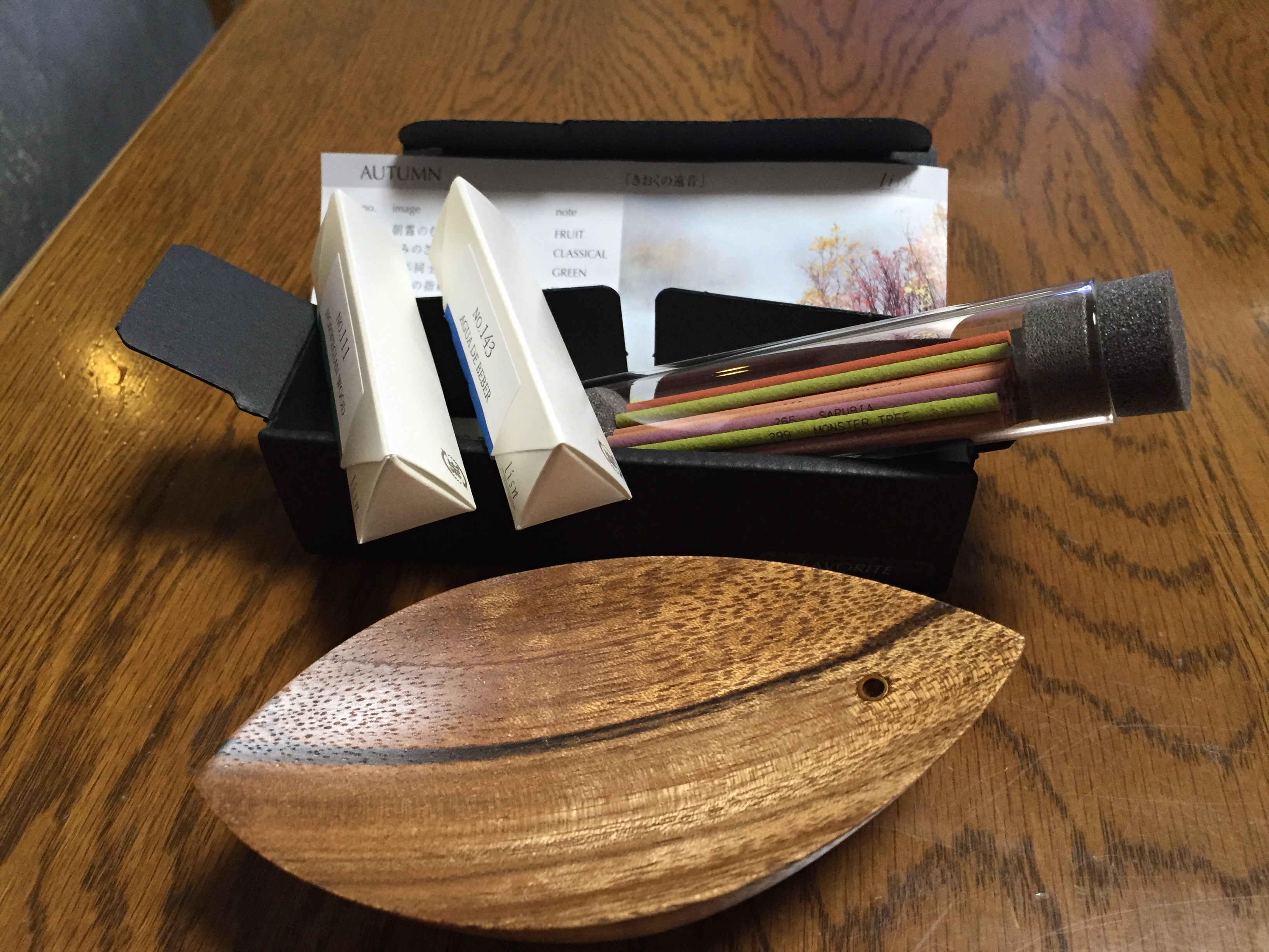 同じビルの中に、lisn京都という”お香”のおしゃれな店がありました。以前からアロマテラピーに関心があった私は、展示されてるいろんな香りを試しました。おじさんが無心に匂いを嗅いでいる姿は、奇妙に見えたのでしょうか、店員さんは遠巻きに見てました。勇気を出して質問をしてみると、丁寧に説明してくれました。そして、香りにもそのイメージをネーミングしてあるのです。フルーツの香りのあるものには”朝霧のむこうから"スパイシーなものには”誰もいないグランド”など、面白いと思いませんか。1日の疲れを取るため睡眠前のリラックスタイムを充実したものとするべく、”お香セット"を、お小遣いで買いました。