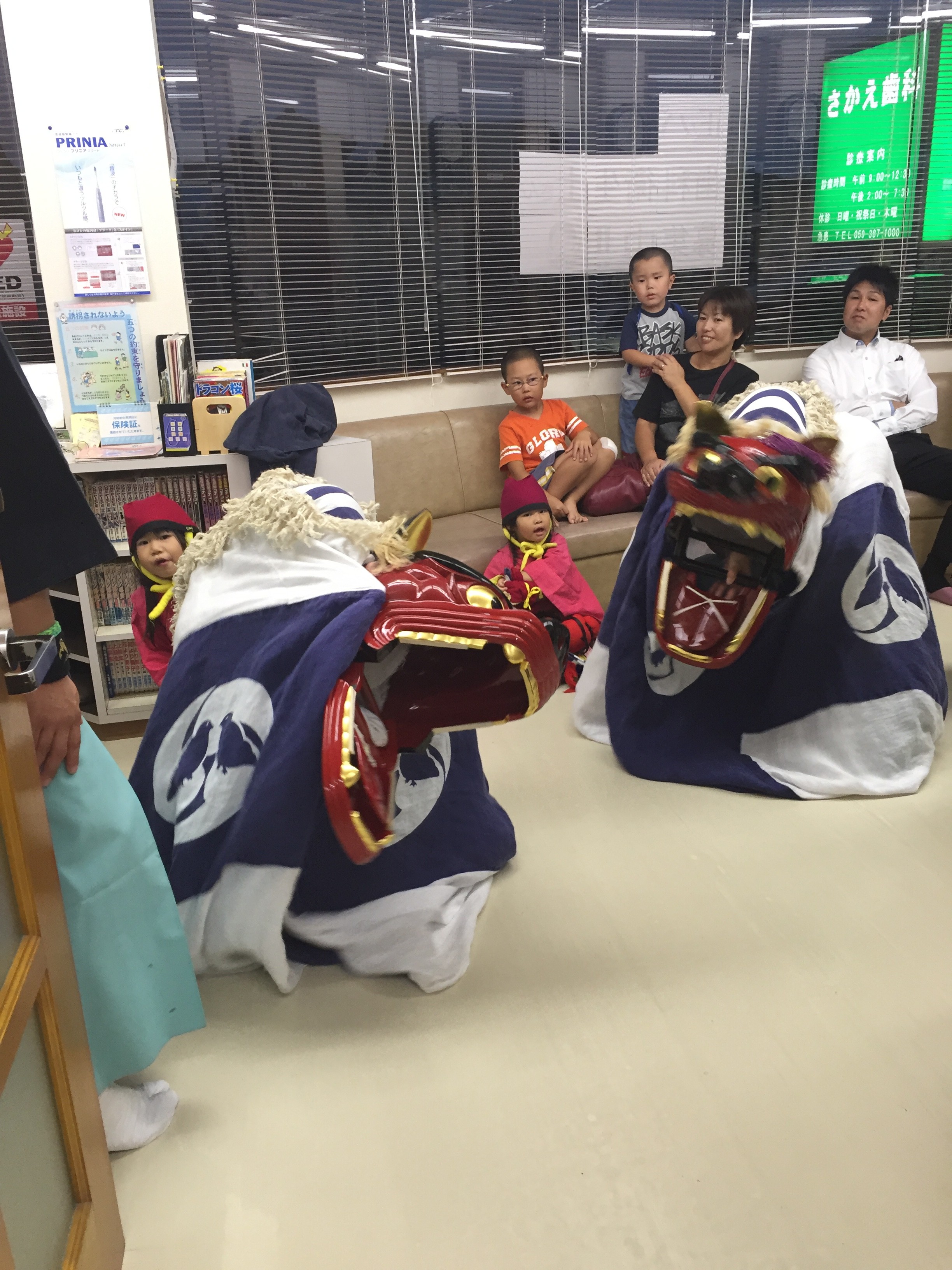 今年も、江島若宮神社の獅子舞がやって来ました。秋祭りのこの頃に、年に一度お獅子が定期検診にやって来ます。笛の音色とともに二頭の御兄弟のお獅子が玄関から入って来られました。待合室にみえた子供たちは、突然の遭遇に少しビビっていました。診察を一時中断してみんなで獅子舞を鑑賞しました。開院してから毎年来てもらってるので30年近くのお付き合いになりますが、お獅子さんはいつも元気で年齢による衰えのかけらも全く見られませんでした。歯に関しては初めて来院された時からの全て金歯は特に異常所見は認められず、噛み合わせも「カチ、カチ。」と大きな音が出るので心配?はないようです。また、すごく大きく口が開けられる(120°くらい)ので開口障害も無く顎関節症の疑いも有りません。歯医者に来るのが楽しいのか待合室で大はしゃぎで踊っていました。ただ、見た目がかなりインパクトがあったので、歯医者がニガテな女の子は私の背中の後ろで隠れていました。私としては、私を頼ってくれて少し嬉しかったけどね。少し肌寒い風が入って来る中、お獅子さんの来院でほんのりと、暖かい空気にさかえ歯科が包まれた様な気がしました。縁起物のお獅子が来てくれたのできっと、いい事があります。江島獅子舞保存会の皆さんありがとうございます。伝統芸能保存の為、頑張ってください。