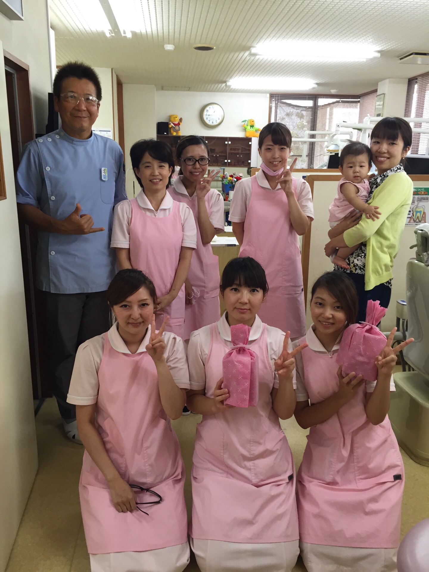 さかえ歯科OGが治療に可愛いジュニアと一緒に来てくれました。うちに勤めていた時にはお腹の中にいたのですが、なんか不思議な感じがします。わかるのかな?あまりにも可愛いので、ちょっかいをかけ過ぎたら泣いてしまいました。私の大きな顔は、かなり刺激が強すぎた様です。久しぶりにスタッフと、20何年後の新人スタッフとで記念写真です。我が孫の様に、目を細めて見ています。