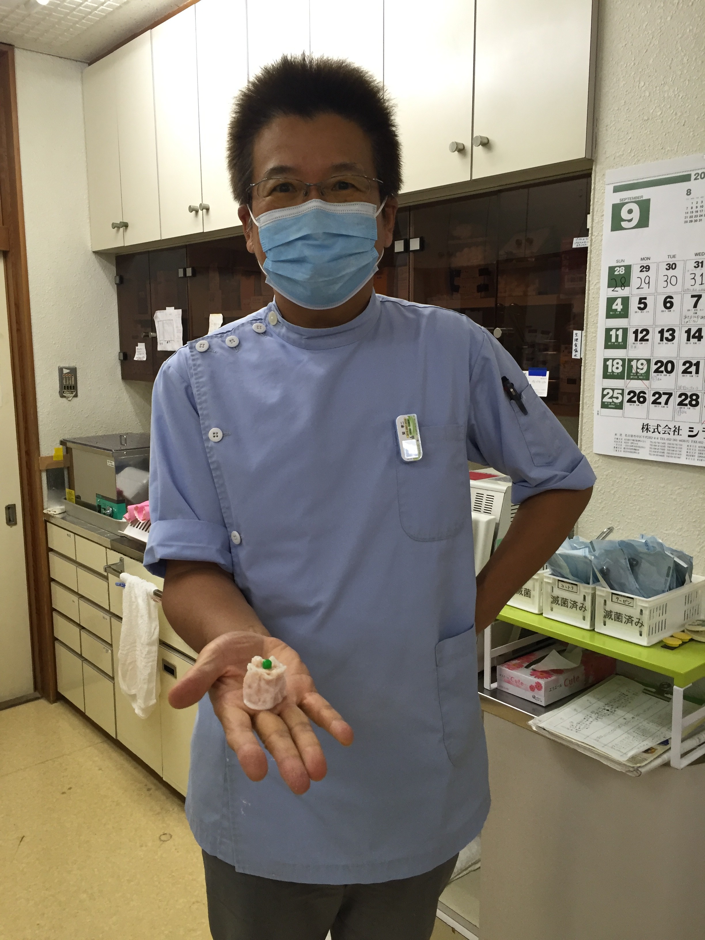 小さいお子さんが治療出来たら、ご褒美に手品をしてあげてるのですが、こんな事がありました。さかえ歯科にきてる人なら知っている方も多い手品なのですが、ティッシュでグリンピースを包んでシュウマイを作る手品があるのですが、見てもらった子供さんに「おウチに帰ったら、グリンピースをティッシュで包んで、シュウマイなれシュウマイなれとお願いしてみ、10回に一回シュウマイになるよ」と、言うのですが、今日、お母さんから結果報告がありました。グリンピースではなく消しゴムを小さく切って緑に塗り、息子さんがティッシュで包ん、やってみたそうです。・・・・できなかったそうです。お子さんのやってみたい、と言う事に付き合ってくれるお母さんは素晴らしいと思いました。シュウマイにならなかったのは、きっと気合いの入れ方がたりなかっかなぁ。
