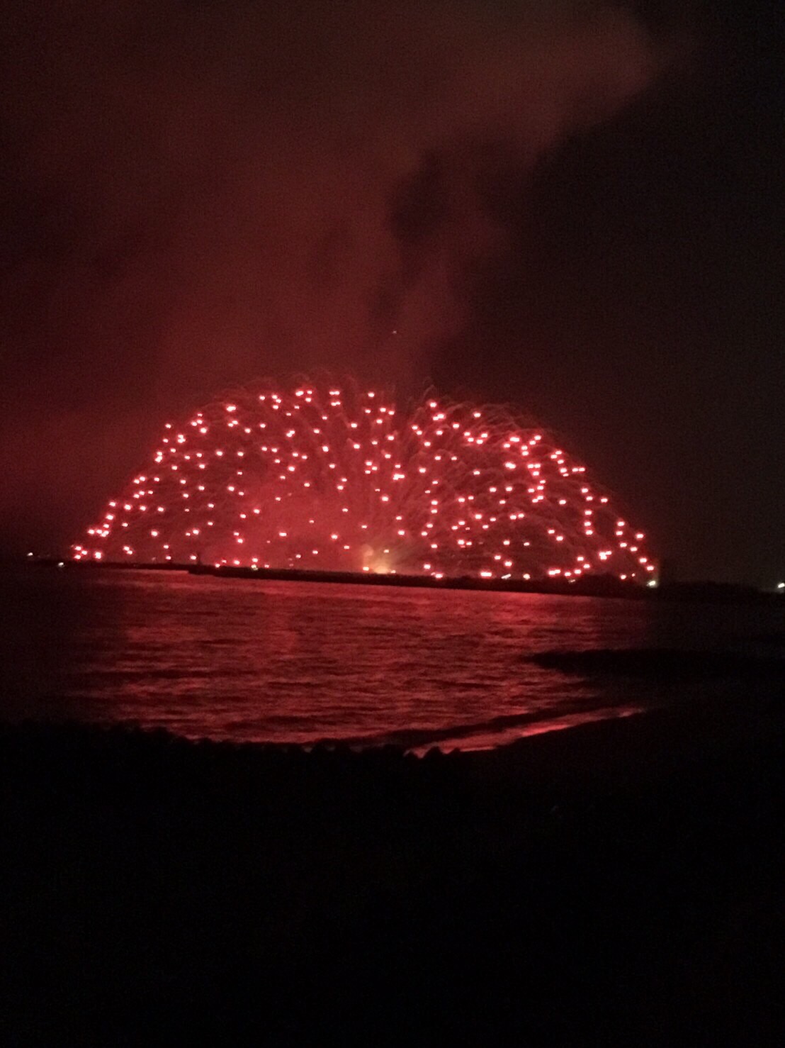 患者さんがみえて、レントゲン撮影し、状態と治療の説明をして、下の奥歯の神経を取る処置をしました。治療後の注意をし、薬を出しました。治療中も花火の音は聞こえてました。時すでに、20:00。プログラムでは21:00まで花火と書いてあったと思います。即、着替え、白子の海岸まで走りました。リオオリンピック陸上男子400メートルリレー銀メダルジャパンのつもりで走りました。建て物の間から断片的に見える花火を見ながら、もっと近くで見るべく走りました。いや、体力の限界で早足になりました。近鉄の地下道を通過してる時に、大音響が”ドォーン!ドォーン!ドォーン!”響き渡りました。まさか!その後の音はありません。急いで堤防に向かいますが、その方向に向かっているのは私だけです。不安的中です。クライマックスの海上自爆花火の音を地下道で聞いたのです。花火の時間は40分間だったみたいです。汗ダクの私は肩を落として帰路につきました。道すがらに、年配の患者さん夫婦に会い一緒に帰りました。事情を説明すると「先生、ええ運動したやんか。そう思おに。来年もあるし。」と、言ってくれました。家に着くと嫁さんが、「患者さん、痛みなくなって喜んでたから良かったに。」と励ましてくれました。そうですよね、私の仕事ですから。と思うのですが・・・・ちょとでも見たかったなぁ。地下道で花火クライマックスでは。写真は患者さんの松下さんの撮影です。