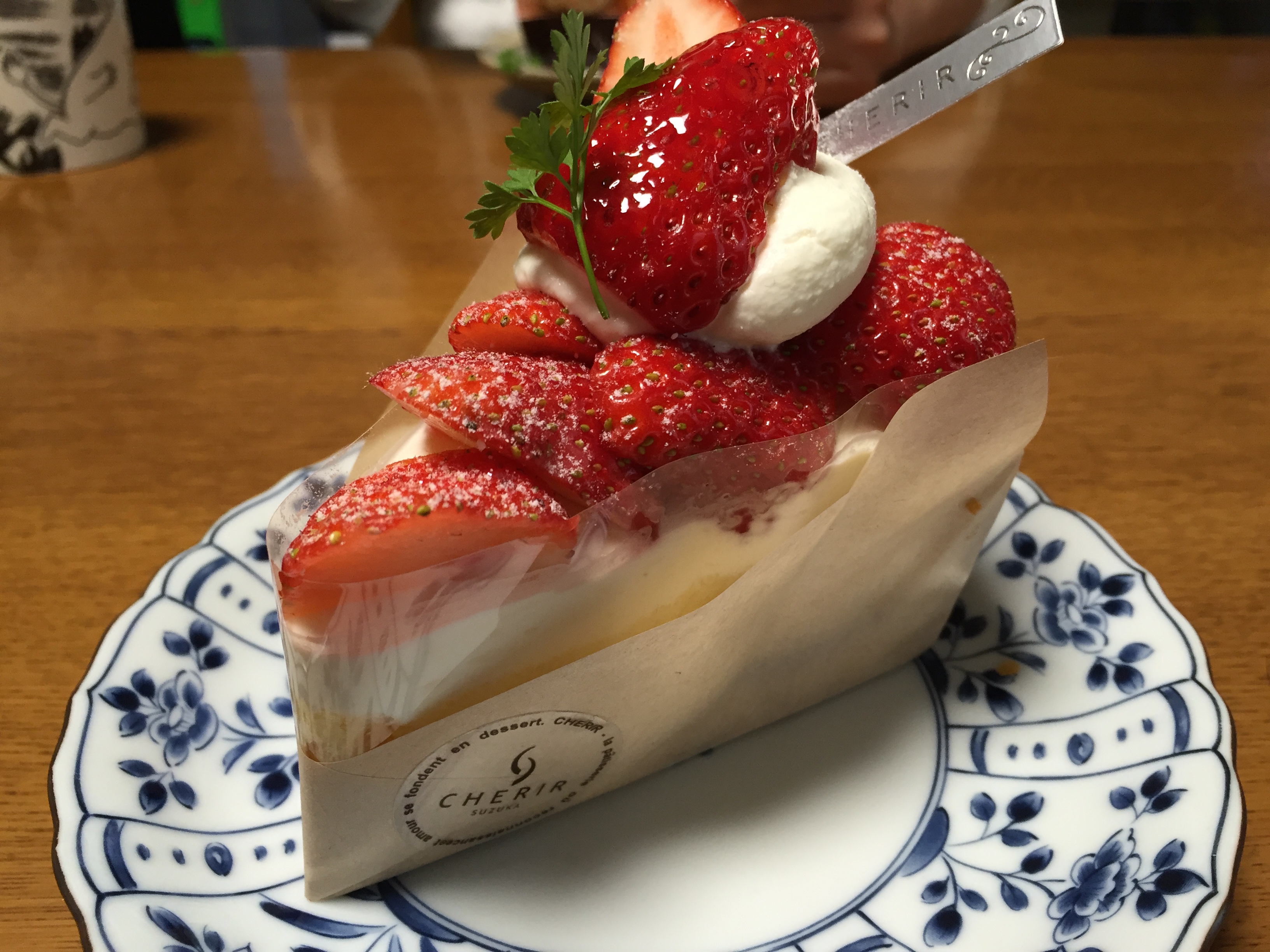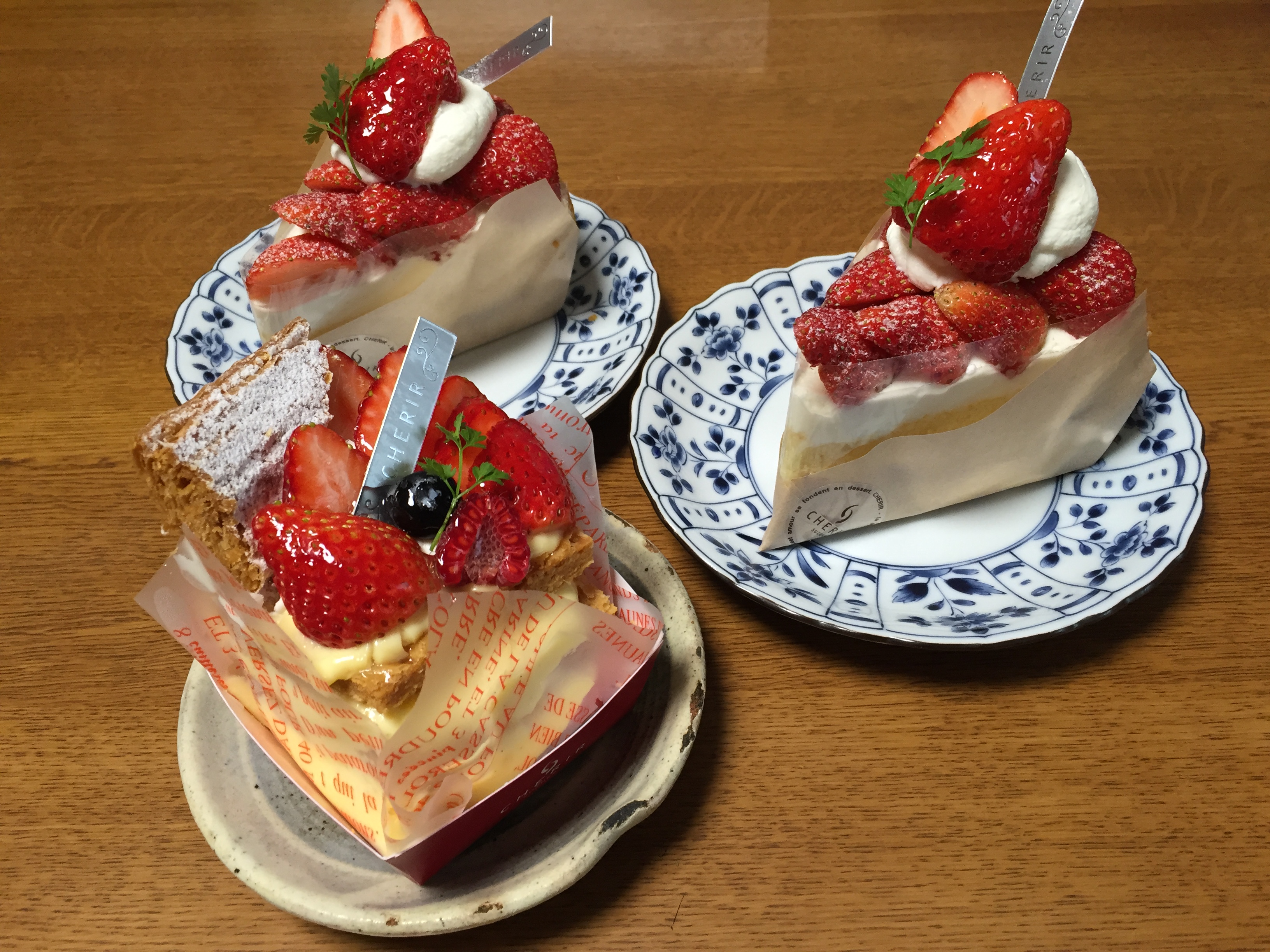 あっという間にゴールデンウィークの三連休の最終日になりました。いろんなことをしたいと考えていましたが、娘とテニスをしたり、庭の芝生の草引きをしたり、小さなイチゴ畑の整備をしたり、ベルシティに映画を見に行ったり、新しい手品を作ったりとのんびりと過ごしました。何かゴールデンウィークの爪痕を残せないかと考えた結果、子供の日の今日、少しリッチにシェリールのケーキを娘と嫁さんとで買いに行きました。子供の日という事で沢山のお客さんが並んでいました。ショーケースの前ではみんなが幸せそうな笑顔です。どれにしようか悩みに悩んだ結果、私と娘はイチゴのタルト、嫁さんはイチゴのミルフィーユを選びました。店員さんに注文しショーケースから出してもらいトレーの上にリフトオン。「この3点でよろしいでしょうか。」と、「はい!」気分は上々です。その時です、コーヒーゼリーが参入してきたのです。「それは何ですか?」「コーヒーゼリーです。」いつもならためらうのですが、今日は覚悟を決めてきてるので「それもください。」最高の子供の日になりました。また太りそうです。
